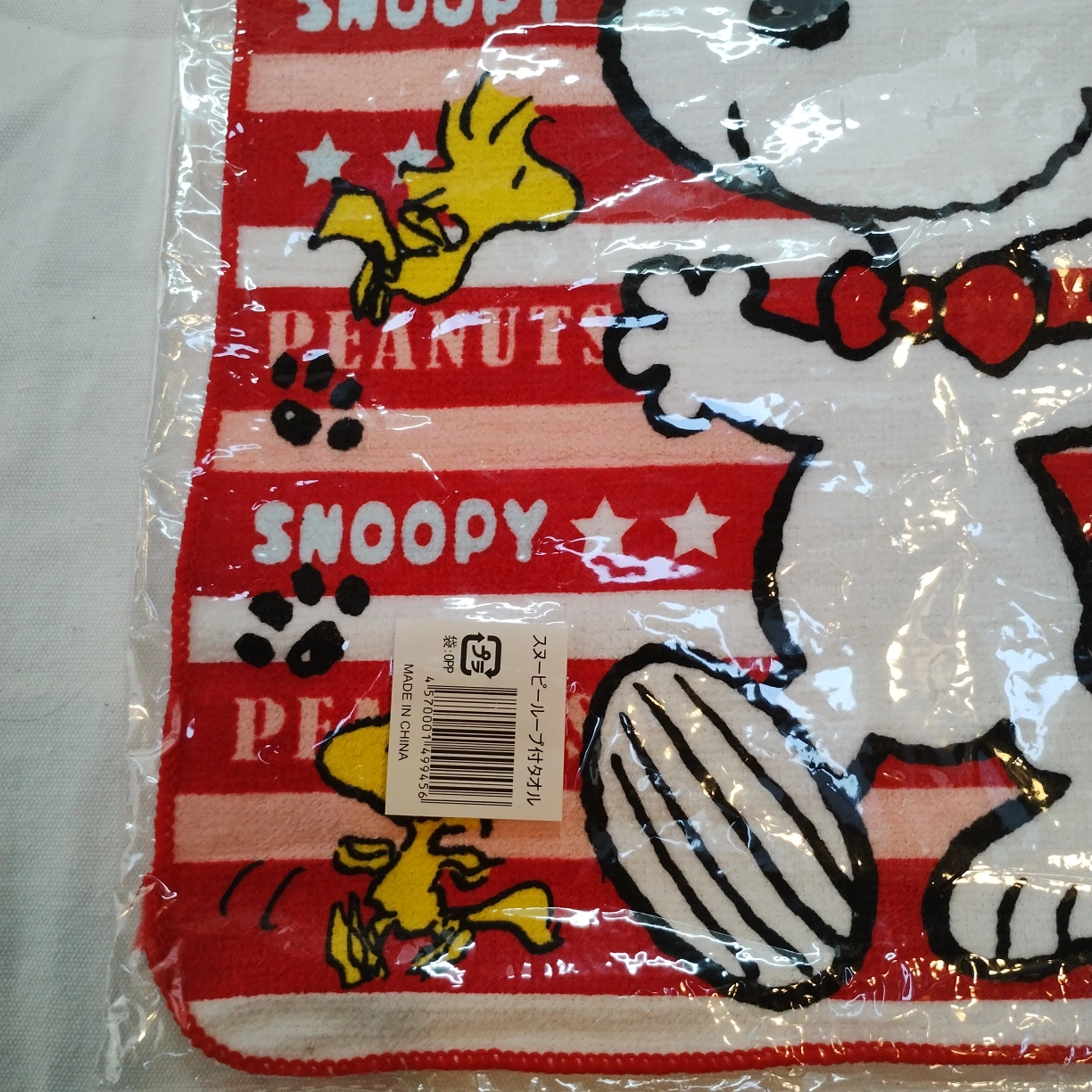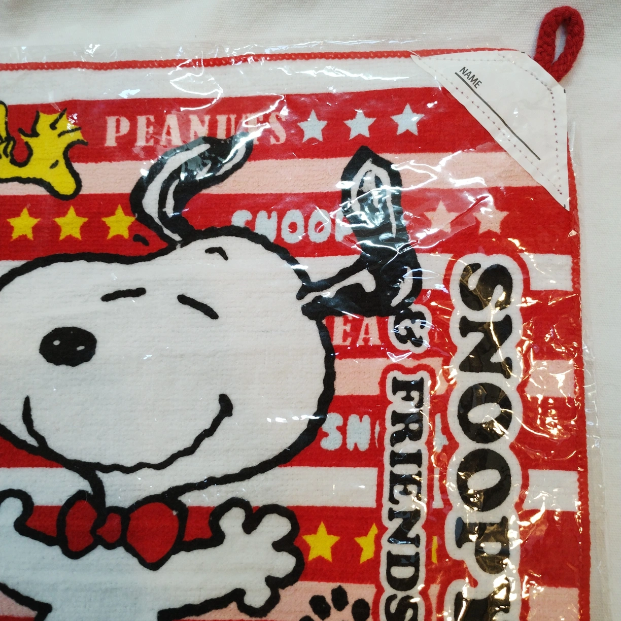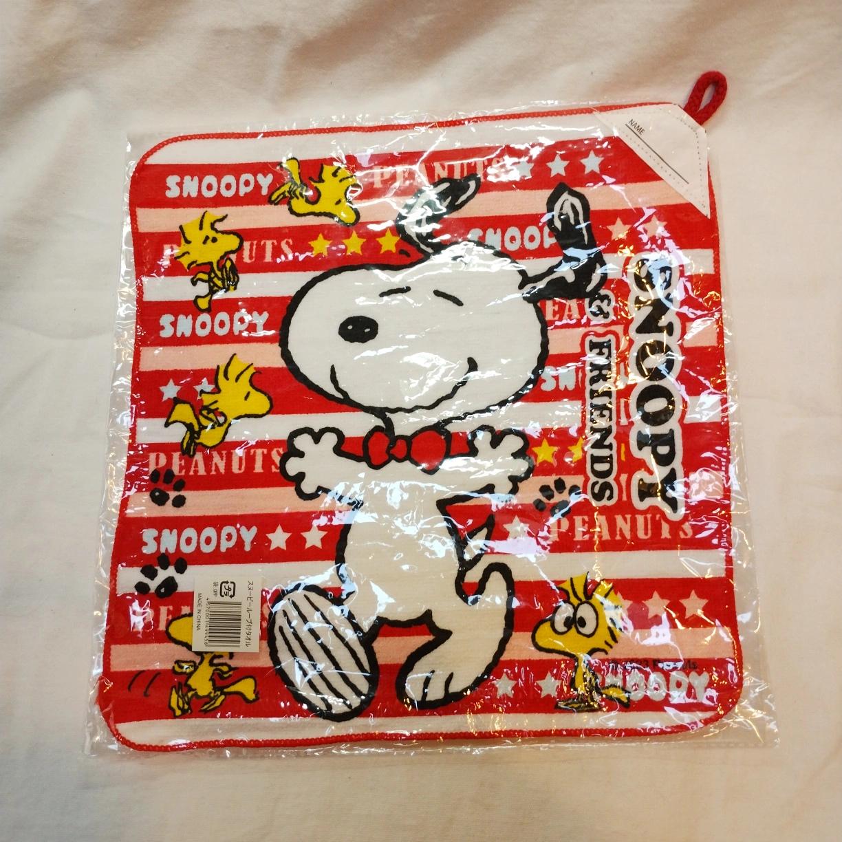 スヌーピーのループ付きタオルの登場です。 #YKOショップ_スヌーピー #YKOショップ_キャラクター #YKOショップ_雑貨 このタオルは、名前が書けるようになっていますので、個人用やプレゼントに最適です。 サイズは30×30センチで、ちょうど良い大きさです。 未使用のまま袋に入っていますので、新品同様の状態でお届けいたします。 このスヌーピーのループ付きタオルは、可愛らしいデザインと実用性を兼ね備えており、使うのが楽しみになることでしょう。 ぜひ、バスタイムやキッチンでの使用にお役立てください!