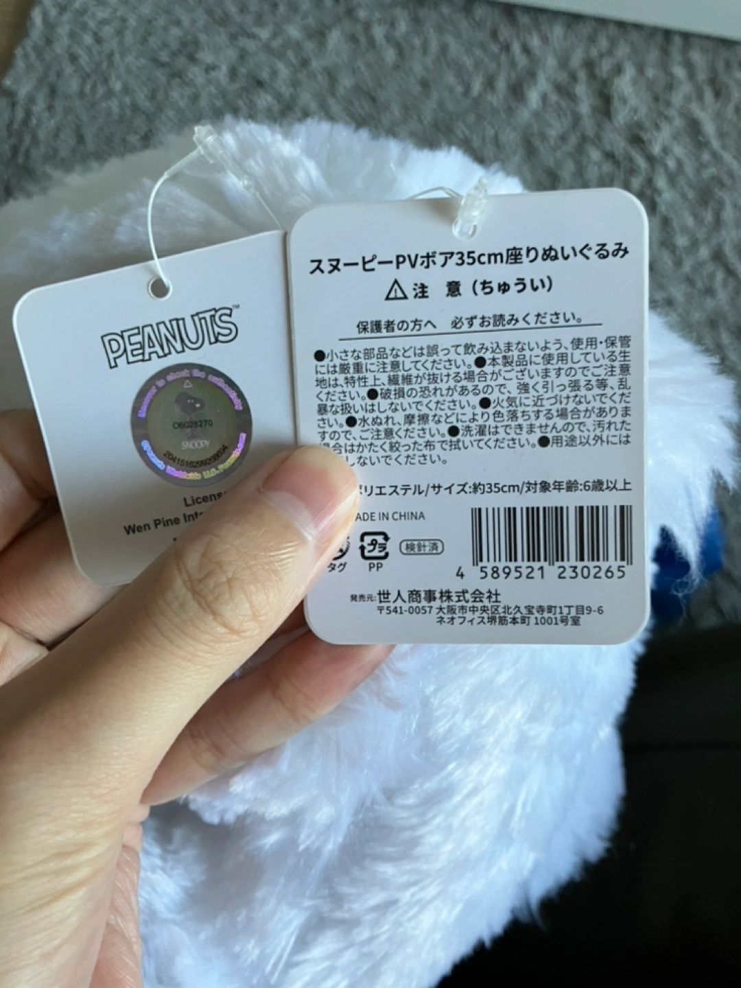 新品タグ付き。 スヌーピーPVボア35cm座りぬいぐるみ プライズ景品です。