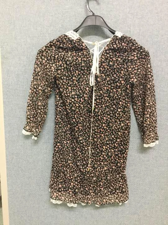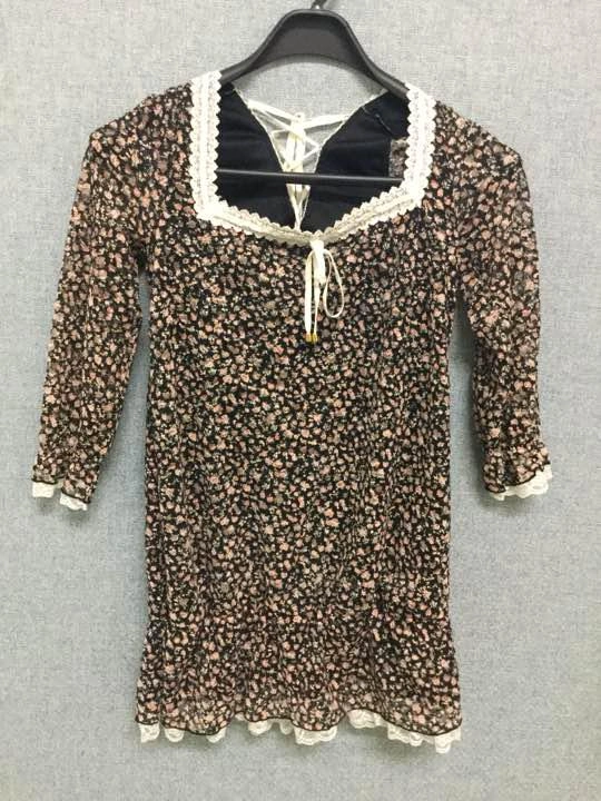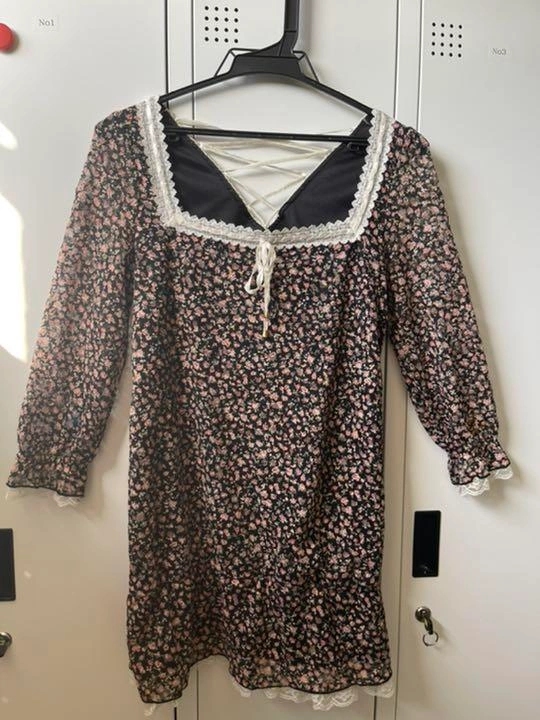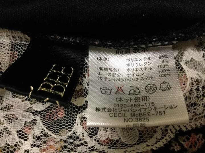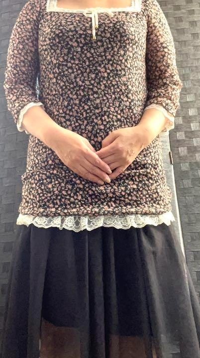 セシルマクビー七分袖の春物チュニックです。 ポリエステル96% ポリウレタン4% レース部分ナイロン100% リボンポリエステル100% 黒地に小さい花束総柄 後ろは背中部分にスリットが入り編み上げのようにリボンでクロス状になっています。 これも、わたしには似合わないのでどなたか気にいる方へ ご希望の方はお気軽にご連絡ください。