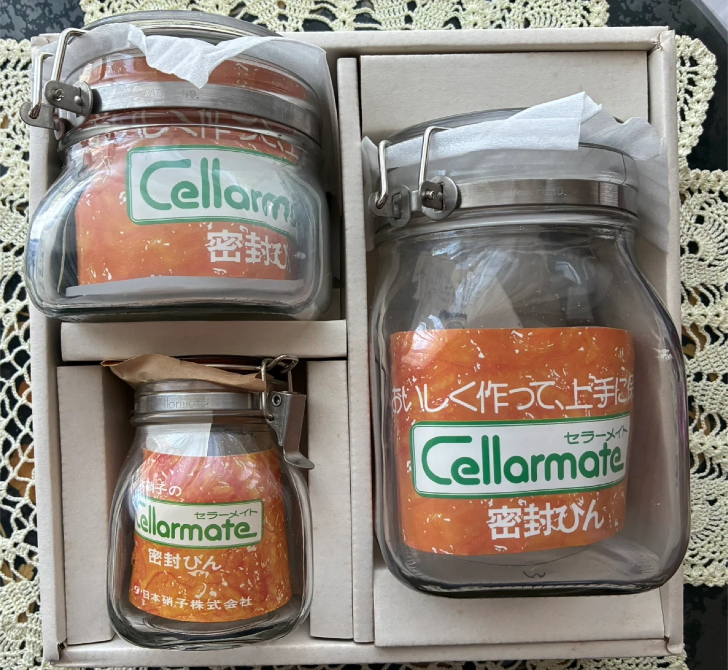 セラーメイトの密封びん3個セットです! 食品の密封ほか、様々な用途にご利用可能かと思います。 【情報】 ブランド:セラーメイト 種類:密封びん 個数:3個 【サイズ】 大 口径約9✖️高さ約16cm 中 口径約9✖️高さ約10cm 小 口径約6✖️高さ約10cm 【状態】 未使用品 箱付き📦 受渡し場所等、お気軽にご相談ください♪ どうぞ宜しくお願いいたします。