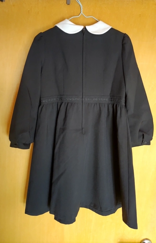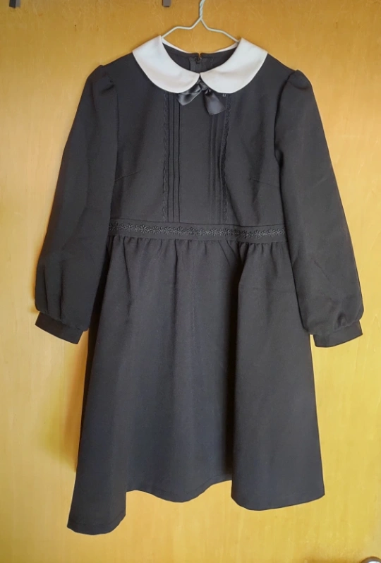 黒のワンピースです。 サイズ:120cm(身長115~125cm) 素材:ポリエステル100% カラー:黒 襟元の黒リボンは取り外し出来ます 【状態】 使用感少なめ 中古品であることご了承ください *受け渡し場所変更可
