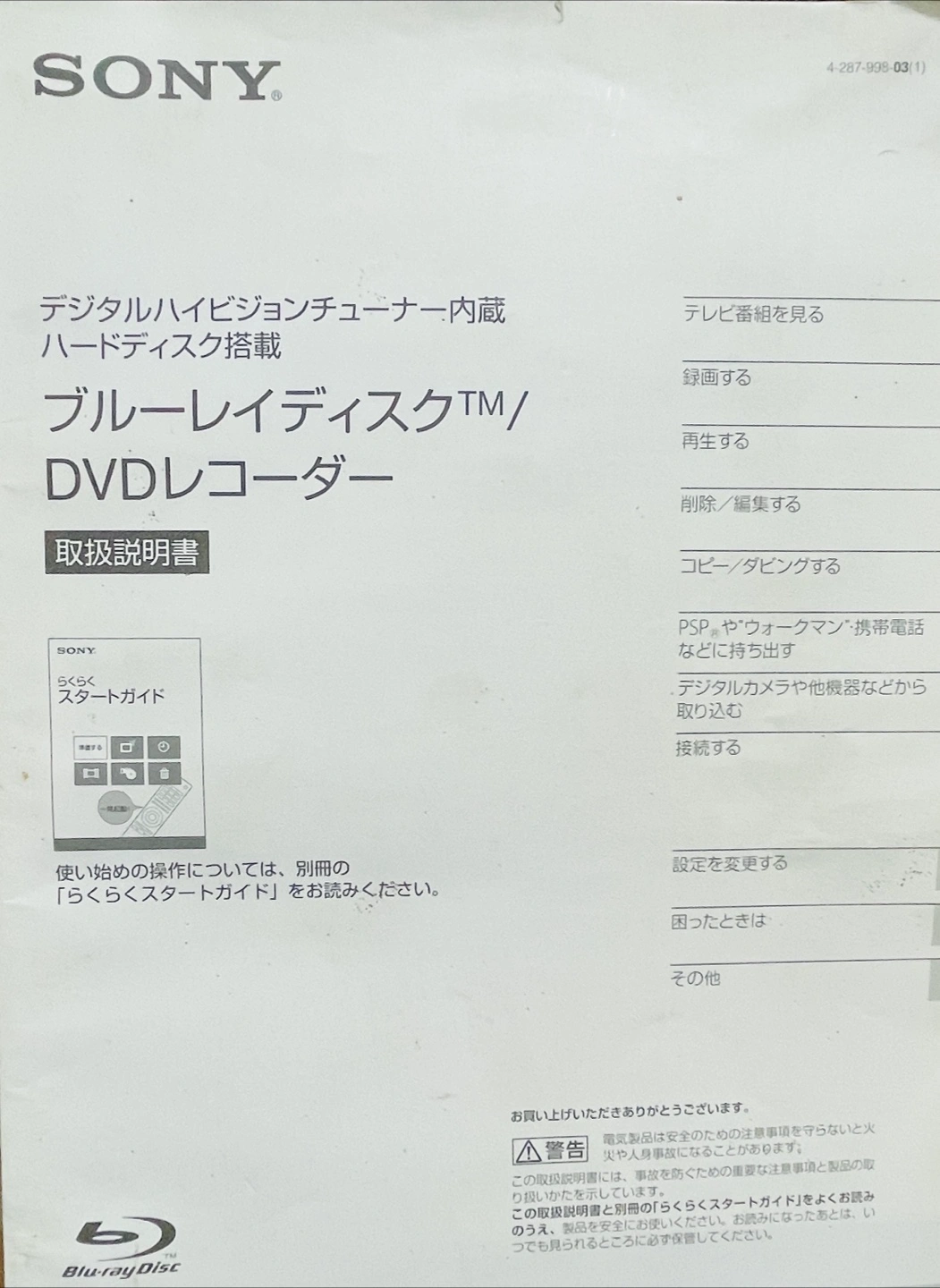 SONY製ブルーレイレコーダー/DVDレコーダー デジタルハイビジョンチューナー内蔵ハードディスク搭載 型番:SONY BDZ-AT350S 2012年 サイズ 幅x高さx奥行 430x49.5x233 mm 重量 2.8kg ハードディスク容量500GB 動作確認済み(リモコン含む) 初期化済み 付属品 B CASカード(譲渡約款付き) 電源コード テレビ接続ケーブル HDMIケーブル 専用リモコン 取 り扱い説明書 相性の良いSONY液晶テレビは別途出品中です。 10年以上前の機種ですが、機能上は全く問題ありませんが、気になる方はご購入をご遠慮ください。 自宅保存による表面の微小の傷や擦れはご容赦ください。 北区中十条まで来て頂ける方のみと取引させていただきます。値引き交渉および梱包は致しません。 埼京線十条駅および京浜東北線東十条駅が最寄り駅ですが、駅でのお取り引きには応じません。指定場所でのお取り引きとなります。 以上、よろしくお願い致します。