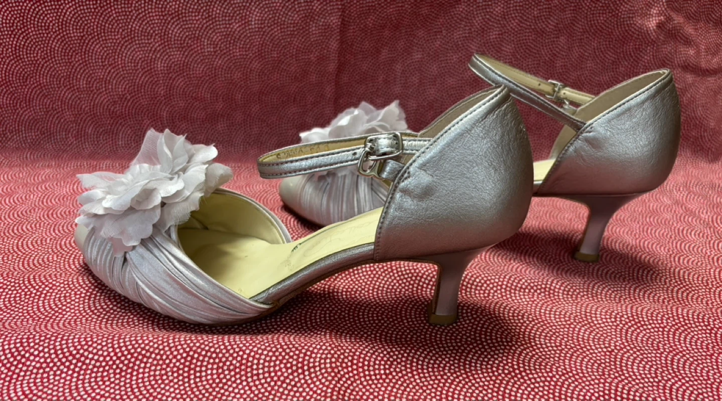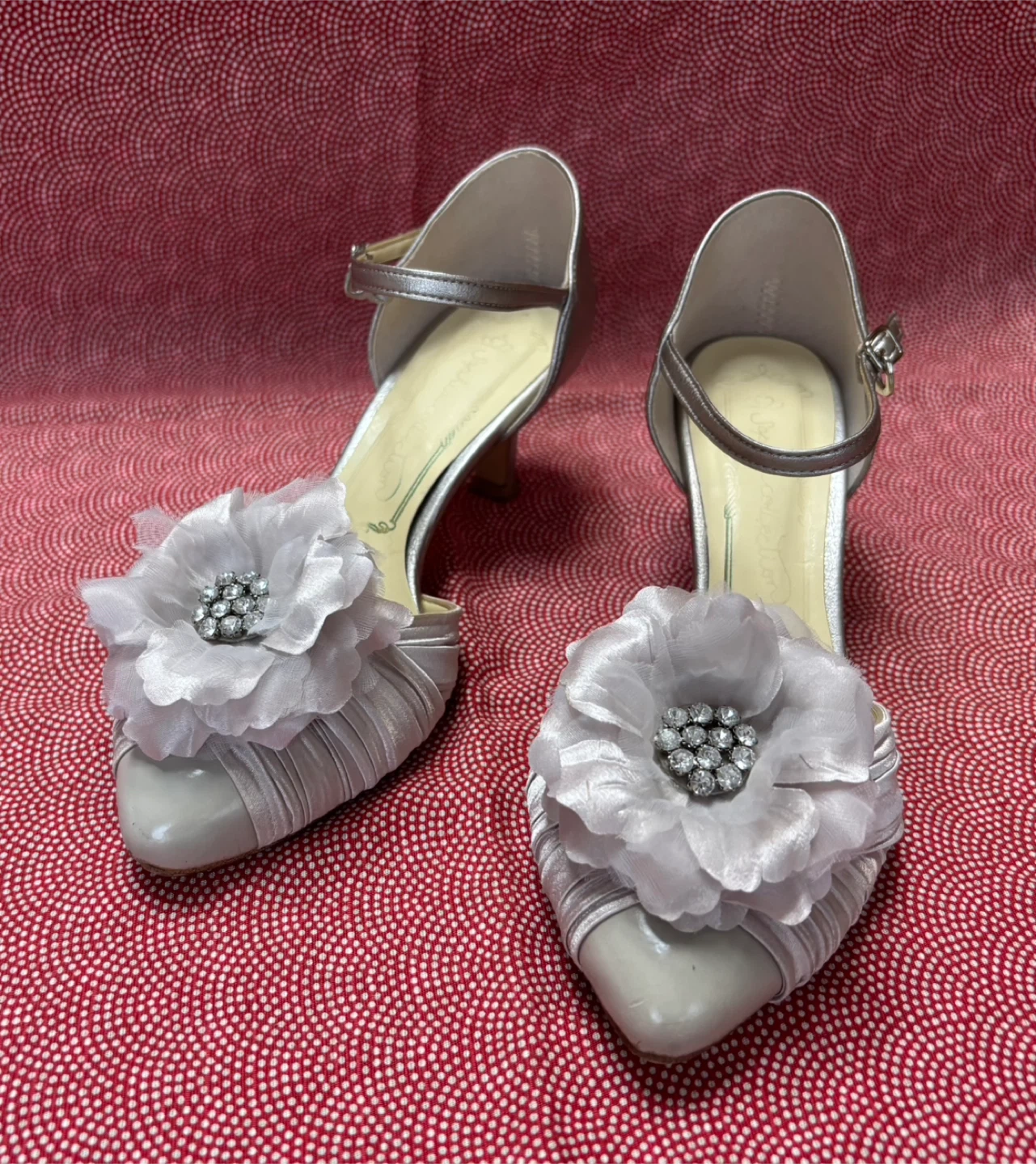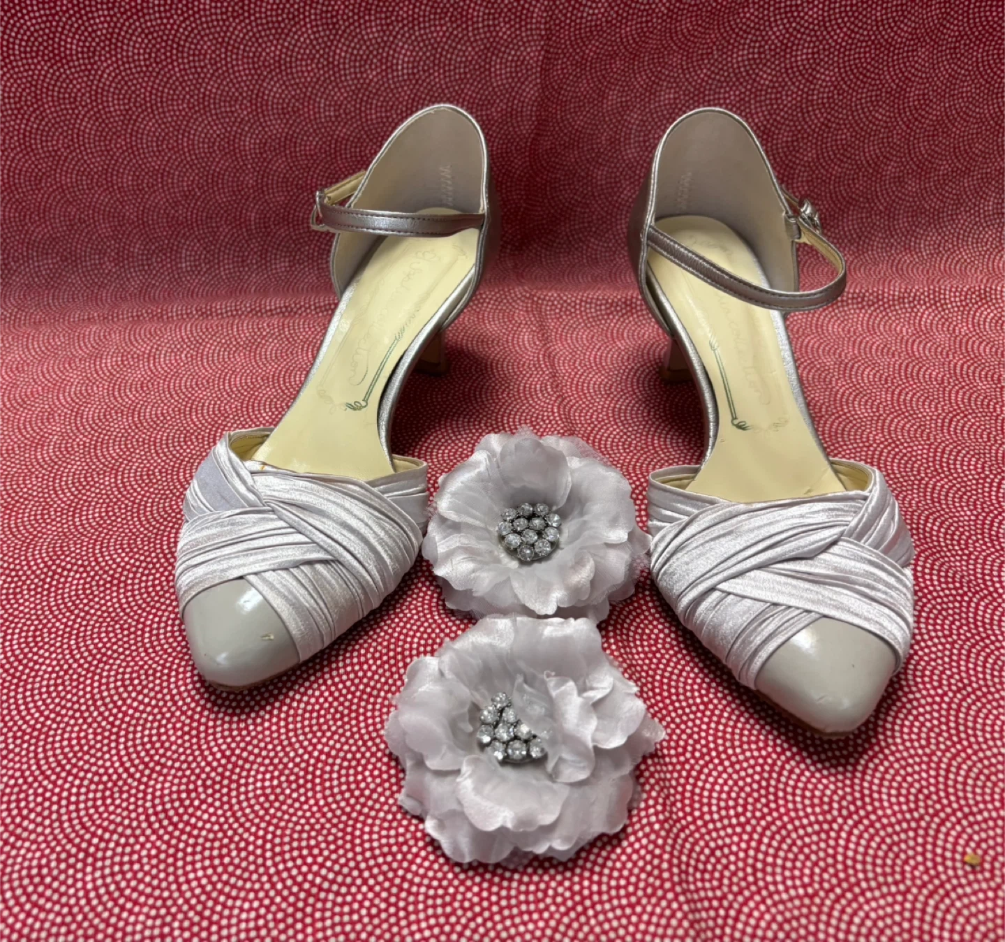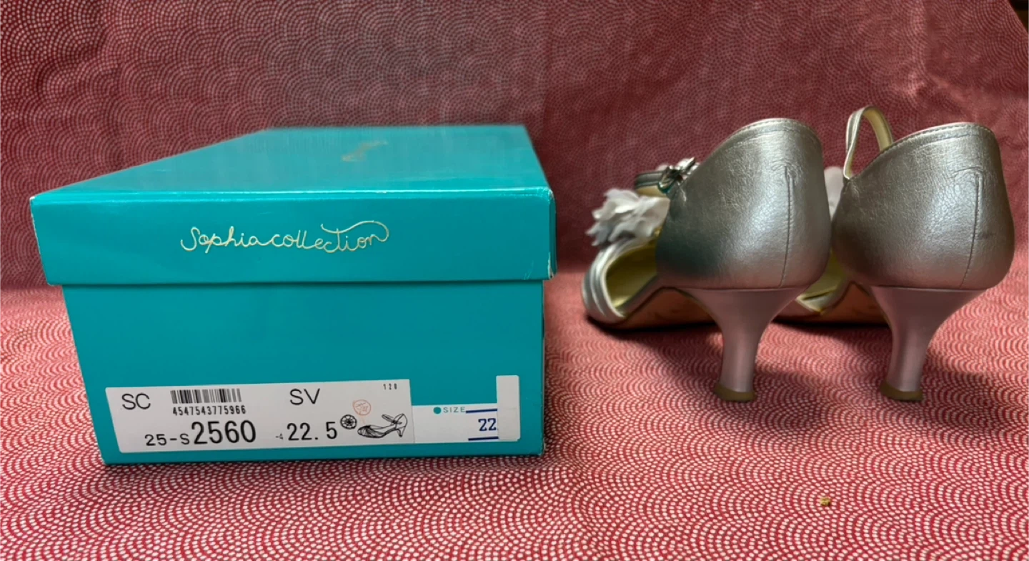 ソフィアコレクションのパーティシューズ、5cmヒールのパンプスです ・ブランド:ソフィアコレクション ・サイズ:22.5cm ・ヒール高さ:5cm ・色:シルバー ・付属品:取り外しできる花飾り、箱 ・状態:数回使用、目立つキズなし 結婚式などで数回使用し、箱に入れてクローゼットに保管していた美品です。 パーティやお友だちの結婚式にどうぞ。 中古品であること、素人採寸のため誤差があることをご了承ください