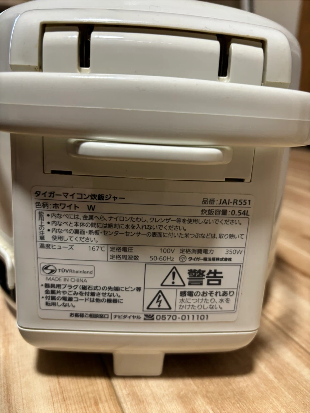 【動作確認済み】タイガーの炊飯器 【情報】 ブランド:タイガー 型番:JAI-R551 炊飯容量:0.54L カラー:ホワイト 年製:2017年 【状態】 使用感あり 中古品であることご了承ください。 動作に問題はございませんので、ご使用いただけます。