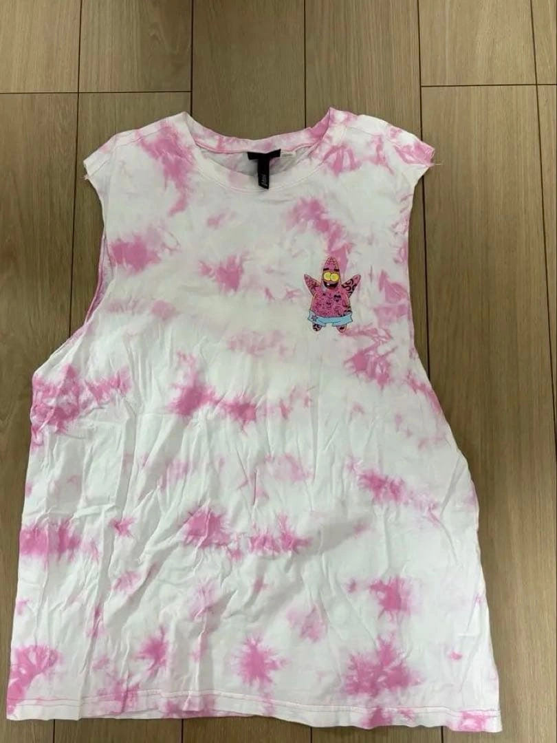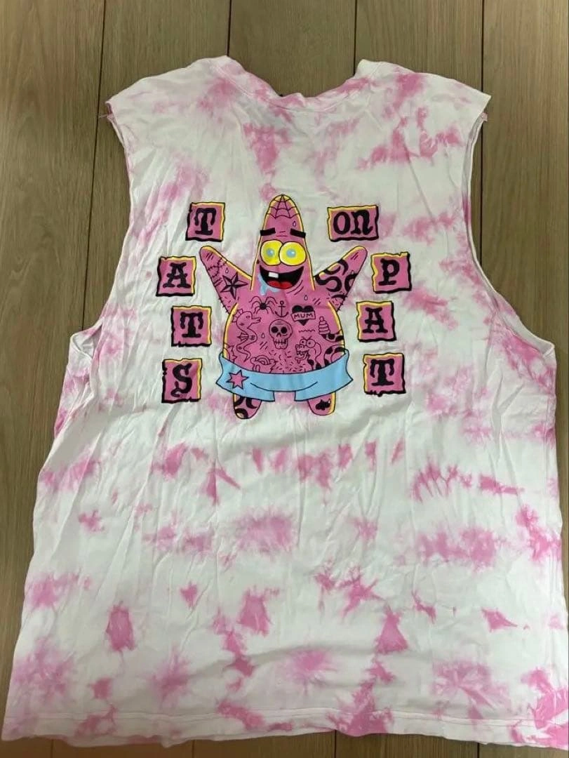 タイダイ柄のノースリーブTシャツです。全身タトゥーの入ったちょい悪パトリックのイラスト付き。 【size】 着丈75 幅64 - デザイン: タイダイ柄、パトリックのイラスト - カラー: ピンク・ホワイト - スタイル: ノースリーブ、カジュアル - 特徴: フロントとバックにパトリックのプリント ご覧いただきありがとうございます。