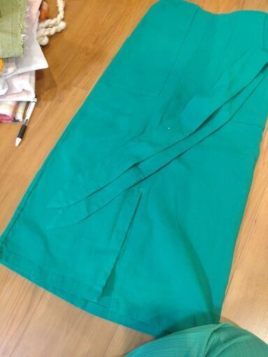 タイトスカートですが、ストレッチがある素材で歩きやすいです。 ウェストで結んで使うひものベルト付きです。 写真だと色が伝わりにくいですが、クレヨンみたいなはっきりした緑色です。 ▼参考 https://www.lettuce.co.jp/products/detail/12275 同じ色が掲載がありませんが、この商品の短いほうの丈です。 ご希望の方はお気軽にご連絡ください。