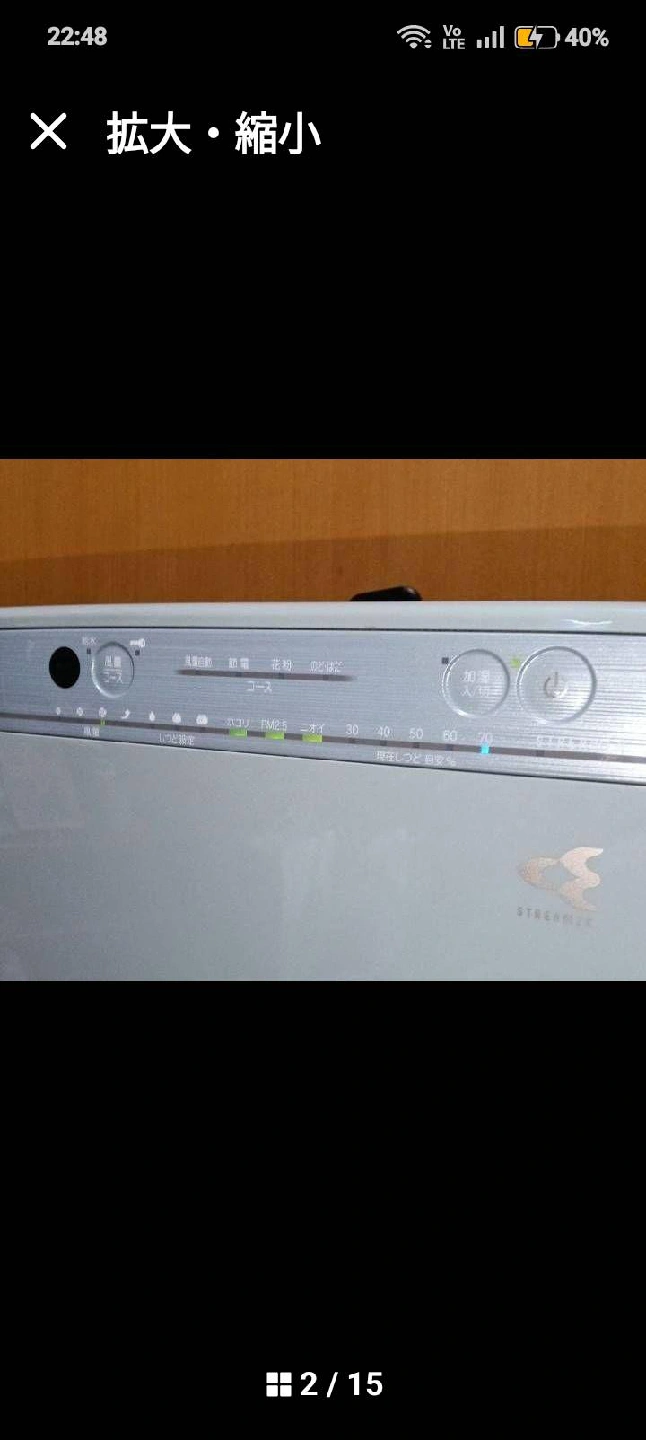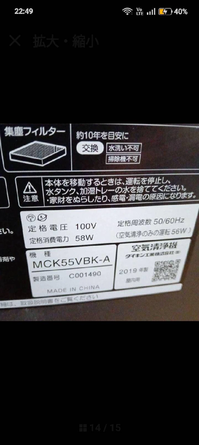 DAIKIN 加湿ストリーマ空気清浄機 希少色の空色。 MCK55VBK-A 2019年製 【特徴】 ◉吸引-広範囲のホコリを吸引 ◉人が感じる運転音を低減した内部構造 ワイドな吹き出し口と、ファンをフィルターの下部に配置して防音効果で人が感じる運転音を軽減。 ◉空気中の浮遊ウィルス・カビを吸い込んで抑制。 ◉1年中飛散する全国の花粉[16種類]を無力化。 ◉PM2.5、排ガスを同時対策。 ◉お肌に嬉しいパワフル加湿 ◉10年間交換不要で集塵能力が持続。 ◉ニオイをフィルターに吸着力、ストリーマで分解。しかも、吸着能力が再生するので脱臭能力が持続。 【仕様】 最大適用畳数:25畳 空気清浄機機能:加湿 脱臭 花粉モード イオン機能 安全機能:チャイルドロック センサー:湿度センサー 温度センサー ニオイセンサー ホコリセンサー タンク容量(L):2.7 L 消費電力(W):58.0 W 最大騒音値(db):53.0 db 集じん方式:ファン式 【サイズ】 幅(mm):350.0 mm 奥行き(mm):285.0 mm 高さ(mm):656.0 mm コード長さ(m):1.8 m 重量(kg):13.0 kg カラー:ソライロ(ブルーグレーのようなお色です) 【付属品】 ・本体 ・取扱説明書 ・リモコン ・リモコンホルダー ※稼働確認済み。簡易清掃、除菌済み。 ※喫煙者【ありの時】に使用してましたので気になる方は購入をお控え下さい