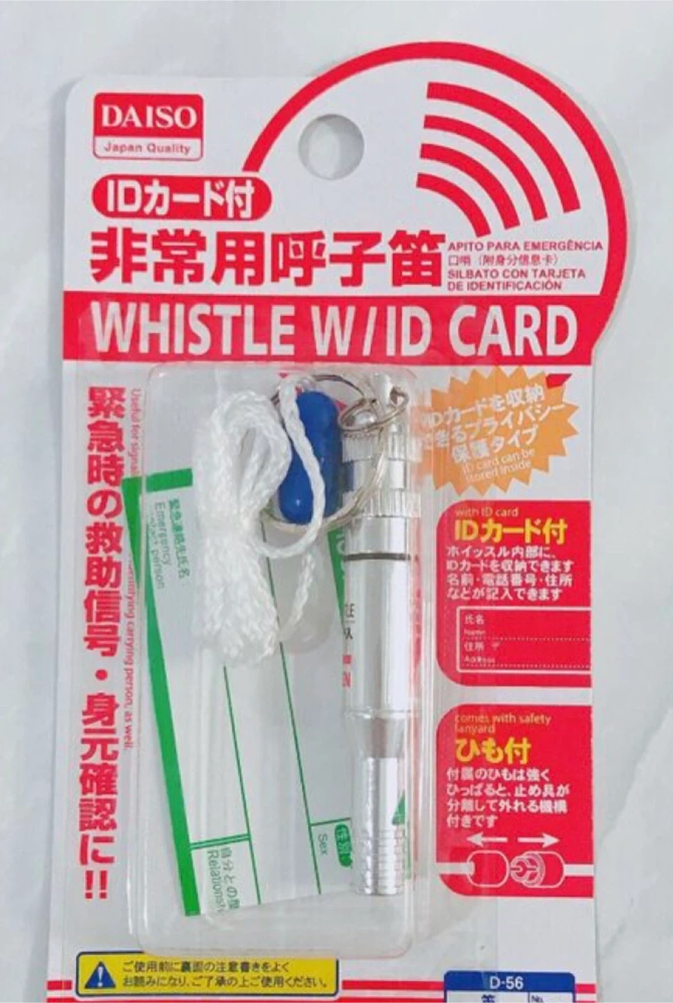 ダイソーの笛です ・ブランド:ダイソー ・IDカード付 ・緊急時、アウトドア、防災対策に 在庫7個あります  7個おまとめ購入の場合は150円 ※パッケージを開けただけで  ホイッスルは吹いていません ⚠️パッケージなし/ 大リングなし ビニールチャック袋でのご用意 中古品であることご了承ください