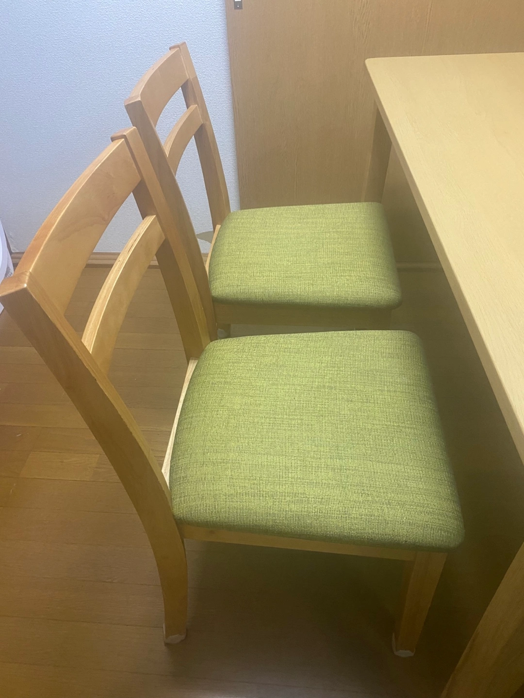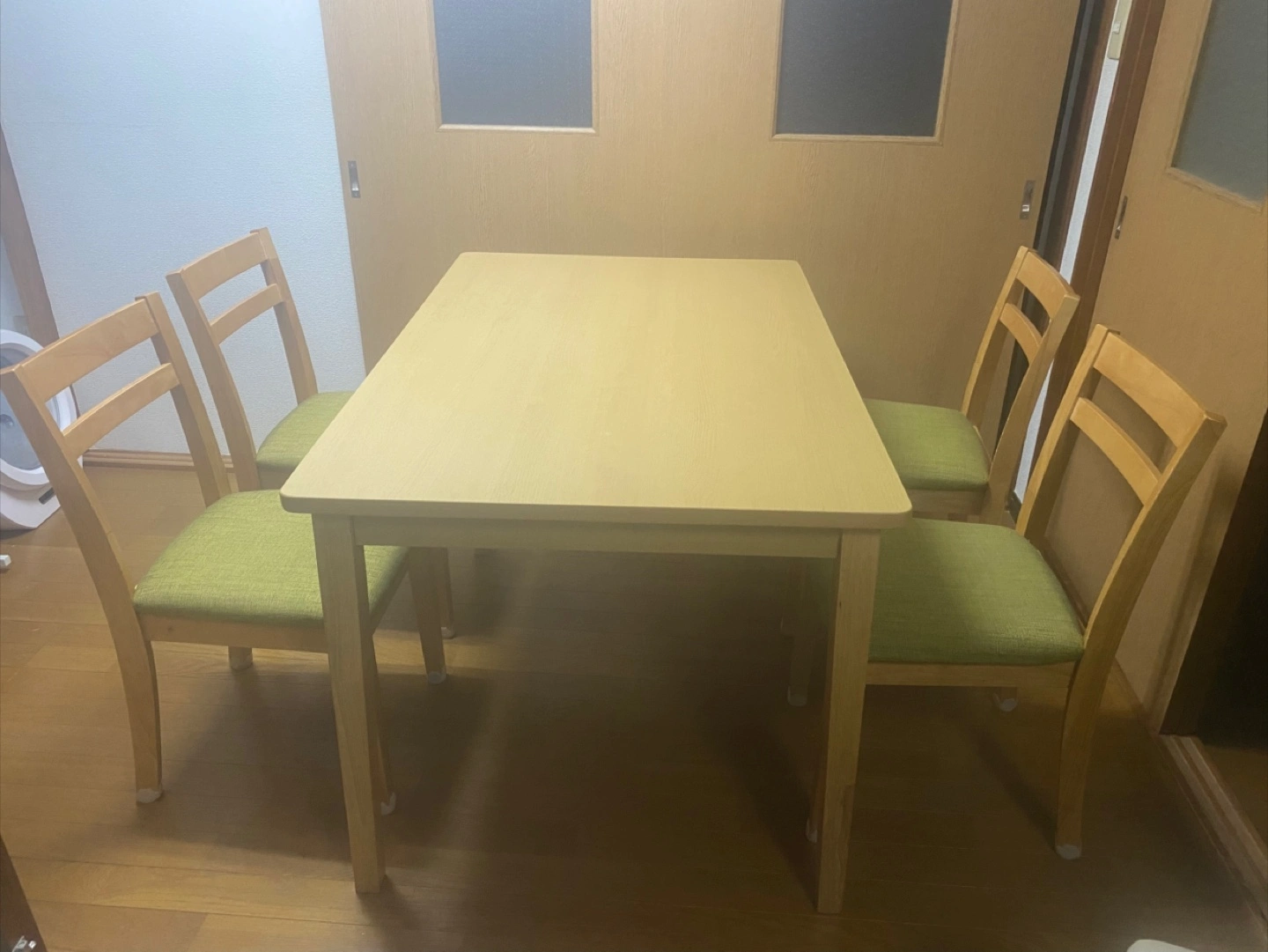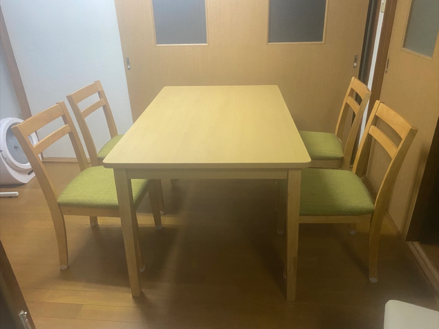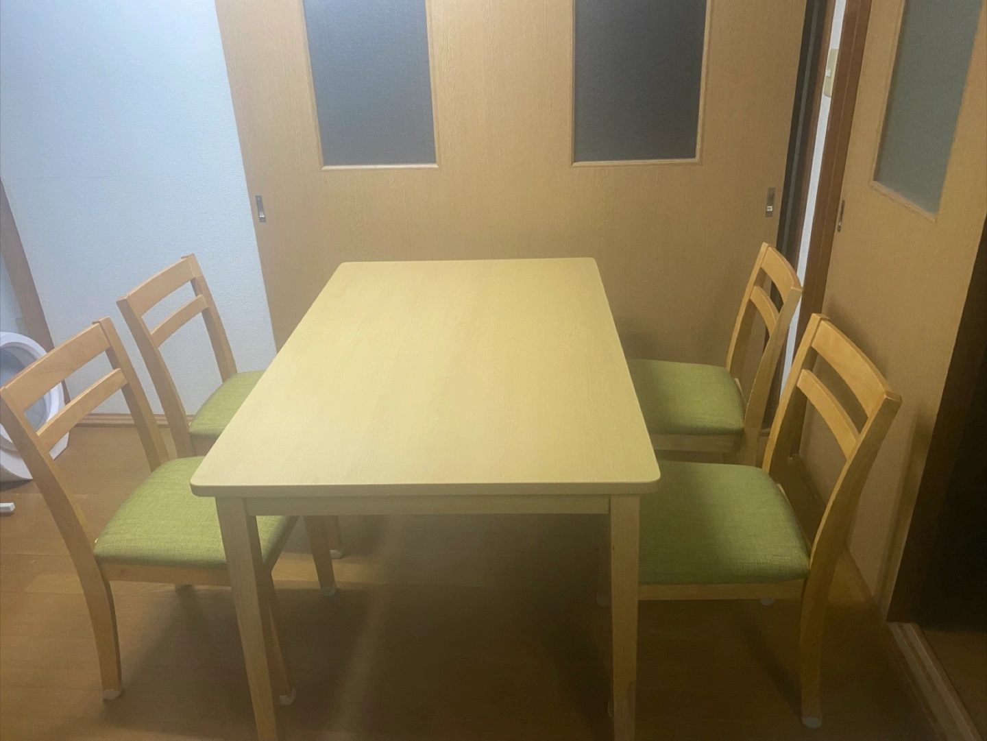 ・ダイニングテーブル1点 ・椅子4脚 ・テーブルの色:薄いベージュ ・椅子の座面:グリーン