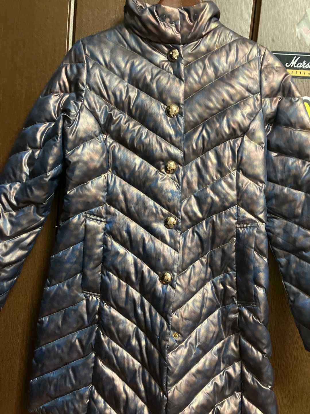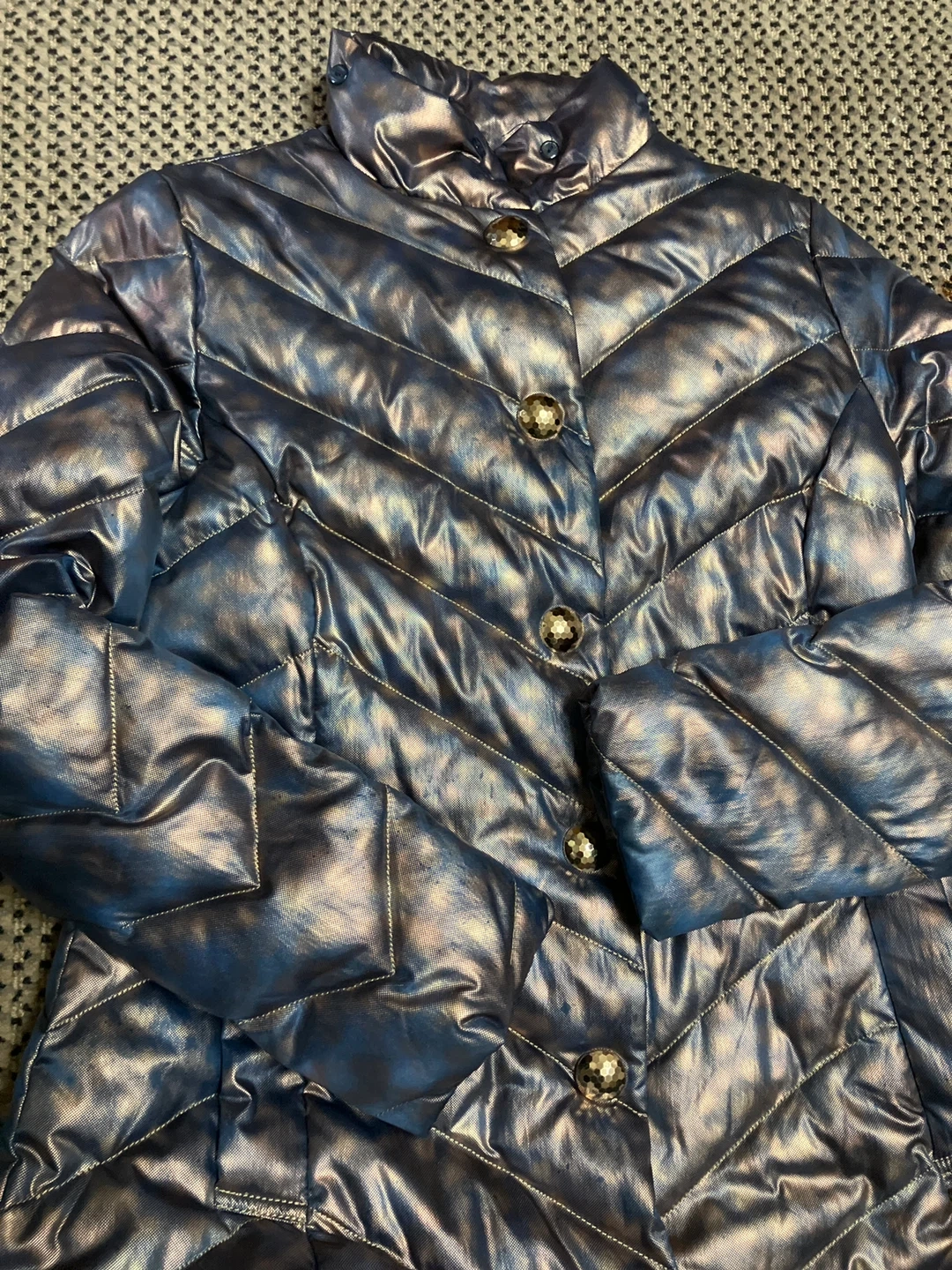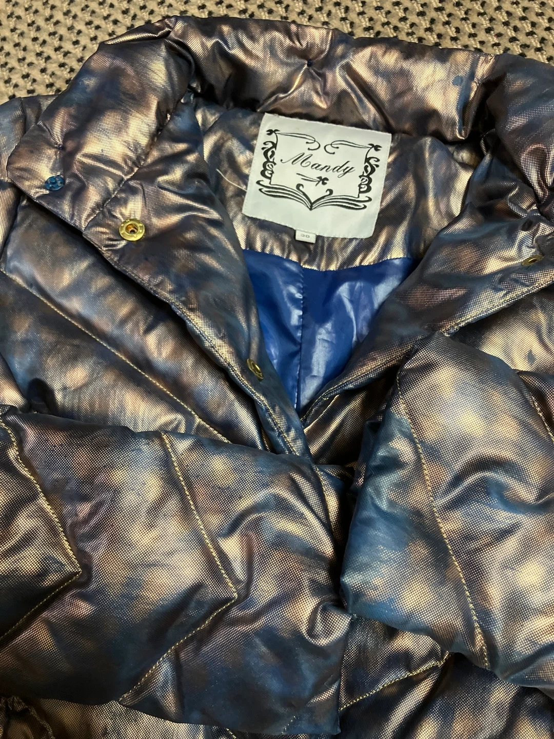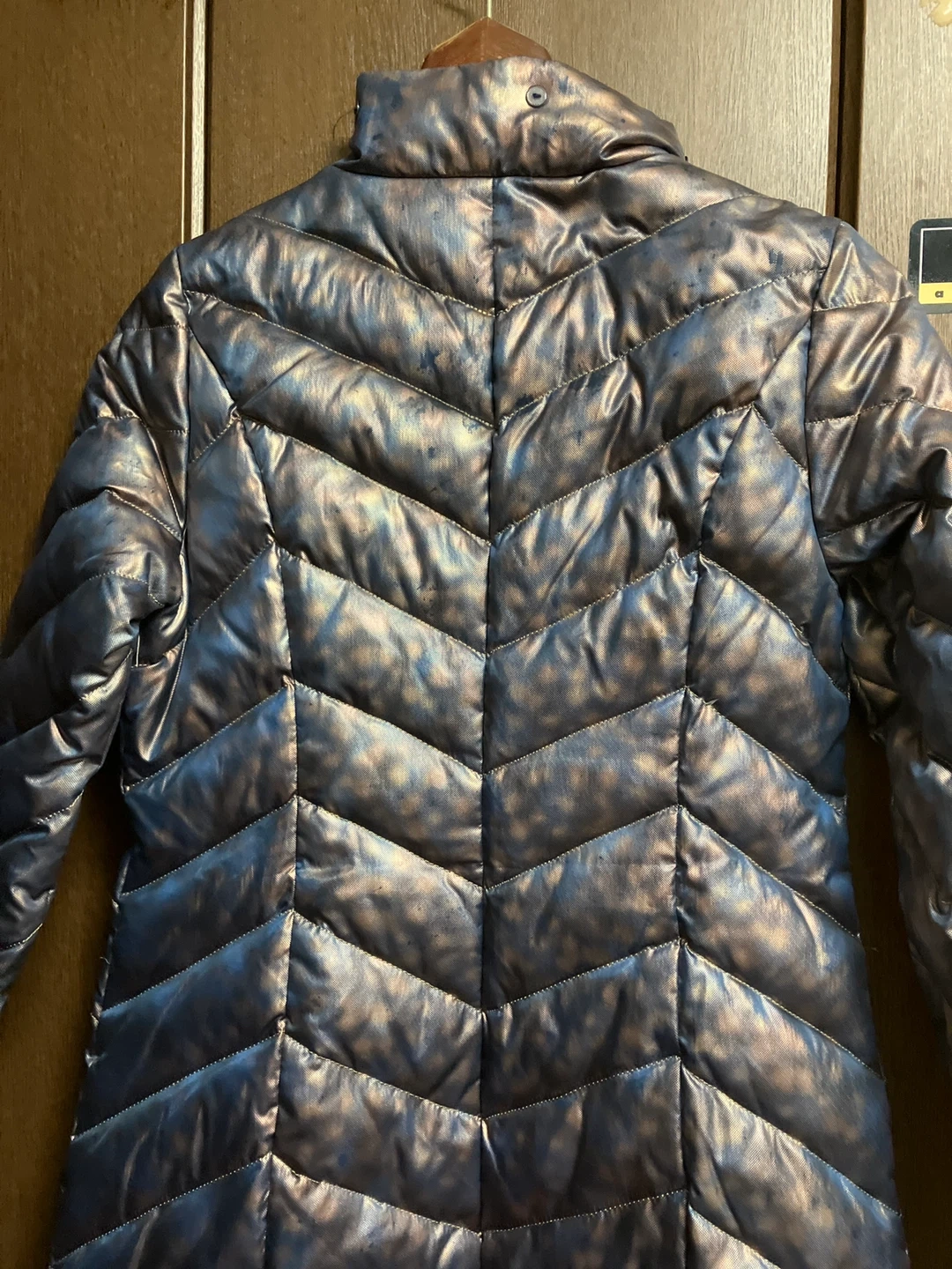 ブルー系玉蟲色ダウンジャケットです。とても個性的でオシャレと思います。 娘が以前着用していました。 やや汚れありにしたのは、多分フードが付いていたであろうと思いますがフードなし。一番下のボタンが無いです。 コートの状態はきれいと思います。 ・色:ブルー/ブロンズのようなメタリックカラー ・素材:ダウン80%、フェザー20% ・状態:使用感少なめ ご不明点があればお気軽にご連絡ください。