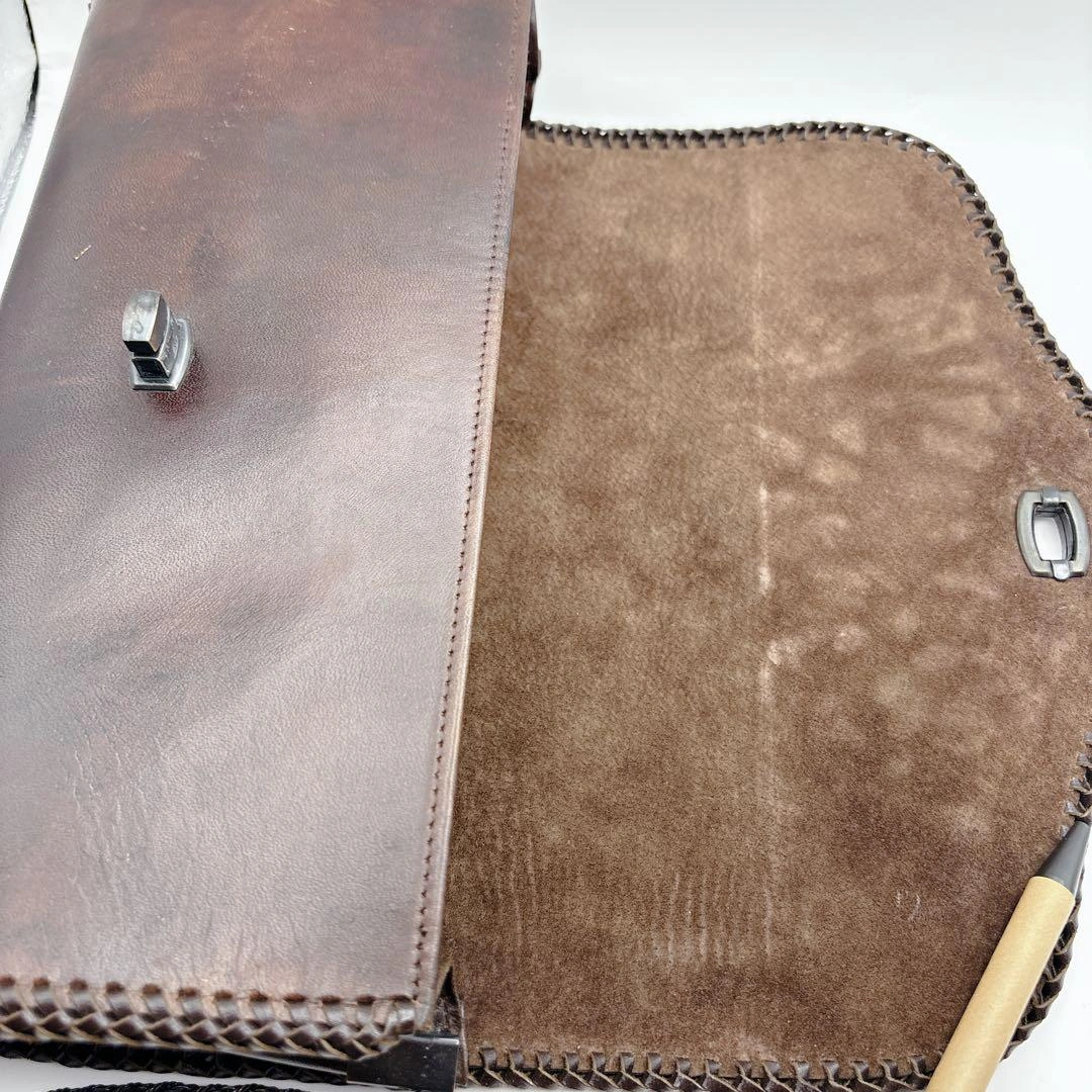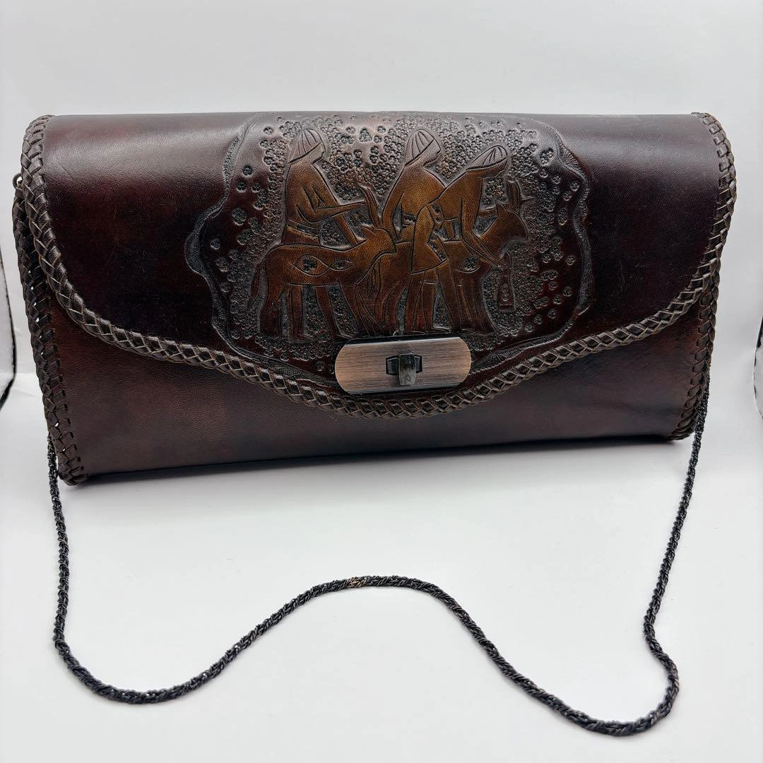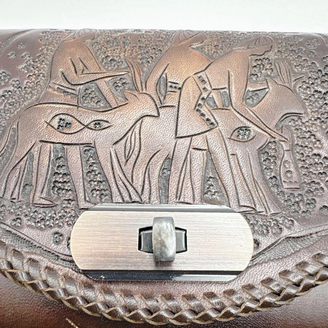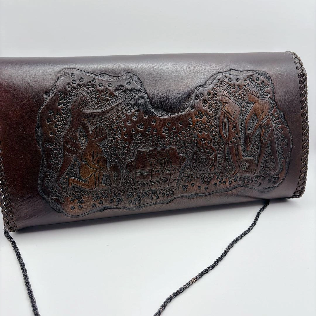 ご覧頂きありがとうございます。 状態はいいです。 ダークブラウンのレザー製クラッチバッグ、エンボス加工の動物と人々のデザインが特徴。 - 色: ダークブラウン - 素材: レザー - デザイン: エンボス加工の動物柄 - デザイン: エンボス加工の人々のデザイン - ストラップ: チェーンストラップ - 留め具: 金属製のロック - 形状: クラッチバッグ ご覧いただきありがとうございます。 ご希望の方はお気軽にご連絡ください。