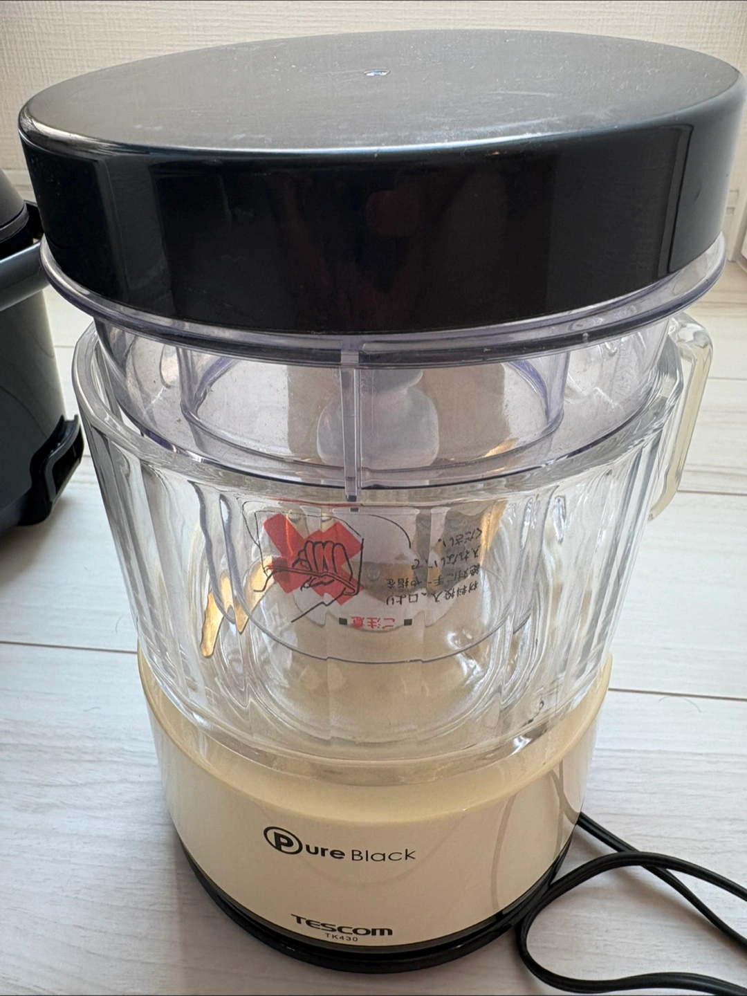 すべて見る【情報】 ブランド:テスコム 型番:TK430 【状態】 中古品 容器がガラス製なので臭い移りせず、重宝します。 ホイップ作る部品が欠品してます。 おろしとフードプロセッサーは使えます。 プラスチック部分が経年劣化により変色していますが動作に問題はありません。