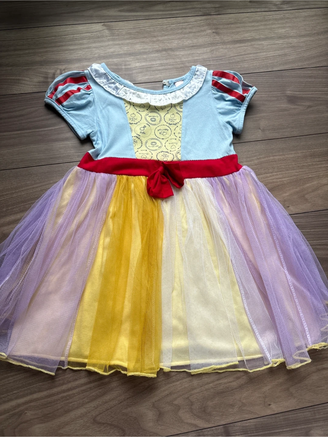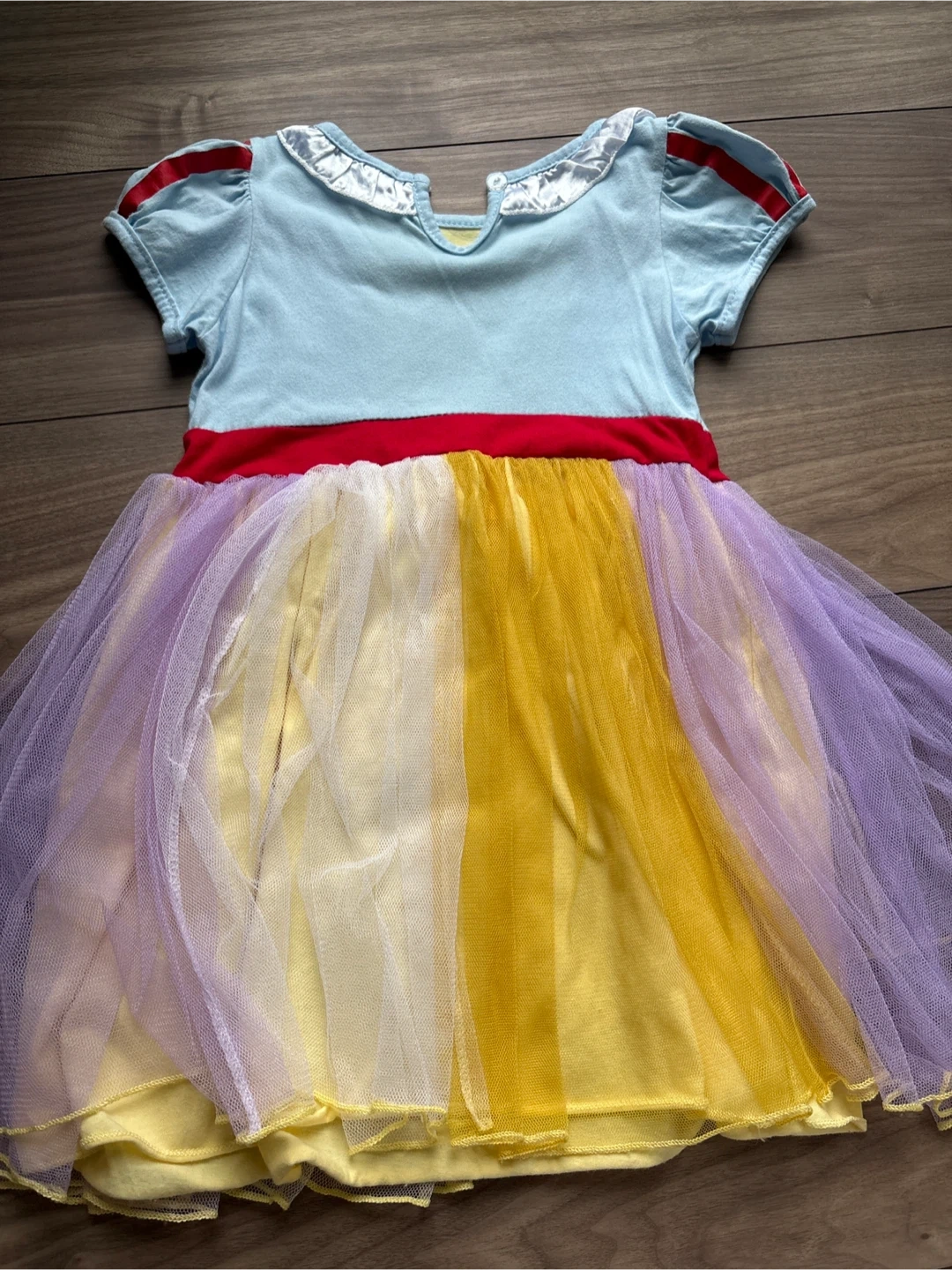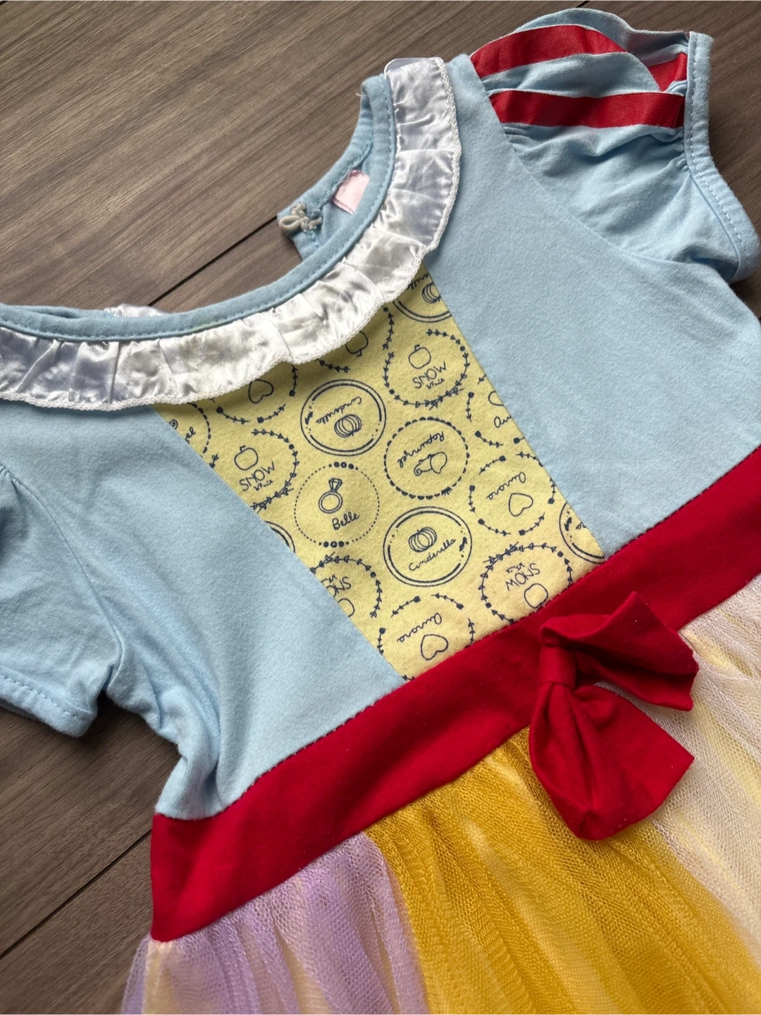 ディズニープリンセスのドレスです。 ・色:水色、黄色、紫、白 ・サイズ:120 ・ディズニープリンセスの柄 ・赤いリボン付き ・チュールスカート 中古品であることご了承ください。海外製になりますので、多少のほつれはご了承下さい。 サイズ表記が見えなかったのですが、120センチの物になります。