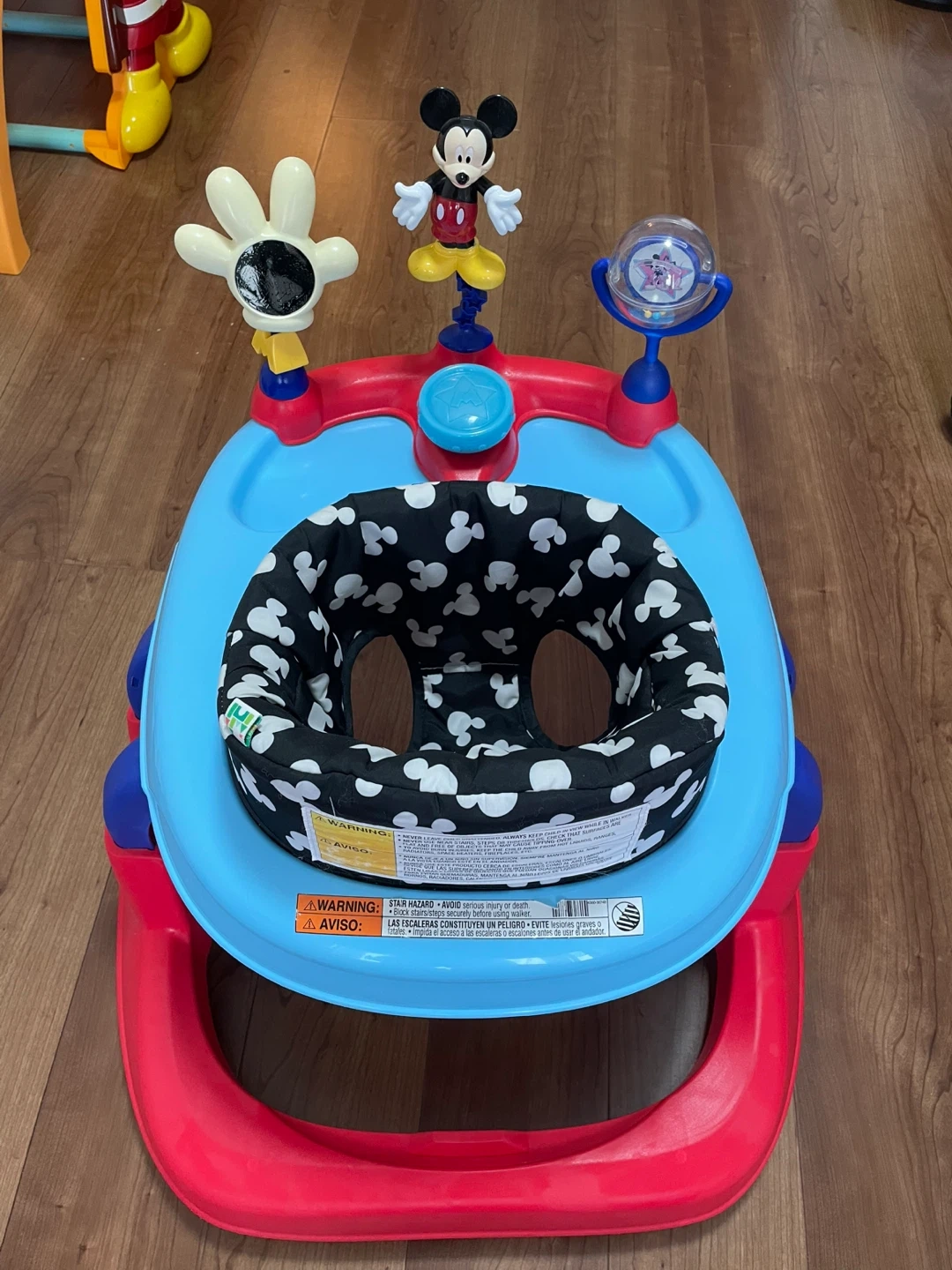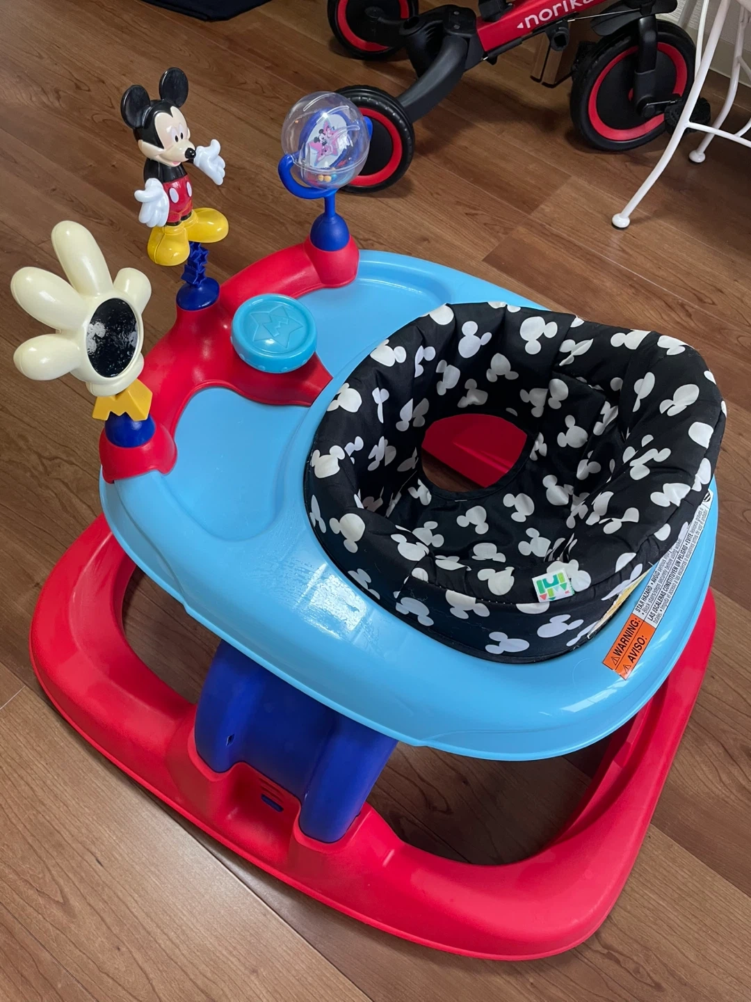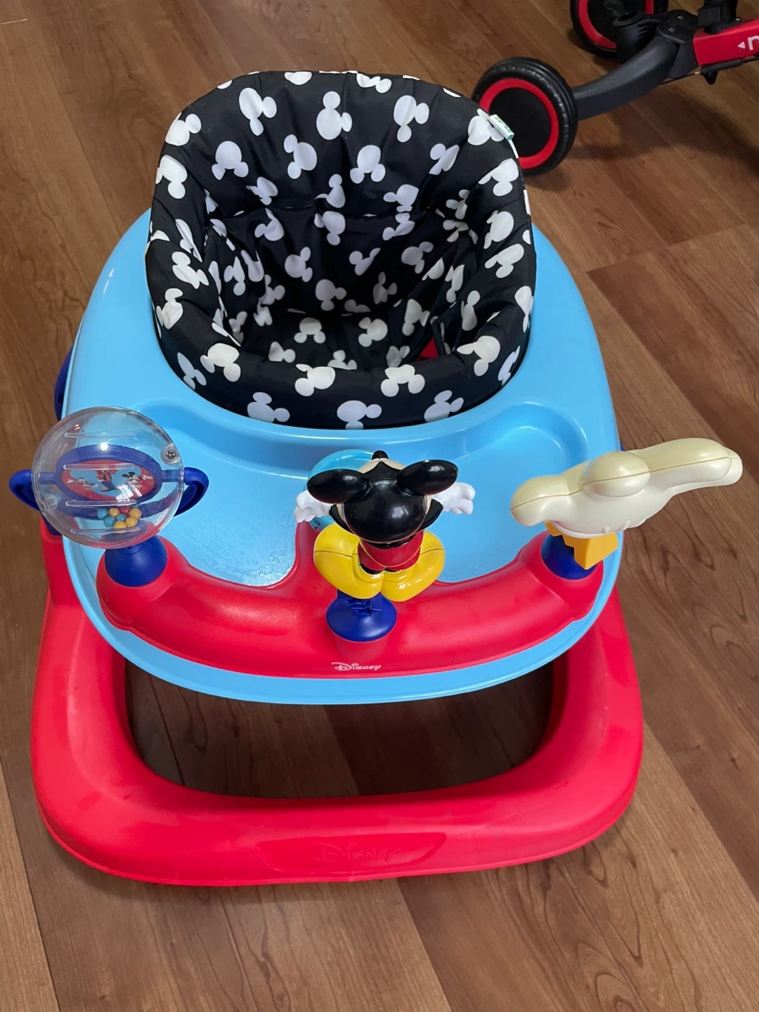 楽しく歩行のサポートをする、ディズニーのベビーウォーカーです。 ・色:赤、青、黒、白 ・ミッキーマウスのデザイン ・アルコールシートで全体を掃除済み ・ボタンを押すと音が鳴ったり、鏡やビーズ入りのボールで遊べます🎶 ・我が家では歩行のサポートの他、中に入って遊ぶおもちゃとして3歳まで楽しんでいました。 中古品であることご了承ください。