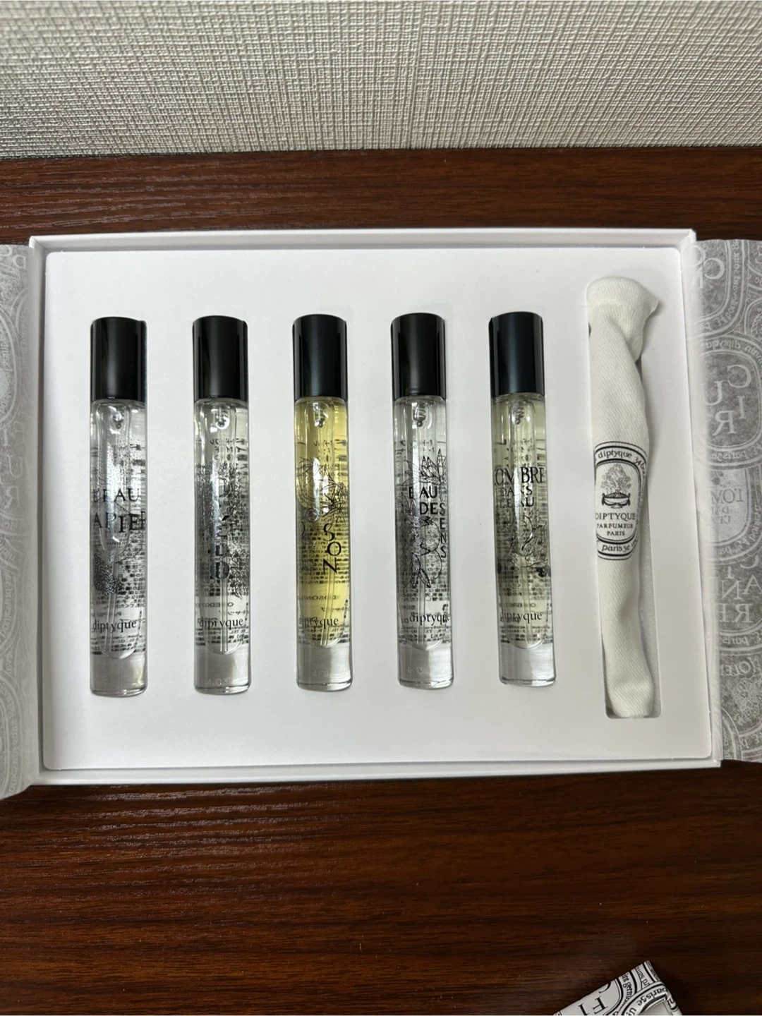 ディプティックの香水5種セットです 香りはDo Son, Oyédo, L'Eau Papier, Eau des Sens, L'Ombre dans l'Eauです。 5個全部まとめて販売します。 ほぼ新品です。 今年8月に公式ホームページで購入しました。 香水ポーチと外箱付きです! 【情報】 ブランド:ディプティック 種類:オードトワレ 【状態】 ほぼ未使用品 受け渡し場所は多摩モノレールの多摩センター駅~立川駅で可能です。もし提案があればお受けします!