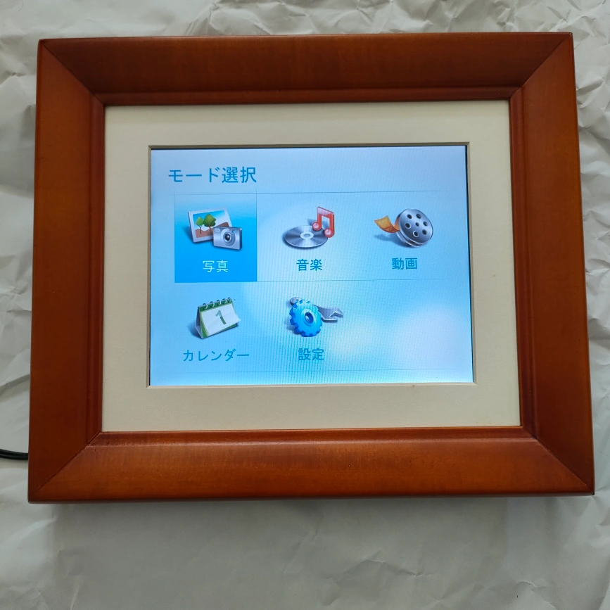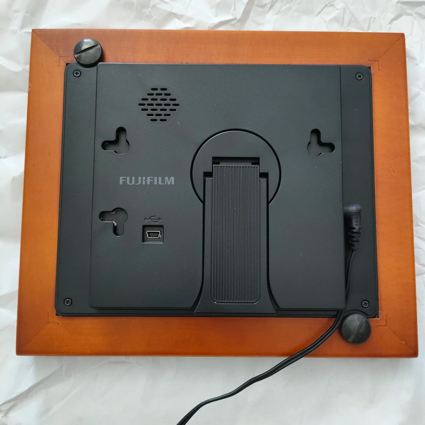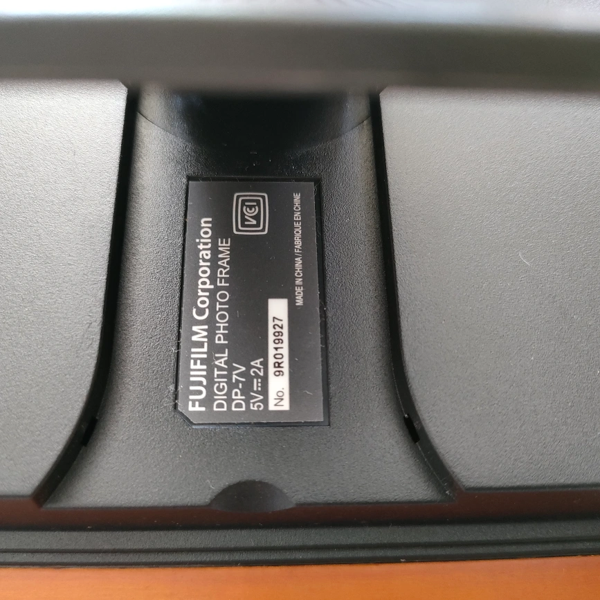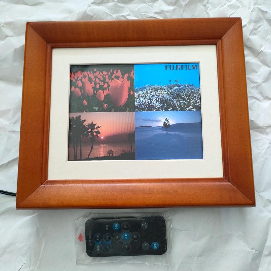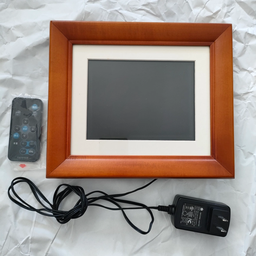 富士フィルム デジタルフォトフレームDP-7V 内容は本体、電源アダプター、リモコン です。 取扱い説明書はありませんが、ネット上で閲覧できました。 写真のスライドショーがオートで再生されます。 カレンダー、時計表示もできます。 額の白い台紙に数店のシミ、額縁裏側に一箇所キズがあります。 額縁を外して簡単に清掃しておきました。 台紙のシミが気になる方は、お気に入りのマスキングテープでシミ隠し+デコレーションしても良いかと思います。 お値下げはご遠慮下さい。