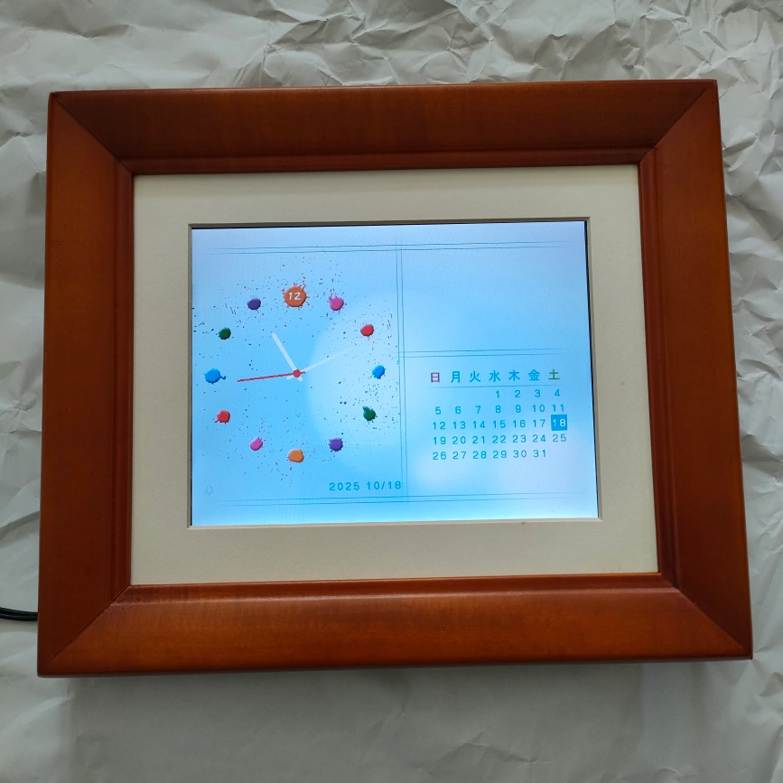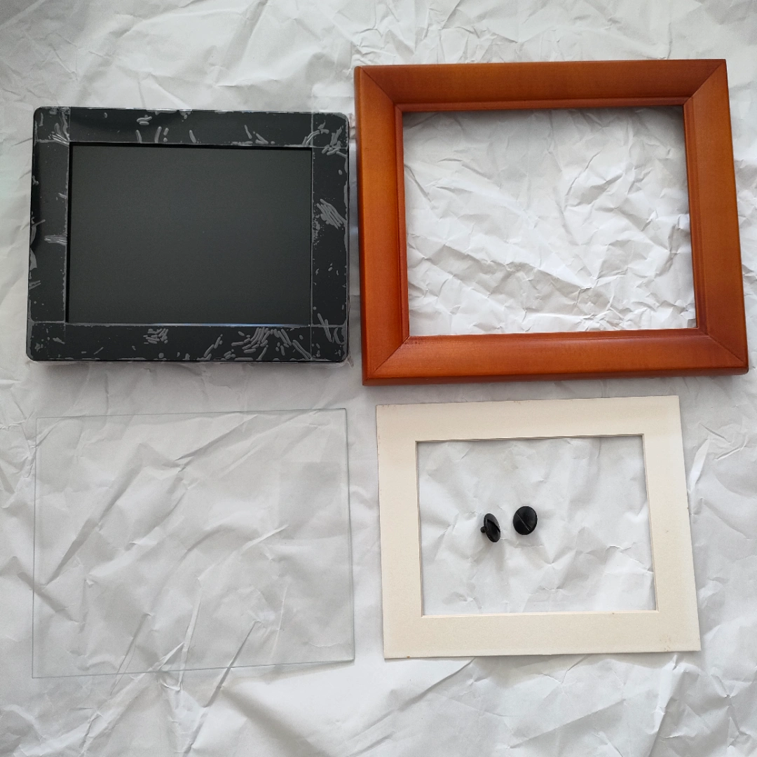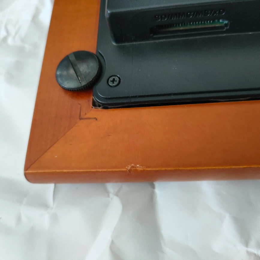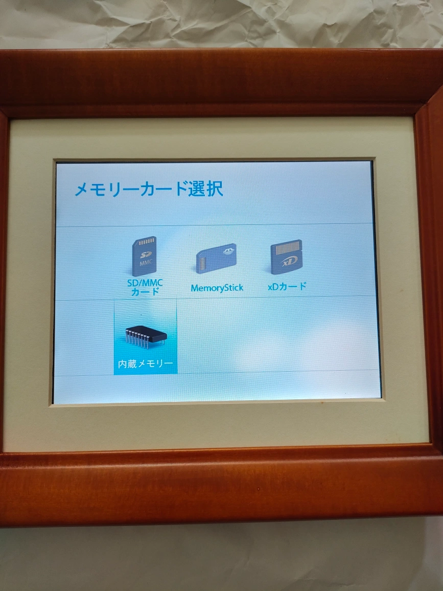 富士フィルム デジタルフォトフレームDP-7V 内容は本体、電源アダプター、リモコン です。 取扱い説明書はありませんが、ネット上で閲覧できました。 写真のスライドショーがオートで再生されます。 カレンダー、時計表示もできます。 額の白い台紙に数店のシミ、額縁裏側に一箇所キズがあります。 額縁を外して簡単に清掃しておきました。 台紙のシミが気になる方は、お気に入りのマスキングテープでシミ隠し+デコレーションしても良いかと思います。 お値下げはご遠慮下さい。