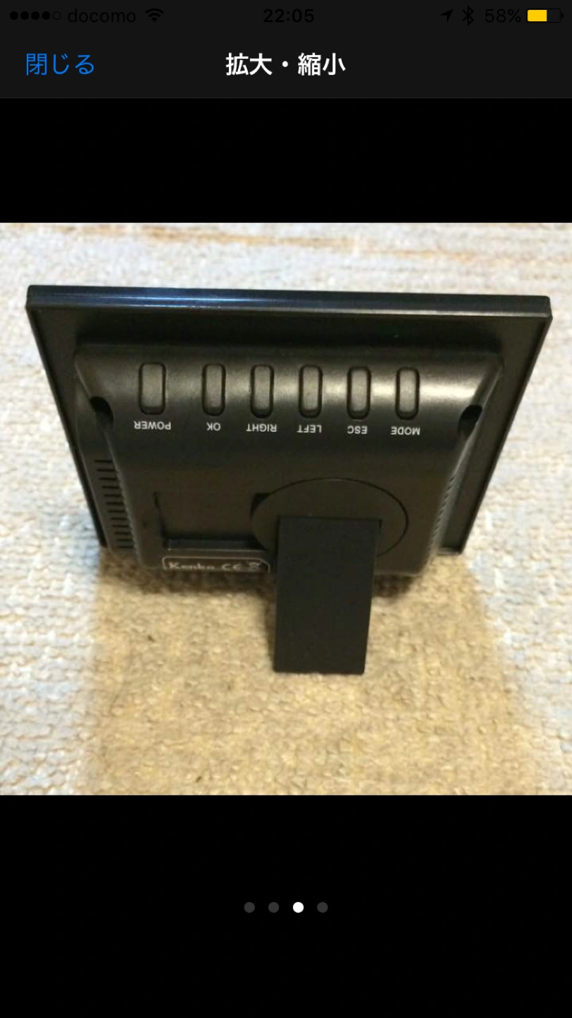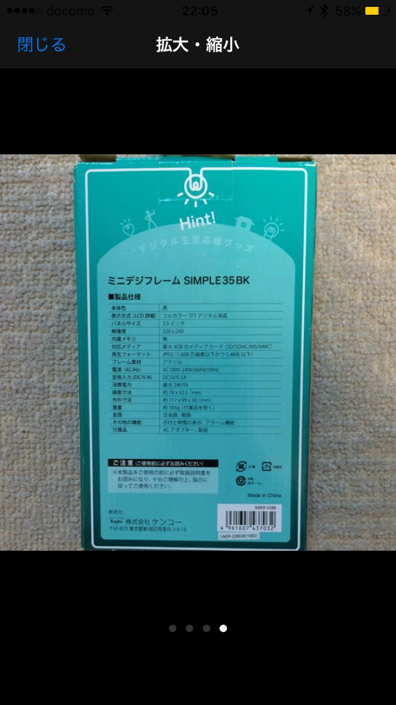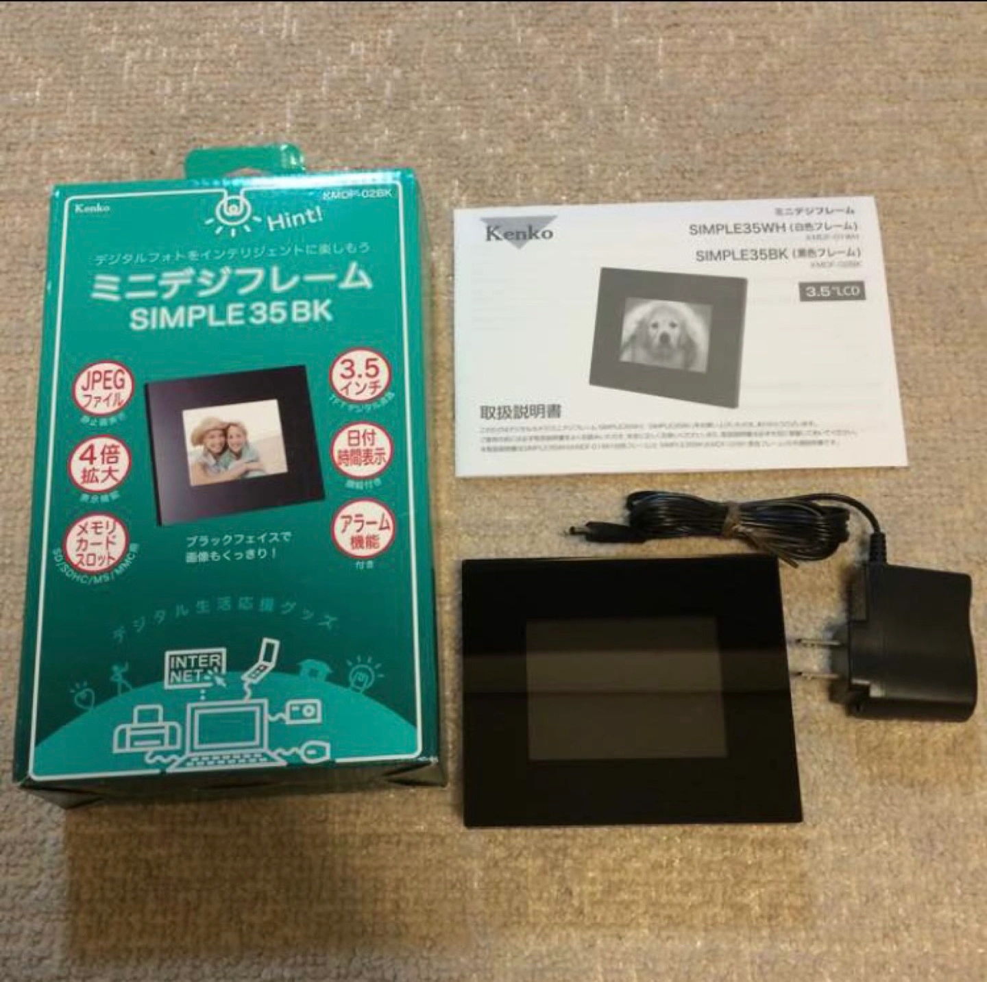 KenkoケンコーミニデジタルフレームSIMPLE35BKです。 とてもかわいいサイズで場所を取らず、好きな写真を表示できます。 付属品全て揃っていますので、写真の入ったSDカードを用意いただければ、すぐ使えます。 購入後、テスト利用したのみで、ほとんど使用していません。外箱は、スレ破れ等ございますのでご了承ください。お気になさる方はご購入をお控えください。 「ブラックフェイス」のくっきりフレームミニデジフレームSIMPLE 35 BK ブラックフレームはどんなインテリアにもマッチし、写真のコントラストをぐっと引き立てます。日付表示・アラーム機能や、横置き・縦置きが可能なスタンドなど、機能もいろいろ。 仕様: ・本体色:ブラック ・表示方式(LCD詳細):フルカラーTFT液晶 ・パネルサイズ:3.5インチ ・解像度:320×240 ・内蔵メモリ:なし ・対応メディア:最大4GBのメディアカード(SD/SDHC/MS/MMC) ・再生フォーマット:JPEG(1,600万画素以下かつ5.4MB以下) ・フレーム素材:アクリル ・電源(AC/Hz):AC100V-240V/60Hz・50Hz ・定格入力:DC5V / 1A ・消費電力:最大3W / 5V ・画面寸法:約70×52.5mm ・外形寸法:約117×99×30mm ・重量:約165g(本体) 付属品を除く ・言語:日本語、英語 ・その他の機能:日付と時間の表示、アラーム機能 ・付属品:ACアダプター、取扱説明書