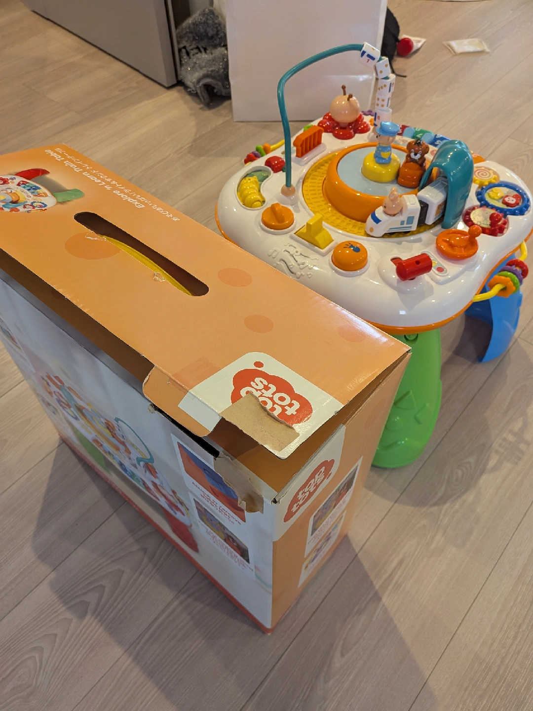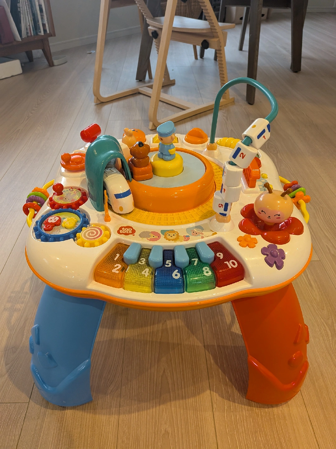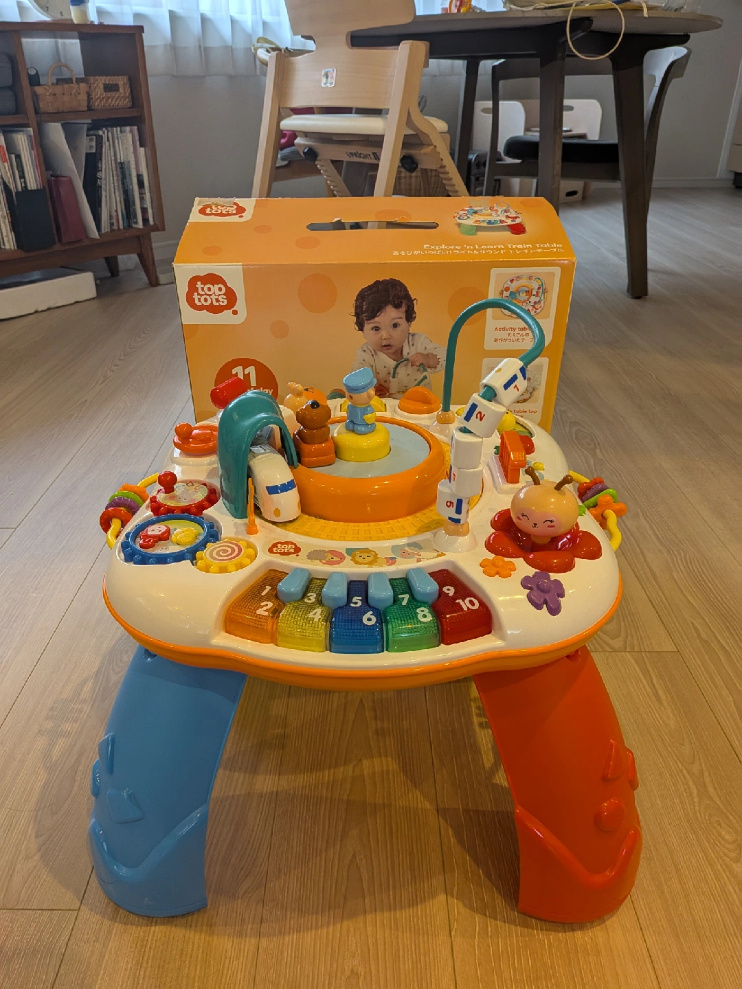 トップトッツのExplore Learn Tableです。 成長とともにあまり遊ばなくなってしまいまだまだ使えるので赤ちゃんのおもちゃにいかガでしょうか? 下記サイトからの引用です! 『Top Tots(トップトッツ)』は、0歳から3歳までの、お子様の成長のひとつひとつのステップに寄り添うおもちゃが幅広く揃った、トイザらス・ベビーザらスのプライベートブランドです。 11種類もの遊びが付いたライト&サウンドテーブル! ・ハンドルを回すと、くまさんがおしゃべりして車が動きます。 ・リアルな汽笛の音がします。 ・レッツゴー!レバーを押すと、英語のおしゃべりが聞こえて、トレインが動きます。 ・スイッチを押すと、電車の効果音がします。 ・花のボタンを押すと、鍵盤のモードが切り替えできます。色や数を英語で学べます。 ・指遊び ギアやビーズコースター、ループ ・トレインの走るスピードを変えることができます。 ・カラフルな鍵盤 ・テーブルの脚は取り外せます。お子様がたっちする前か 【情報】 ブランド:トップトッツ 商品:Explore Learn Table 【状態】 使用感少なめ 【付属品】 箱 中古品であることご了承ください