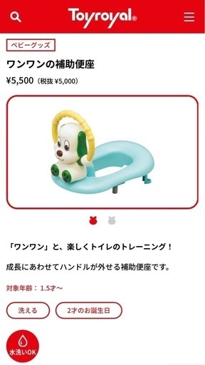 補助便座と踏み台のセットです。 トイトレ期間が短かったので比較的綺麗な状態かと思います(消毒済みです)。 ①ワンワンの補助便座 成長にあわせてハンドルが外せる補助便座です。 【成長に合わせて使える2つの機能】 ●ハンドル付補助便座 ⇒1才6ヵ月頃~:ハンドル付き補助便座として ●ハンドルなし補助便座 ⇒2才頃~:1人でトイレのトレーニング □仕様□ 対象年齢: 1.5才〜 サイズ:ハンドル付補助便座:W370×D240mm×H295mm(重量:660g) ②スリーコインズ トイレの踏み台 ご希望の方はお気軽にご連絡ください。