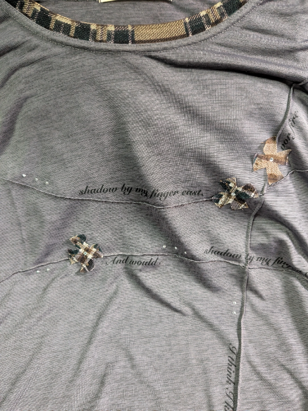 グレーのトップスです ・色:グレー ・デザイン:花柄のアップリケ、英字プリント ・状態:使用感あり 中古品であることご了承ください 繊細な作り…ソフトな、手洗いをおすすめ… 衣類乾燥機でしわ伸ばしができて、バッチリ
