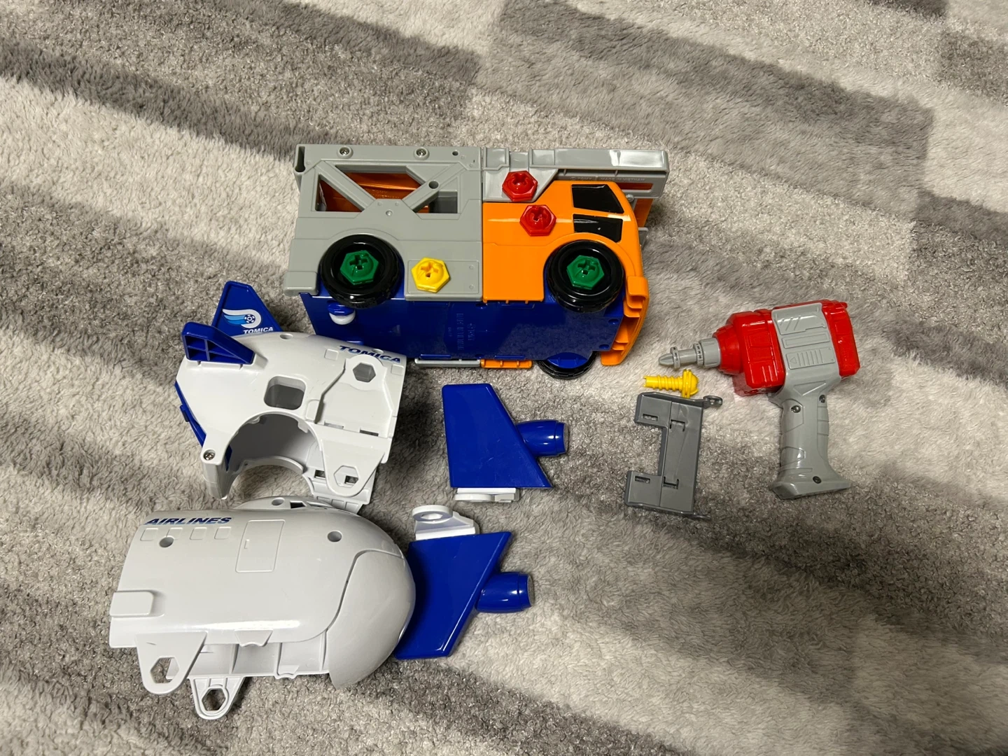 自分で組み立てるキャリアカー&カーゴジェットです。 ・ブランド:トミカ ・状態:使用感あり ・付属品:写真に写っているものが全てです 黄色のネジが1本不足しています また、電池はご自宅のものをご使用ください 引き取り前にウェットティッシュでパーツを拭き取り、お渡し予定です。 中古品ですので、神経質な方はご遠慮ください。