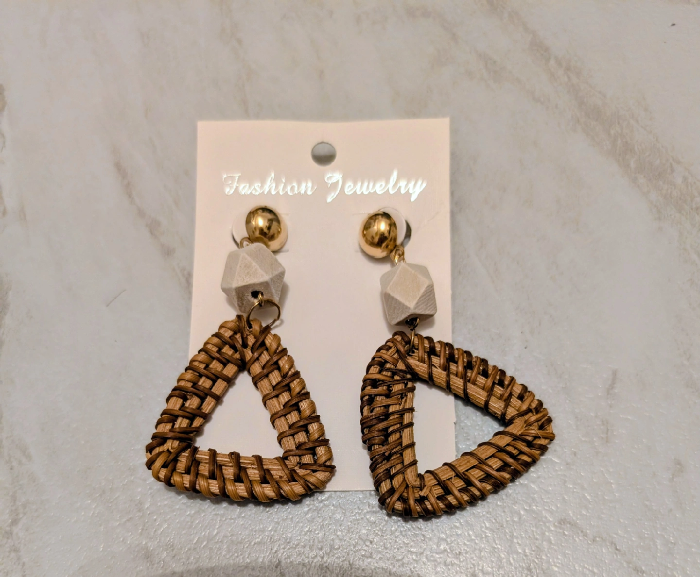 トライアングル型のピアスです ・色:ブラウン、ゴールド、ベージュ ・素材:不明(ラタン風素材) ・状態:未使用 少し大振りのピアスです。 久しぶりに、ピアスを、付けようと、思ったら耳の穴が、塞がってしまいました。