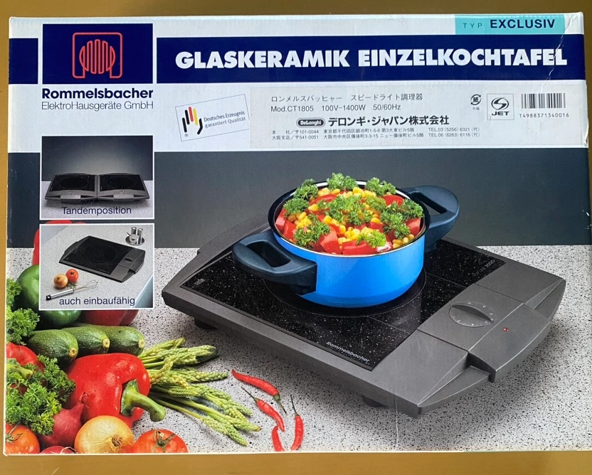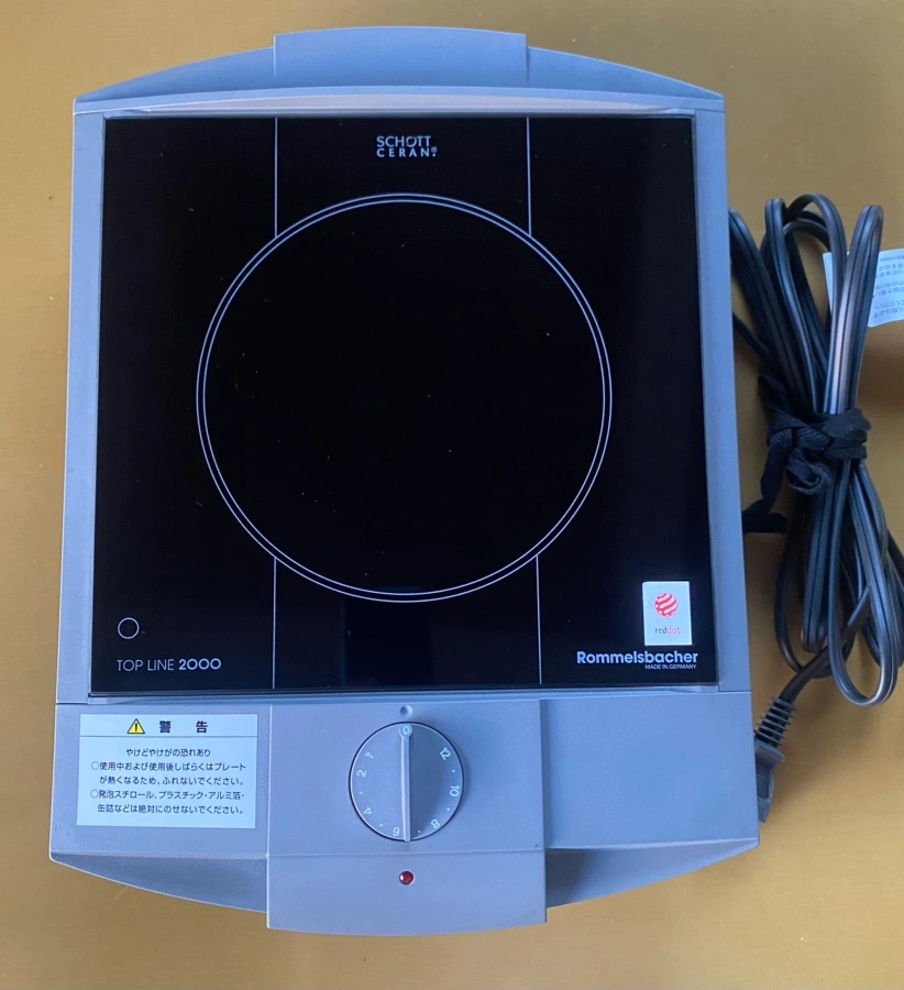 一度使用のみ パーティーで使用しようと購入しましたが、 鍋のサイズがあわず納戸にしまいこんでいました。 取扱説明書、箱付き <商品説明> ドイツ ロンメルスバッヒャー 社製の 電熱器。 立ち上がりが早く、熱分布が均一な 「スピードライト」を採用。 調理プレートにも熱効率の良いガラスセラミックを使用した 卓上クッキングプレート。 過熱防止装置付。 調理エリア 直径18cm内が発熱します。使用中は設定された加熱レベルを維持するために熱源のスピードライトがついたり消えたりします。過熱防止装置がついています。 加熱調節ツマミ 調理にあった加熱レベルを設定できます。 レベル0:電源OFF 弱(1~4):温める 中(5~8):蒸す、煮る、焼く 強(9~12):炒める、揚げる、湯を沸かす プレートで使用できる鍋 底の形状:平底で直径が18cm前後のもの 材質:耐熱ガラス、土鍋、ホーロー、金属製品 プレートで使用できない鍋 底の形状:丸底のもの、ざらざらしているもの 材質:非耐熱製品、アルミホイル/アルミ箔、缶詰 受け渡し場所以外も可能な場所ございます。 よろしくお願いいたします。