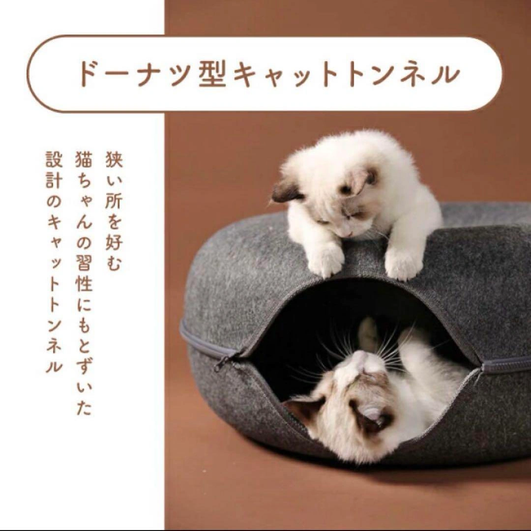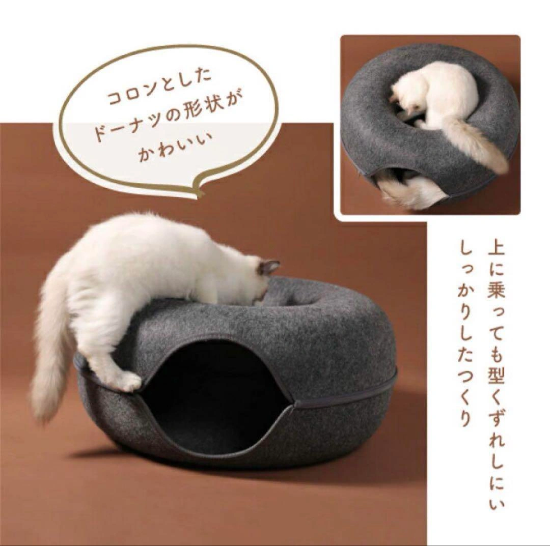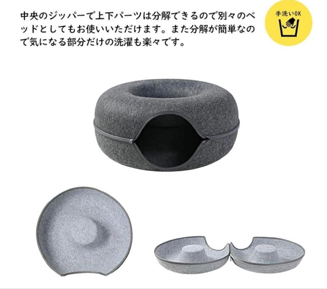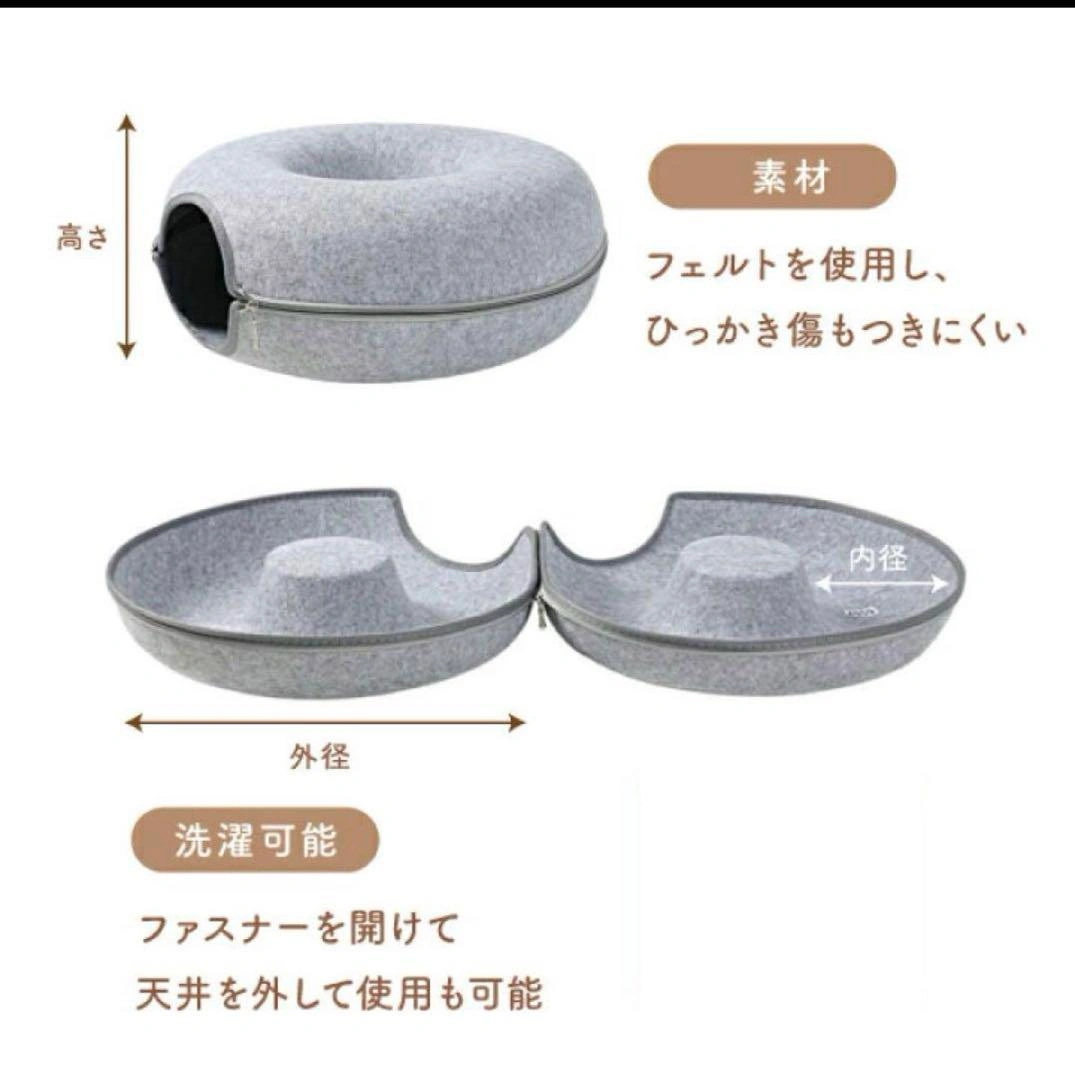 商品名:ドーナツ型キャットトンネル 素材:フェルト カラー :ライトグレー Mサイズ もぐる、寝る、遊ぶ。これ一つでOK! 遊び足りない猫ちゃんにオススメ!ドーナツ型のキャットトンネルです。 ●猫ちゃんの習性に基づいた設計 隠れて身を守るため、獲物を捕らえるため、体温を温存するために、狭い場所を好む猫ちゃんの習性をもとにデザインされています。 ●セパレートタイプ ファスナー式のセパレート型で、内側の掃除も楽々できます。暑い季節には天井を外して、オープンで使うこともできます。 ●手洗いOKのフェルト製 汚れたところは手洗いで洗濯ができるので、いつでも清潔です。寒い季節でも猫ちゃんが嬉しい、あたたかいフェルト製です。 ●シンプル&かわいい デザイン コロンとしたドーナツ形状が可愛く、シンプルなデザインでインテリアの邪魔をしません。使わない時はファスナーを外し、重ねてコンパクトに収納できます。 ※梱包資材削減の為、ダンボールは使用せずに緩衝材に包んだ状態でお届けします。 ⚠️小さめに折りたたんで発送します