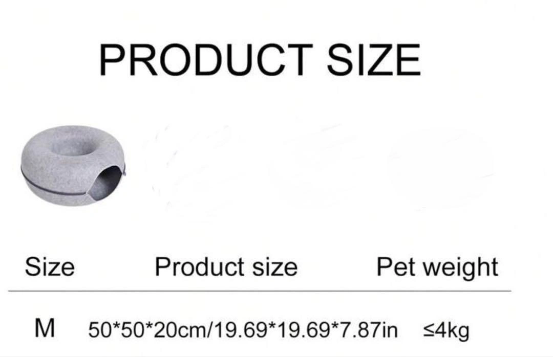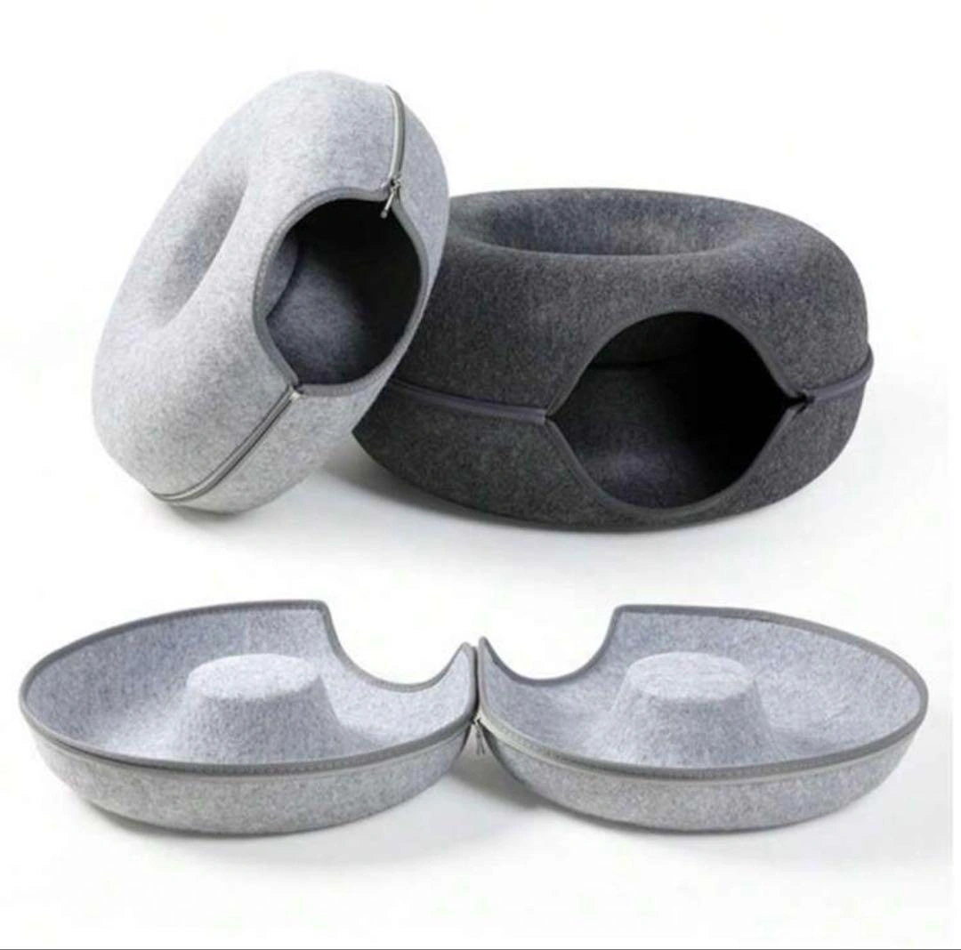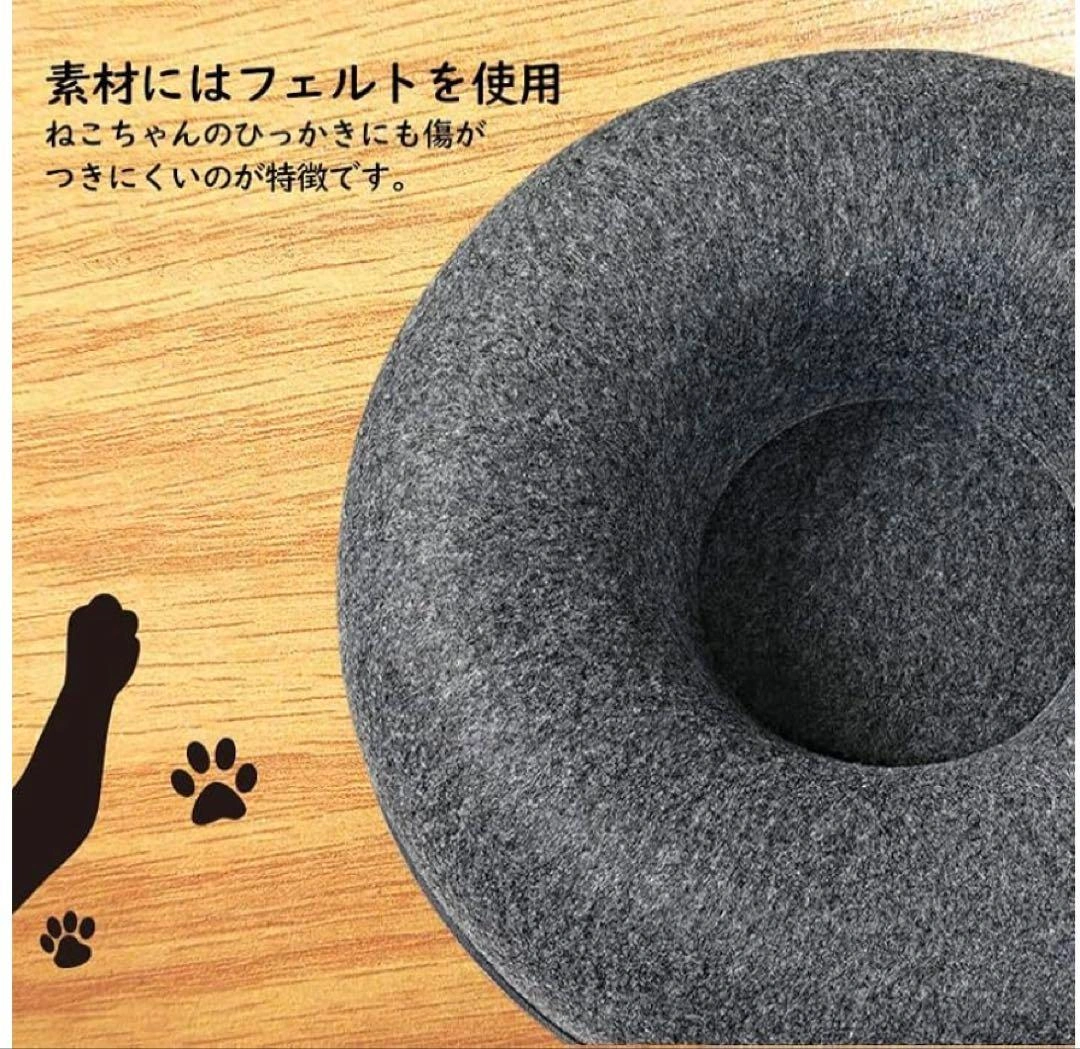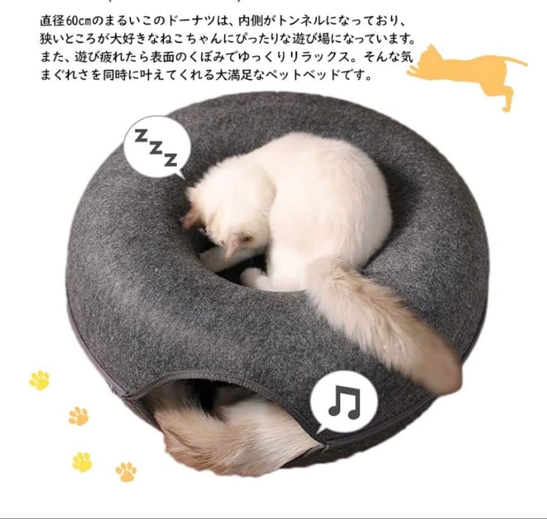 商品名:ドーナツ型キャットトンネル 素材:フェルト カラー :ライトグレー Mサイズ もぐる、寝る、遊ぶ。これ一つでOK! 遊び足りない猫ちゃんにオススメ!ドーナツ型のキャットトンネルです。 ●猫ちゃんの習性に基づいた設計 隠れて身を守るため、獲物を捕らえるため、体温を温存するために、狭い場所を好む猫ちゃんの習性をもとにデザインされています。 ●セパレートタイプ ファスナー式のセパレート型で、内側の掃除も楽々できます。暑い季節には天井を外して、オープンで使うこともできます。 ●手洗いOKのフェルト製 汚れたところは手洗いで洗濯ができるので、いつでも清潔です。寒い季節でも猫ちゃんが嬉しい、あたたかいフェルト製です。 ●シンプル&かわいい デザイン コロンとしたドーナツ形状が可愛く、シンプルなデザインでインテリアの邪魔をしません。使わない時はファスナーを外し、重ねてコンパクトに収納できます。 ※梱包資材削減の為、ダンボールは使用せずに緩衝材に包んだ状態でお届けします。 ⚠️小さめに折りたたんで発送します