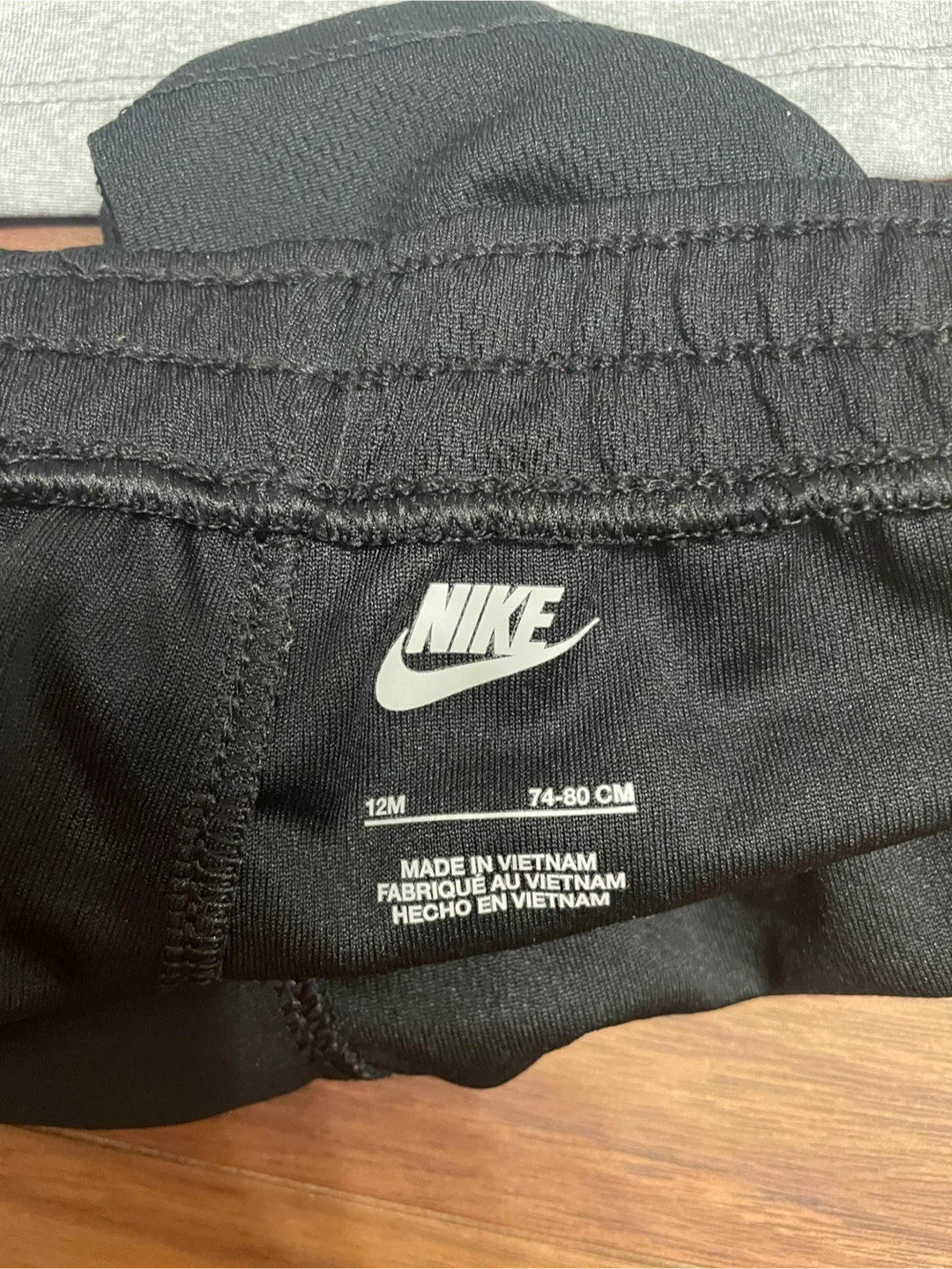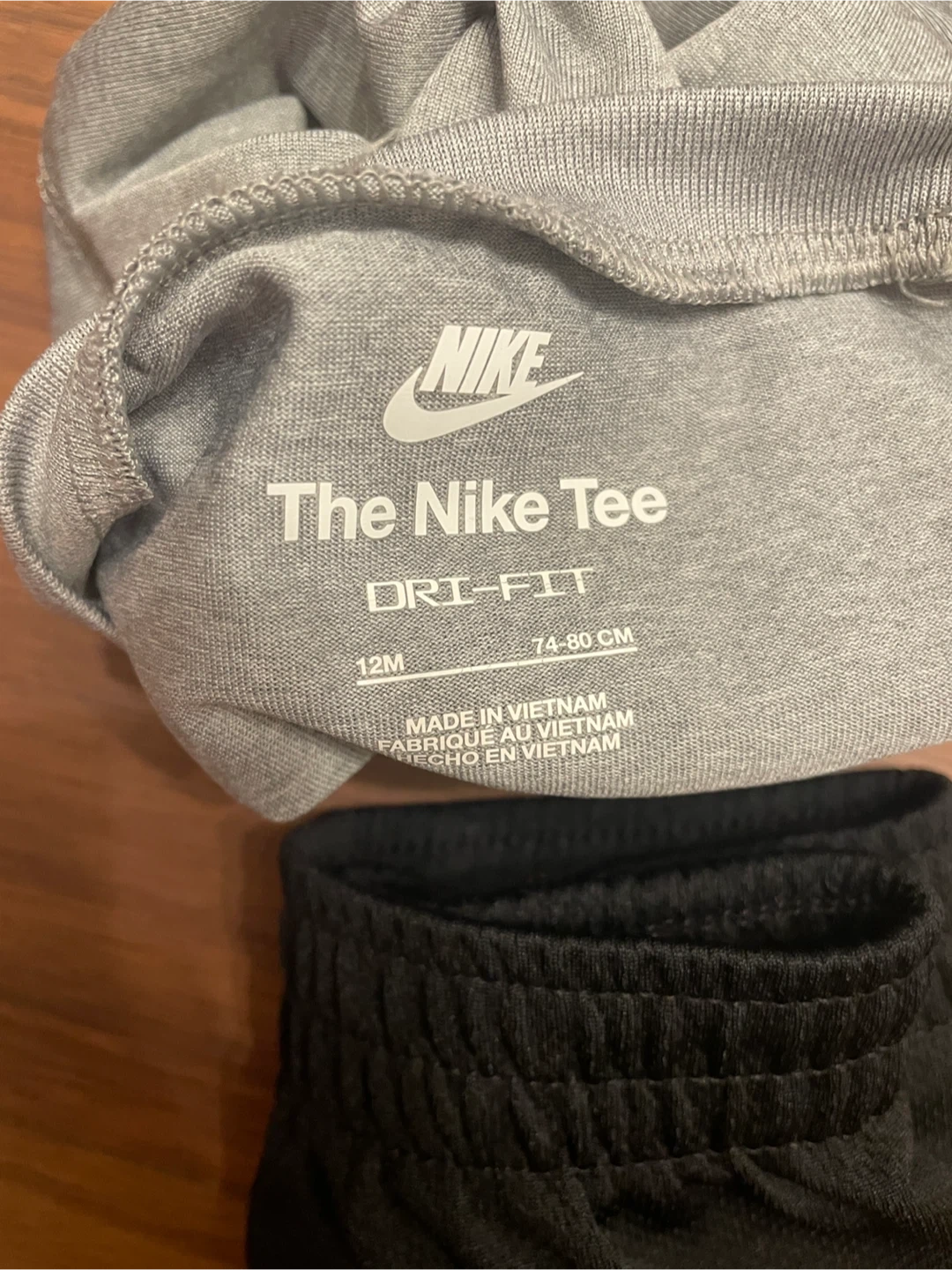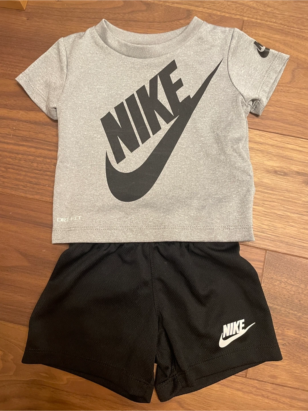 ナイキのベビー服セットアップです ・サイズ:74-80cm ・カラー:トップスはグレー、パンツは黒 ・DRI-FIT素材 ・12M ・使用感少なめ 中古品であることご了承ください 受け渡しは東急東横線多摩川駅の上り下り5駅程度、東急多摩川線全駅でご相談お願いします。