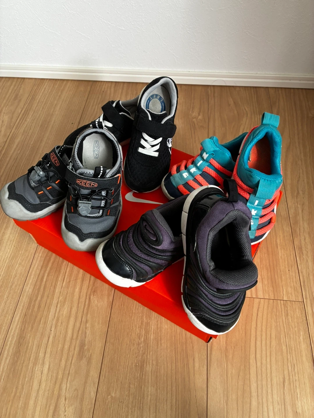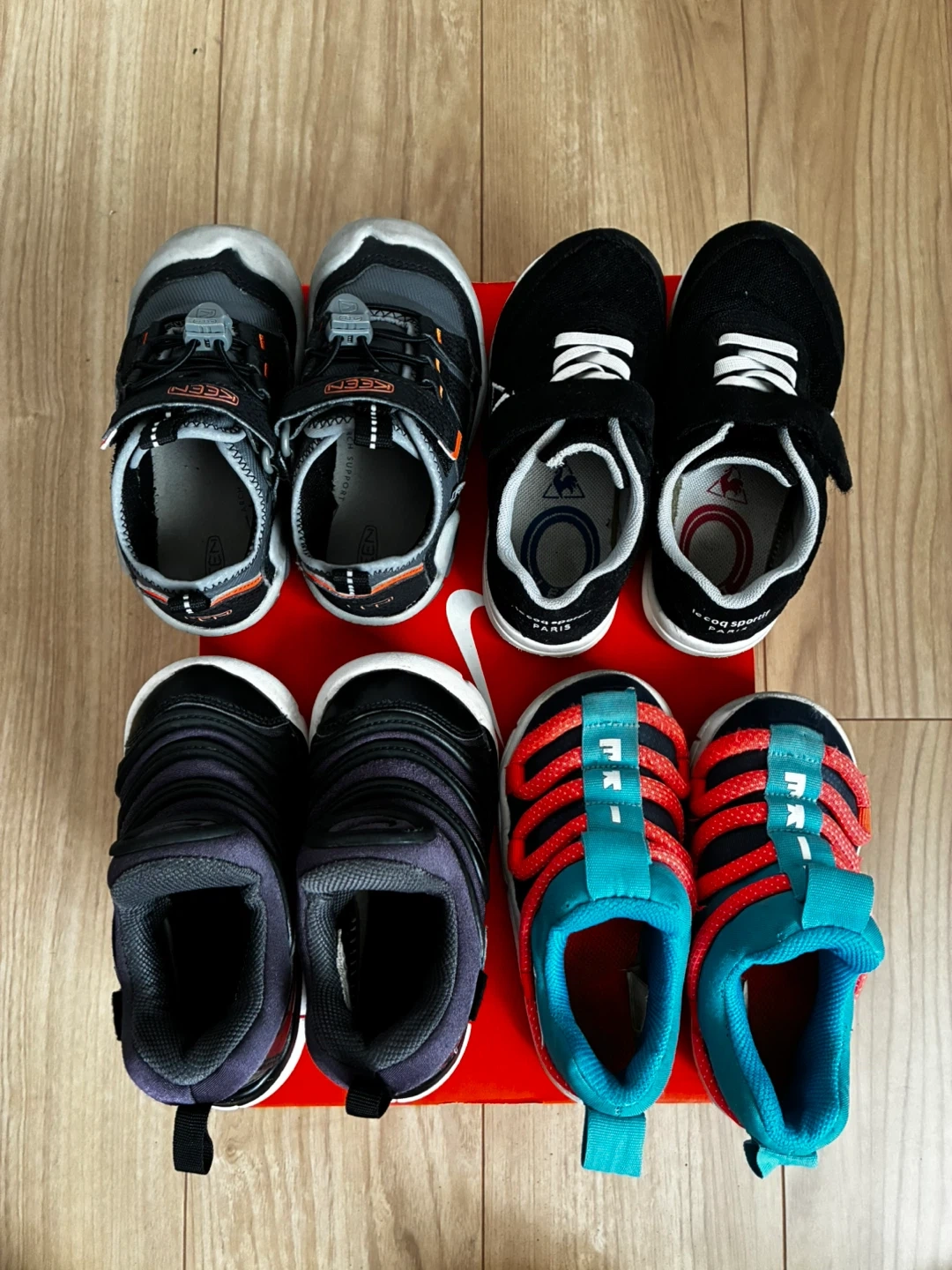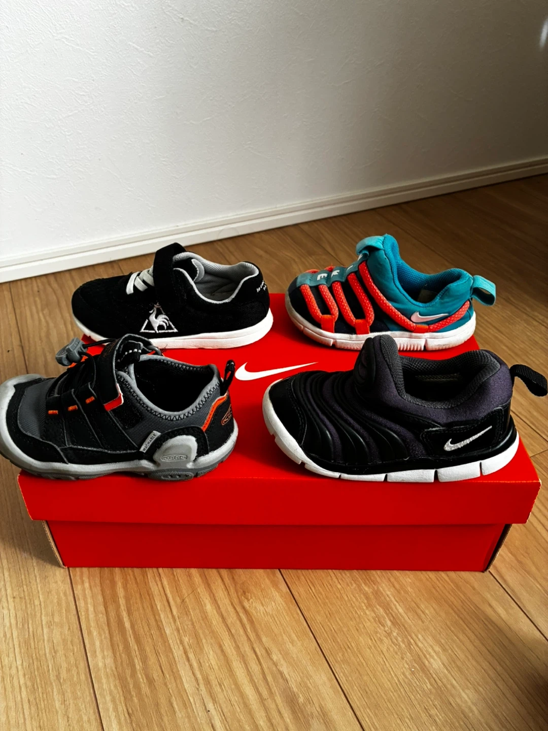 ベビーシューズ4足セットです ・ブランド:ナイキ、ルコックスポルティフ、キーン ・サイズ: ナイキ 黒14㎝ 記載あり ナイキ 水色14〜15㎝サイズ不明 ルコックスポルティフ16㎝ 記載あり (15に近い作りで小さめ) キーン 15㎝ 記載あり (14に近い作りで小さめ) ・ナイキ黒 目立つ破れ等なし。つま先のスレ ・ナイキ水色 つま先スレ、汚れ、破れなし ・ルコックスポルティフ マジックテープ少し弱い、つま先スレまくっ てるが破れなし ・キーン 使用頻度少ない。スレなし、マジック テープ問題なし 黒のナイキ以外名前記入あります。 出来ればまとめて売りたいです。 バラ売りは要相談。 中古品であることご了承ください