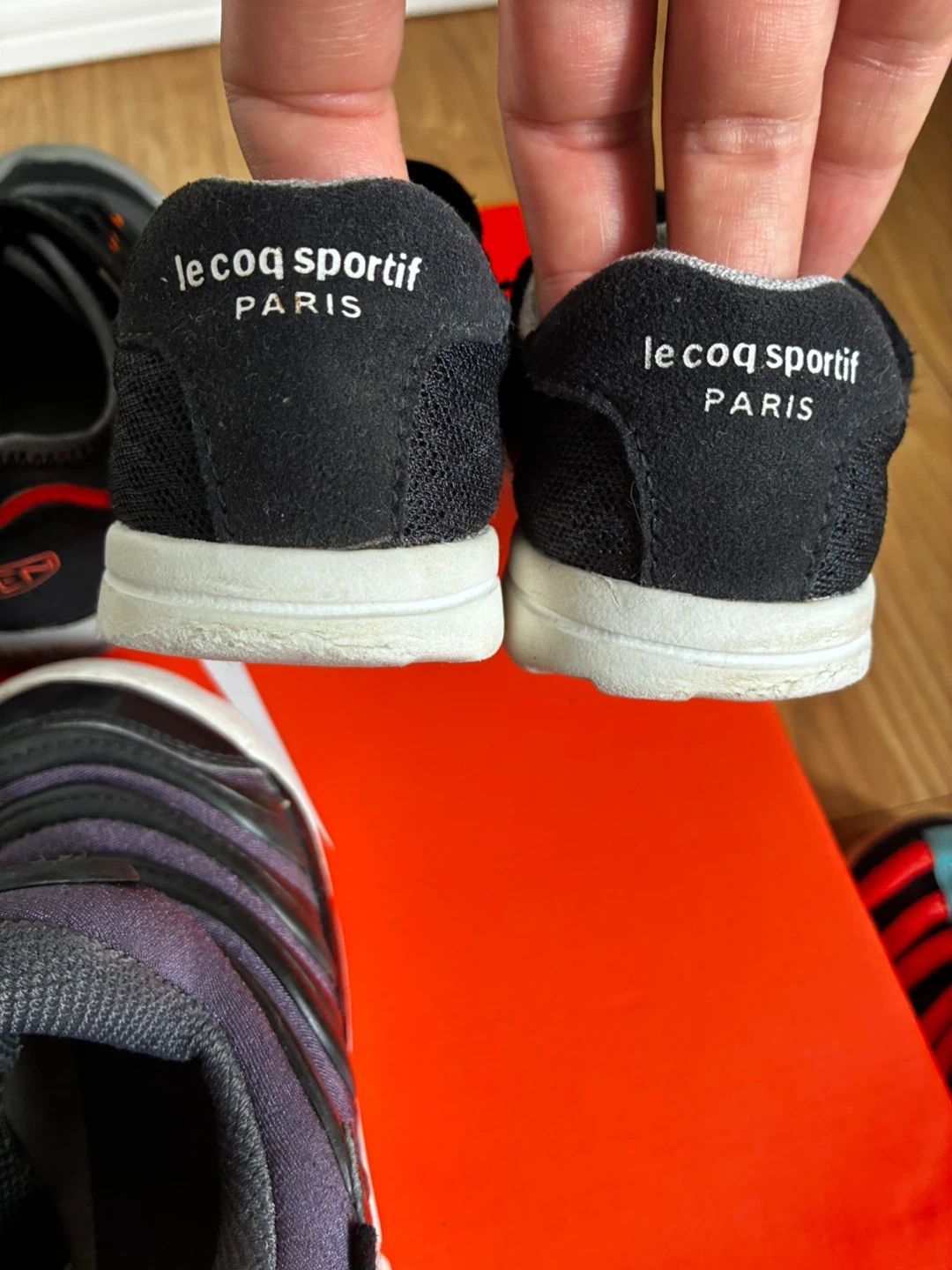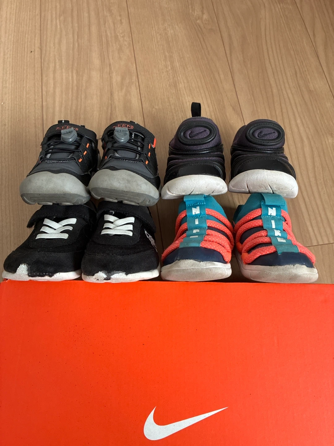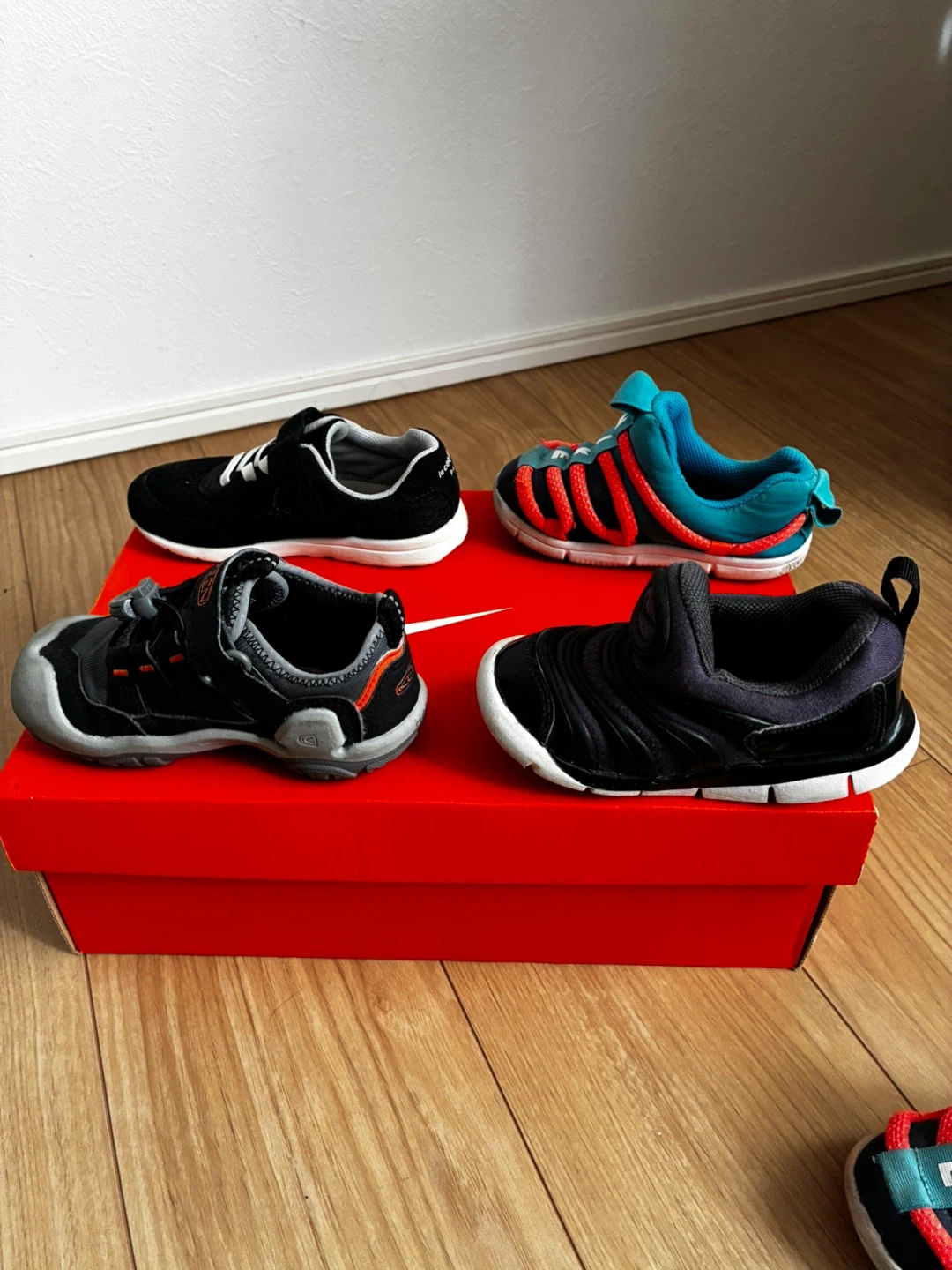ベビーシューズ4足セットです ・ブランド:ナイキ、ルコックスポルティフ、キーン ・サイズ: ナイキ 黒14㎝ 記載あり ナイキ 水色14〜15㎝サイズ不明 ルコックスポルティフ16㎝ 記載あり (15に近い作りで小さめ) キーン 15㎝ 記載あり (14に近い作りで小さめ) ・ナイキ黒 目立つ破れ等なし。つま先のスレ ・ナイキ水色 つま先スレ、汚れ、破れなし ・ルコックスポルティフ マジックテープ少し弱い、つま先スレまくっ てるが破れなし ・キーン 使用頻度少ない。スレなし、マジック テープ問題なし 黒のナイキ以外名前記入あります。 出来ればまとめて売りたいです。 バラ売りは要相談。 中古品であることご了承ください