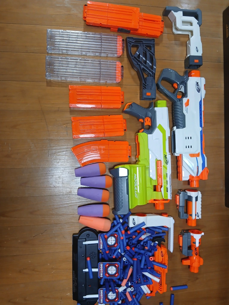 ナーフの銃のまとめ売りです ・ナーフの銃、アタッチメント、弾丸などのセット ・全体的に使用感あり ・傷や汚れあり デモリッシャーなどの色々なものがあります 銃2丁 小銃1丁 アタッチメント5個 マガジン 10弾×1 12弾×2 連結12弾×1 18弾2 電動で立ち上がる的(うるさい) ダーツ多い ロケット5個(羽が全て取れてます) なお電動の銃のネジ穴は潰れていています。 専用?ネジを変えたら行けると思います。 上の白い銃はあんまり期待しない方がいいです ほぼジャンク品みたいなものです。あんまり触ってないですが1様撃てるはずです。 中古品であることご了承くださいm(*_ _)m 分からない点がございましたら御気軽にお申し付けください。少しの値下げも考えています。