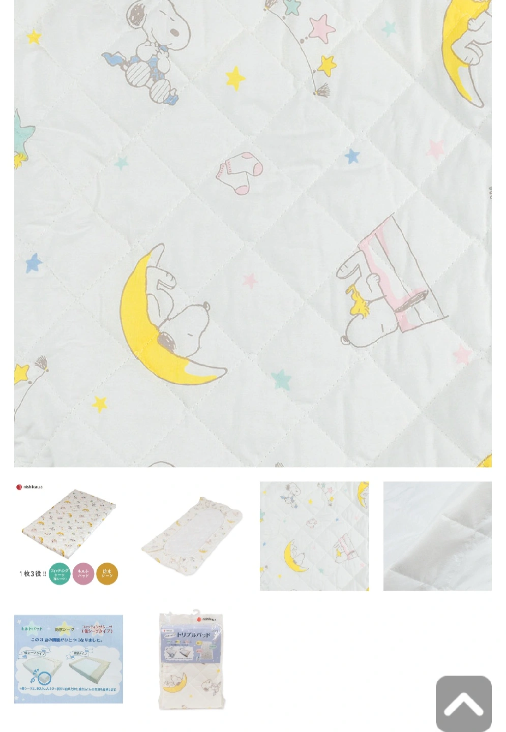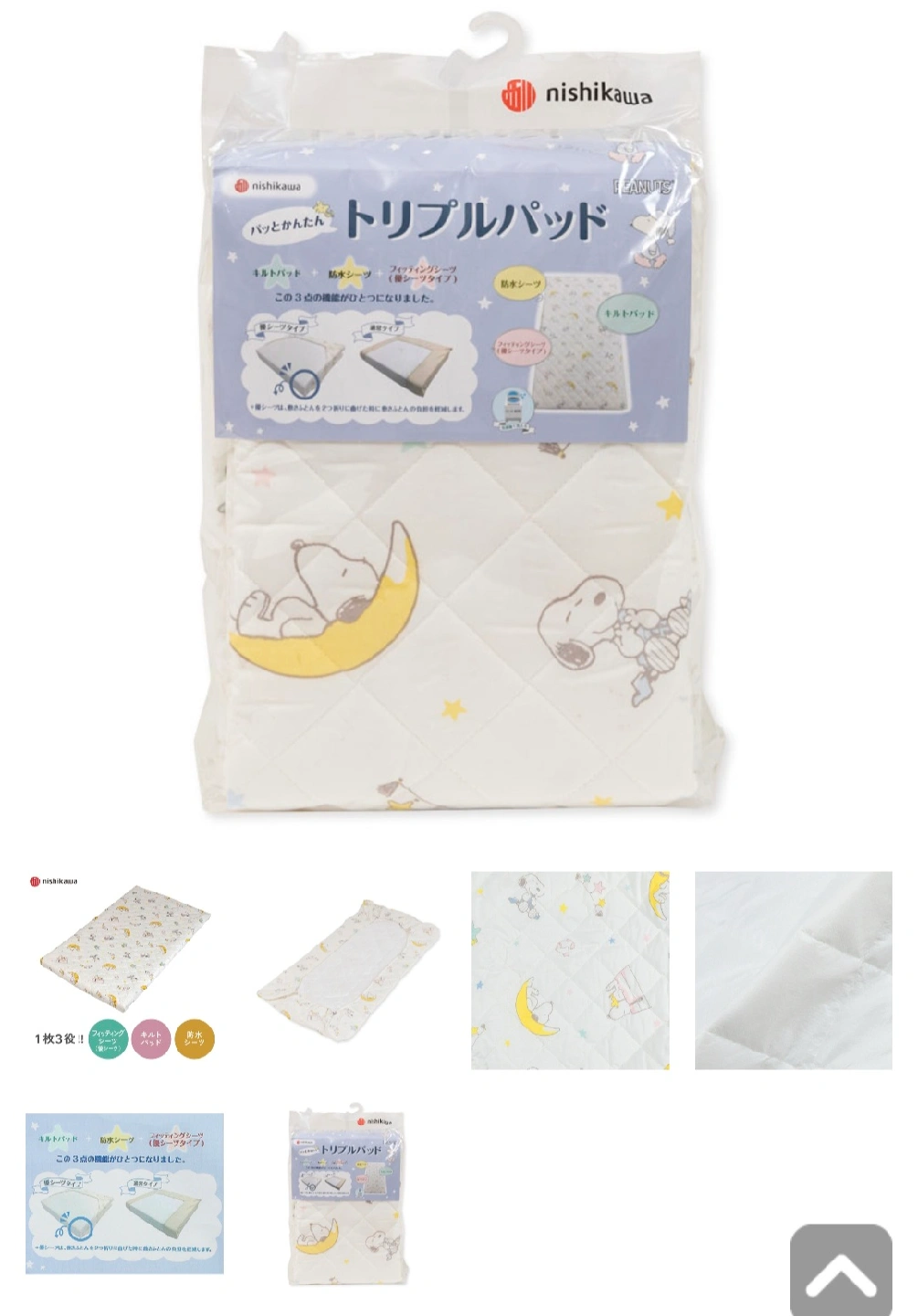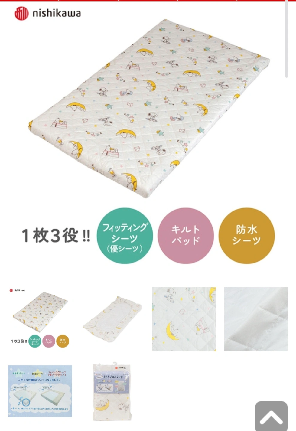 ニシカワのトリプルパッドです 【情報】 ブランド:ニシカワ 商品:トリプルパッド 柄:スヌーピー サイズ:約60×90cm 素材:綿100% 【定価】 税込3,828円 【状態】 未使用品ですが、自宅保管品です。 サイズを間違えて購入してしまい、一度水通しでさらさの洗剤でお洗濯済みのものです。 【その他】 防水シーツ、キルトパッド、フィッティングシーツの3つの機能が1つになりました 洗濯機で洗えます(ネット使用)