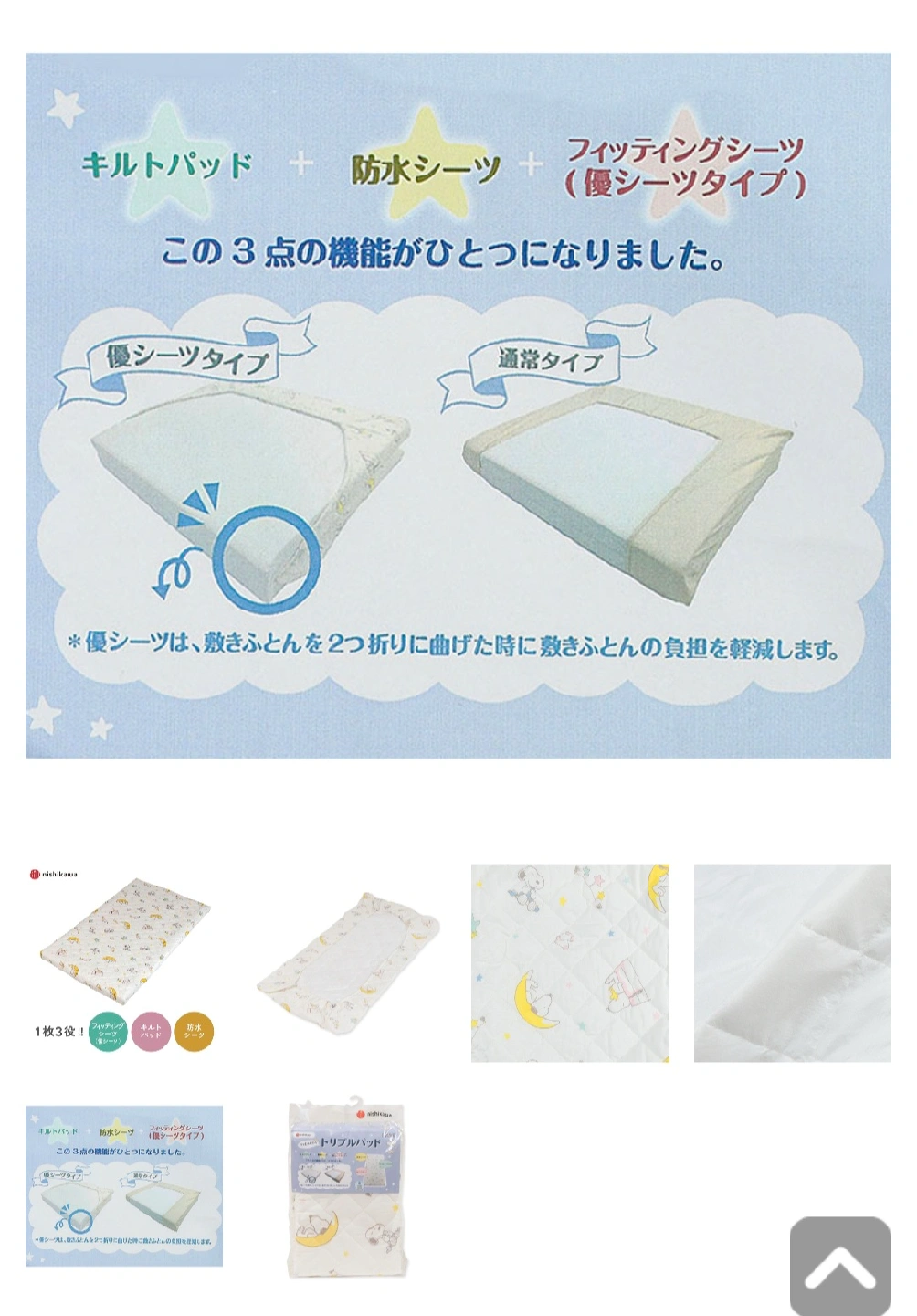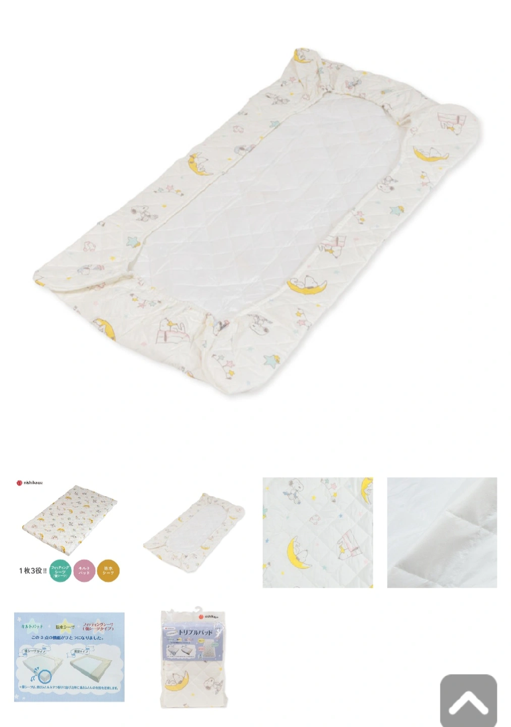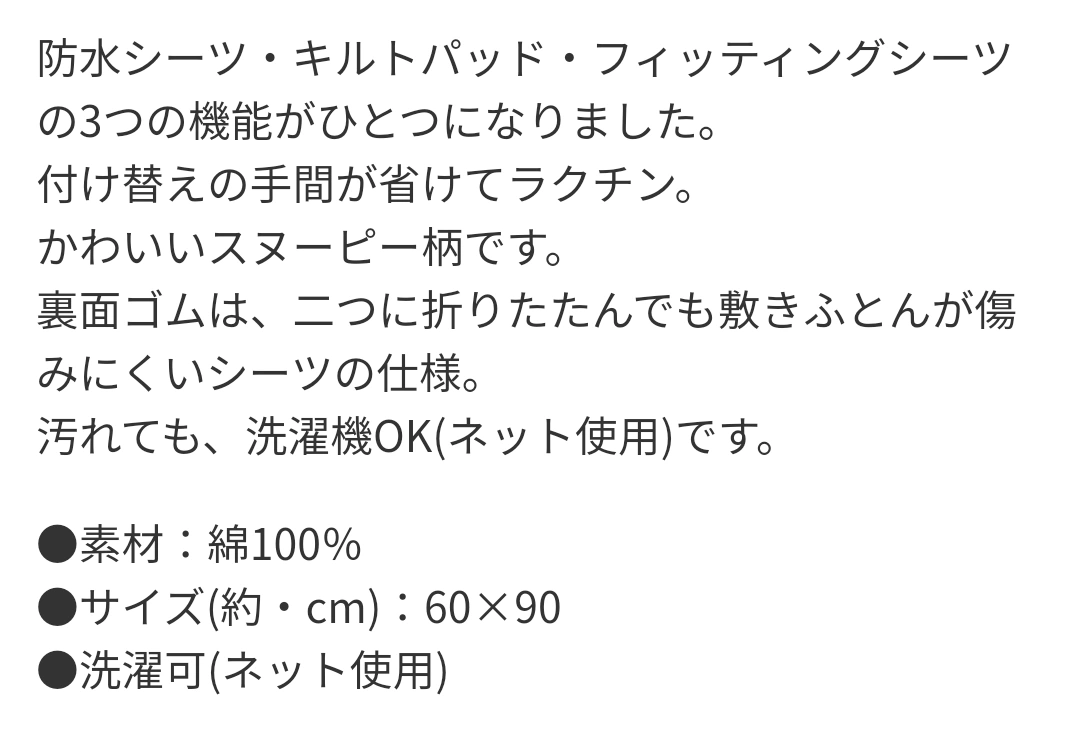 ニシカワのトリプルパッドです 【情報】 ブランド:ニシカワ 商品:トリプルパッド 柄:スヌーピー サイズ:約60×90cm 素材:綿100% 【定価】 税込3,828円 【状態】 未使用品ですが、自宅保管品です。 サイズを間違えて購入してしまい、一度水通しでさらさの洗剤でお洗濯済みのものです。 【その他】 防水シーツ、キルトパッド、フィッティングシーツの3つの機能が1つになりました 洗濯機で洗えます(ネット使用)