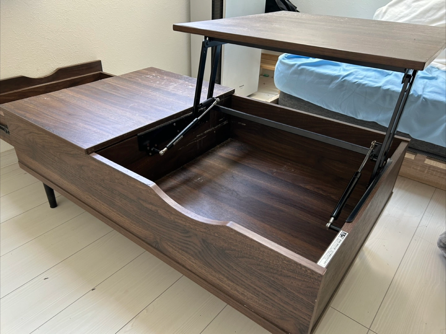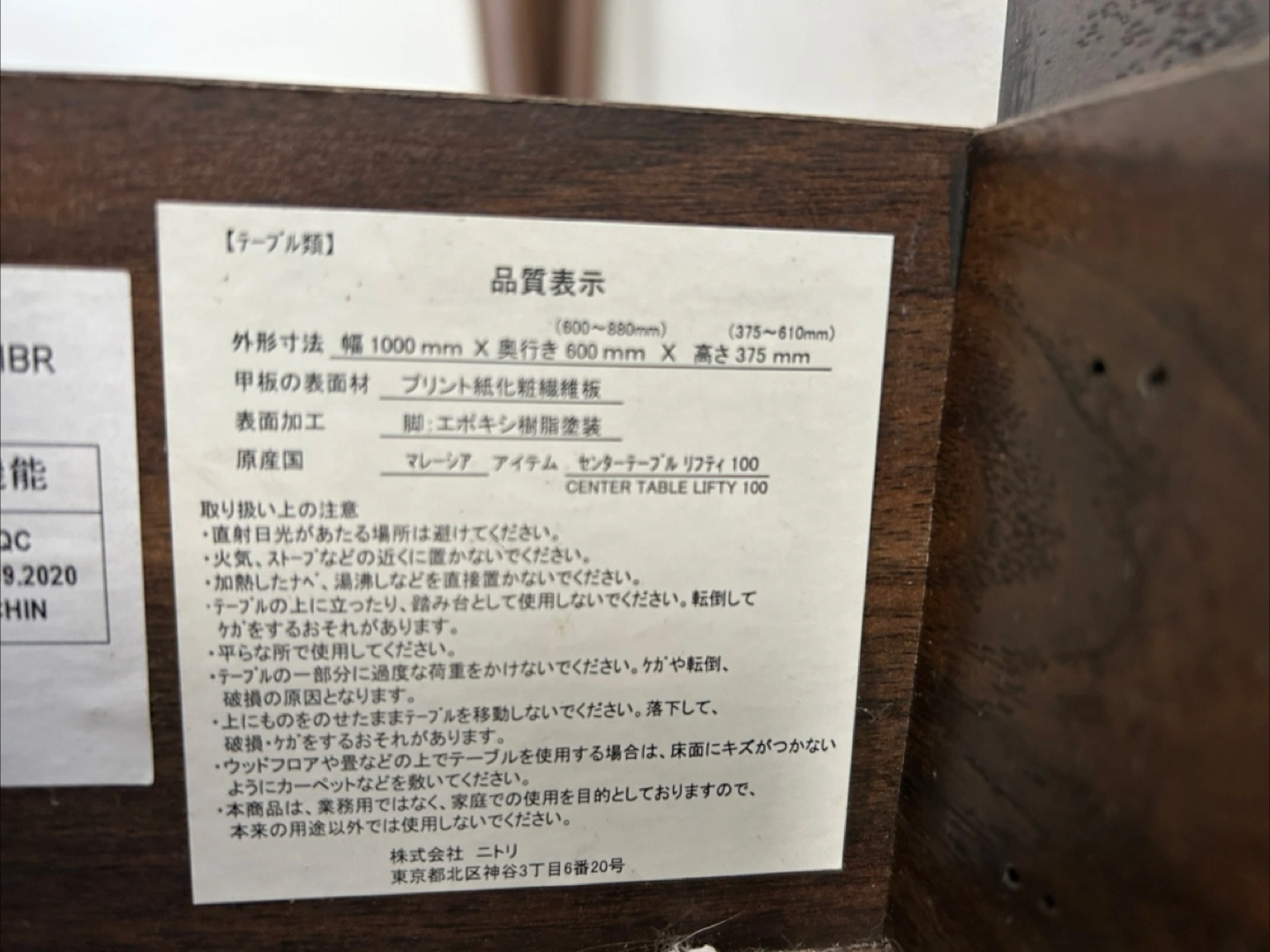 【急募】ニトリのセンターテーブル リフティ100です 【情報】 ブランド:ニトリ 商品名:センターテーブル リフティ100 サイズ:幅1000mm x 奥行き600~880mm x 高さ375~610mm 【状態】 使用感があ ります 天板に傷、汚れが見られます 引越しのため不要になりました。 重いため、車などで引き取り出来る方お願いします。 かなり使用感あり、中古品であることご了承ください