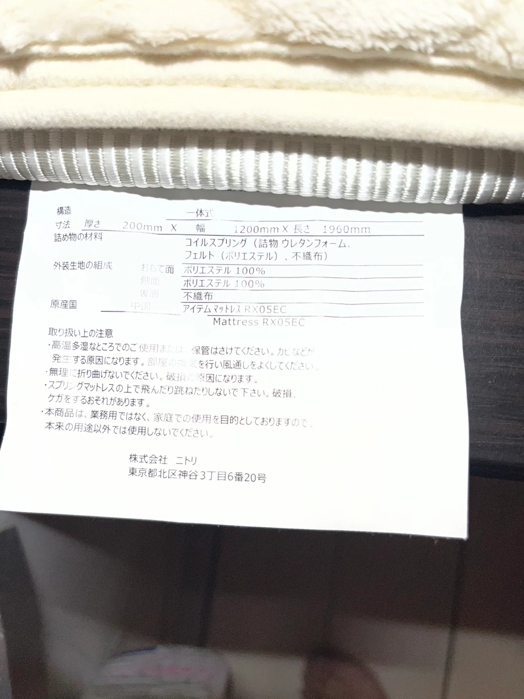ニトリのマットレスです。 【情報】 サイズ:幅1200mm x 長さ1960mm x 厚さ200mm 構造:コイルスプリング、フェルト(ポリエステル)、不織布 外装生地の組成:おもて面・側面 ポリエステル100%、裏面 不織布 原産国:中国 型番:アイテムニトリRX05EC Mattress RX05EC 【状態】 使用期間少なくヘタリ無し 中古品であることご了承ください