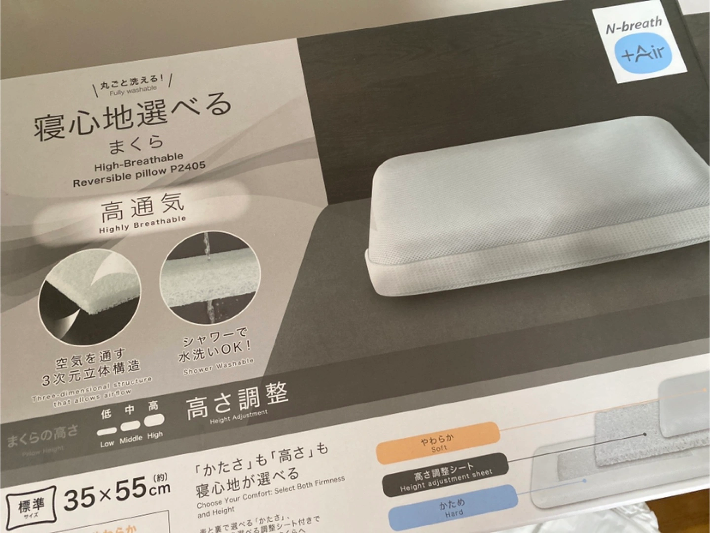 N-breath+Airのまくらです 【情報】 ブランド:N-breath+Air 商品名:まくら 型番:P2405 サイズ:35×55cm 【状態】 1日カバーをかけて使用しましたが 首に合わず出品します。目立ったよごれはなし。 中古品であることご了承ください。
