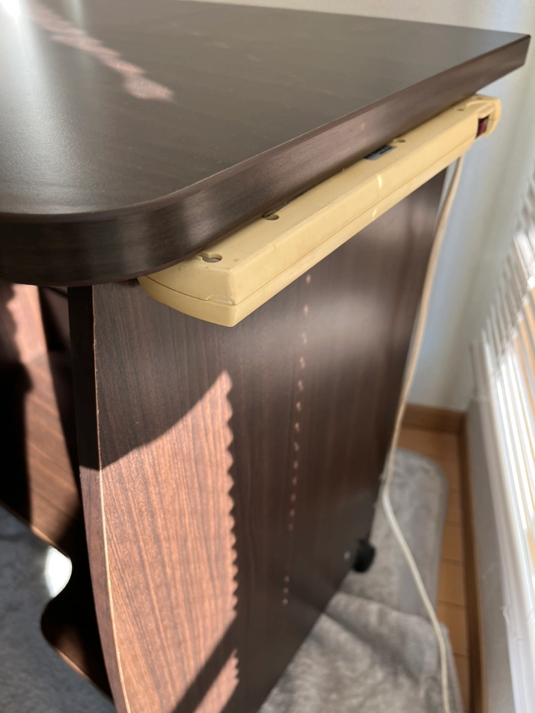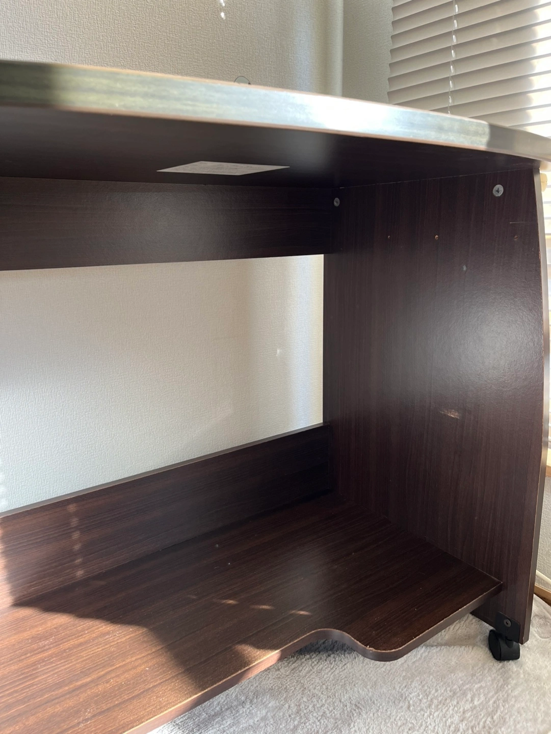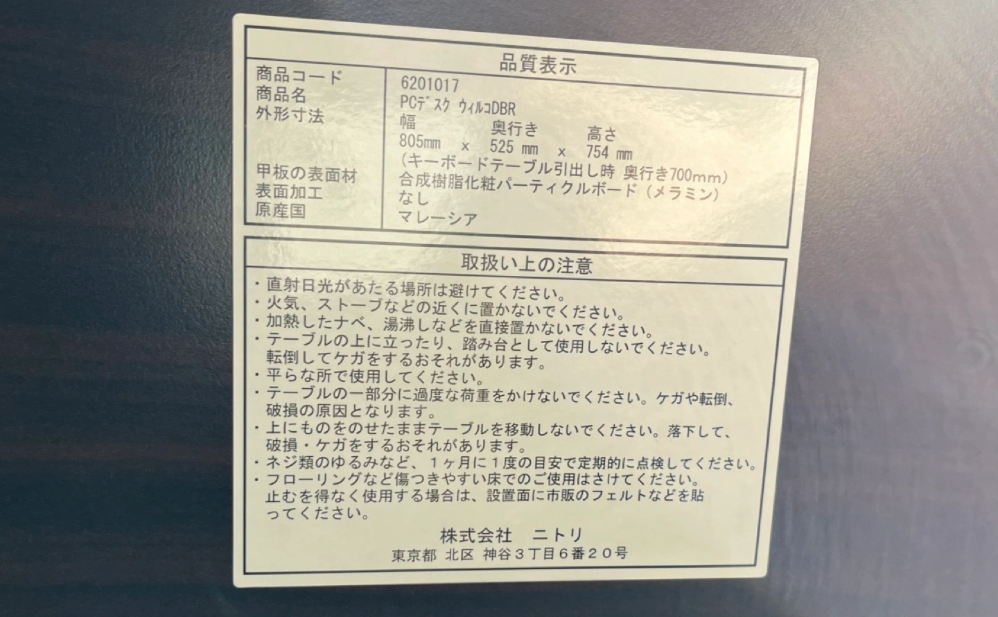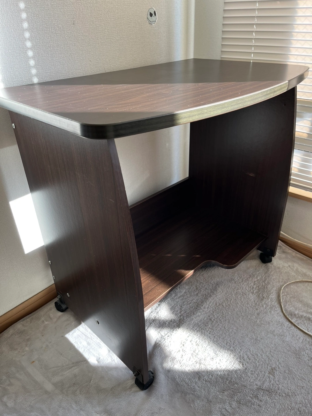 ニトリで購入したPCデスクです。 キーボード置き場が付いていましたが、破損して取り外してしまいました。 10年以上前に購入しました。 右脇に電源タップを魔法のテープでつけて外せなくなりました。古いモノですが、使える状態です。 素材:合成脂化粧パーティクルボード(メラミン サイズ:幅805mm x 奥行525mm x 高さ754mm 中古品であるという ことをご了承の上、ご購入ください。 ご不明点等ございましたらご連絡ください。
