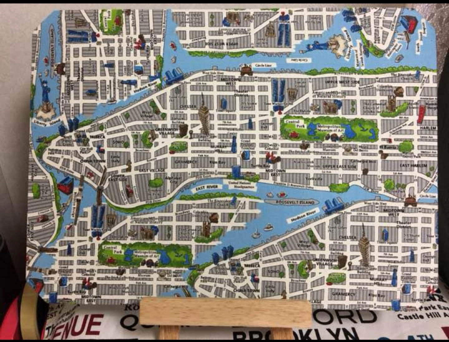 厚紙を利用して作成した素人の ハンドメイド作品です。 ニューヨーク・マンハッタンの 見所が描かれた 地図柄、modaの生地で 作成しております。 ニューヨーク好きの方、 また思い出をお持ちの方、 いかがでしょうか? #キャロットで新生活 大きさは、 横幅約37.5センチ 縦約27.5センチです。 イーゼルに立てかけて使うもよし、 リボンを付けてありますので、 吊り下げても使えます。 厚紙を利用して、作成しておりますゆえ 湿気に弱いので、 ご理解のほどをお願いします。 また、素人のハンドメイドと なりますので、 細かい点を気になさる方のご購入は お控えくださいませ。 また、写真内のイーゼルは、 含まれません。 手渡しのみです。 引き渡し場所は、 産業能率大学付近、自由が丘駅、 九品仏駅、尾山台図書館、 西友目黒通り店や 自由が丘駅から産業能率大学までの 道のりの途中でも構いません。 コメント欄にて、ご希望を お知らせください。