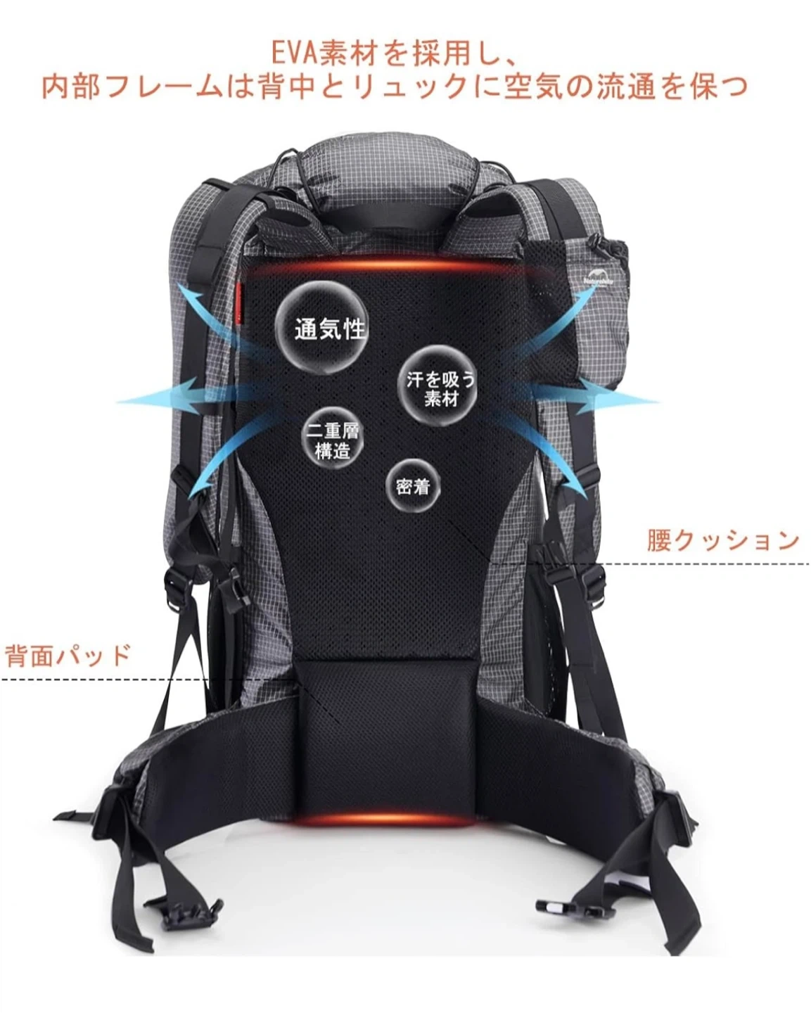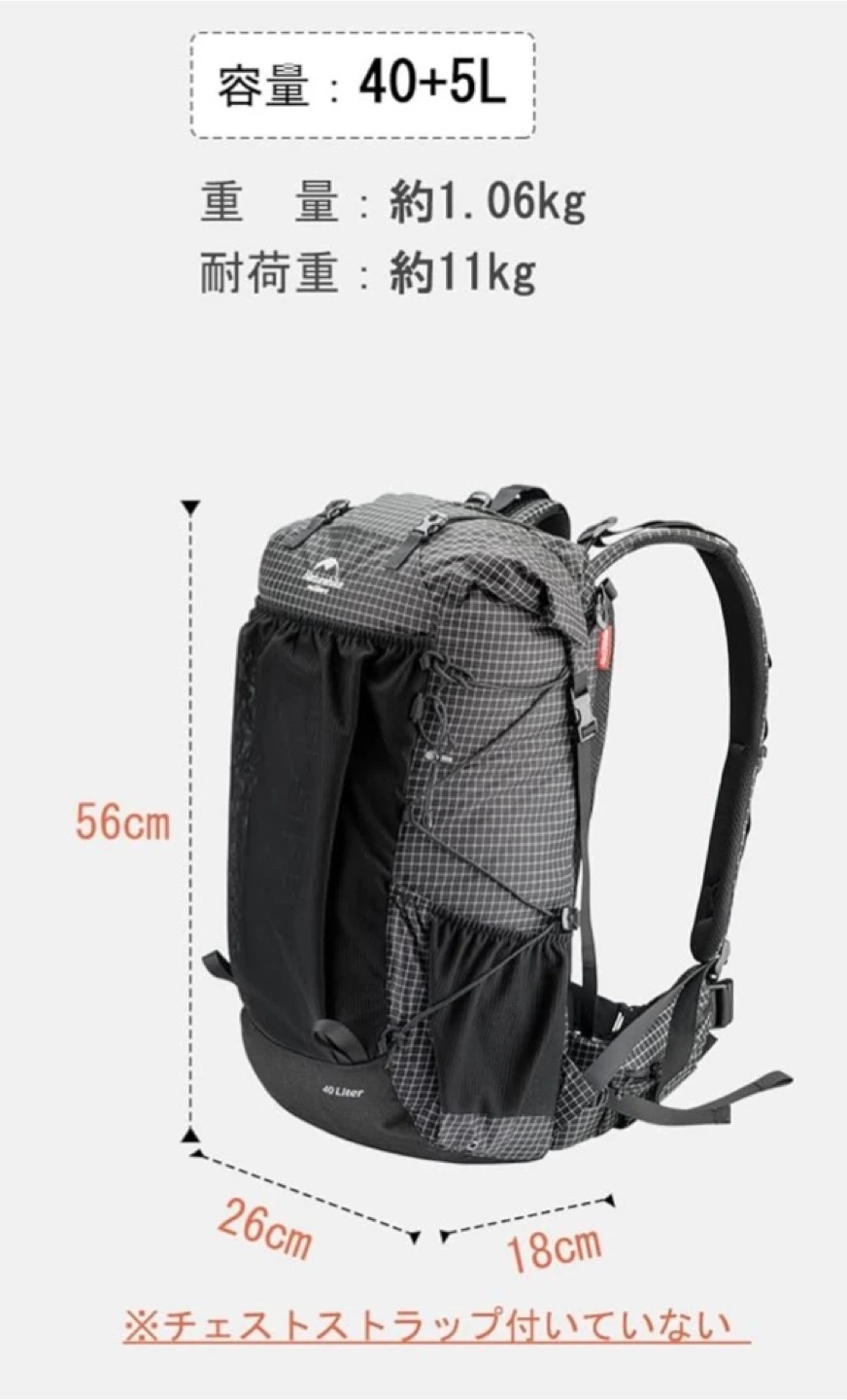 ネイチャーハイクのリュックです 【情報】 ブランド:ネイチャーハイク 容量:60L(40+5Lと記載あり) サイズ:56cm x 26cm x 18cm(画像参照) 【状態】 使用感は少ないです 【付属品】 レインカバー 【40L+5L大容量】 サイズ:縦56cm×横26cm×幅18cm 重量:約1.06kg 耐荷重:約11kg 背面長 : 56cm 登山、ハイキングやキャンプやなどに適します。注意:40Lにはチェストベルトが付いていません。 【多機能】 上部と両側にロープが付いていて必要に応じてトレッキングポールやマットレスをバインドできて、ロープも1.5mmから3.5mmに変更できます。 肩ベルトや側面の収納袋にはスマホ、水袋などを収納できます。 【人間工学デザイン】 人間工学に基づいて設計された背面パッドと肩クッションは、絶妙な厚さで肩への食い込みを軽減。 背面パッドは通気性に優れたメッシュクッションの構造で、長時間使用してもムレにくく快適に着用が可能。 パックの背部はフレーム構造を備え、重量を全身で分散するので背中や両肩への負担を軽減します。 長時間背負っても疲れにくく、快適な背負い心地を確保します。 【アルミニウム合金フレーム】 バックパネルにアルミニウム合金フレームを縫い合わせられます。バックパネルにもっと強い支持力を与えます。 【レインカバー付き】 雨天時にリュックを覆うレインカバーが付属しているので、カバーを買う必要がなくなります。リュックの下にレインカバーポケットがあって、取り出しや収納にも便利です。 中古品であることご了承ください