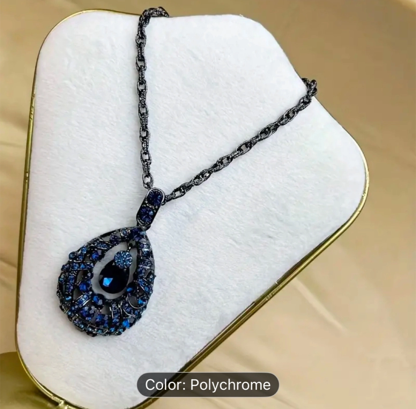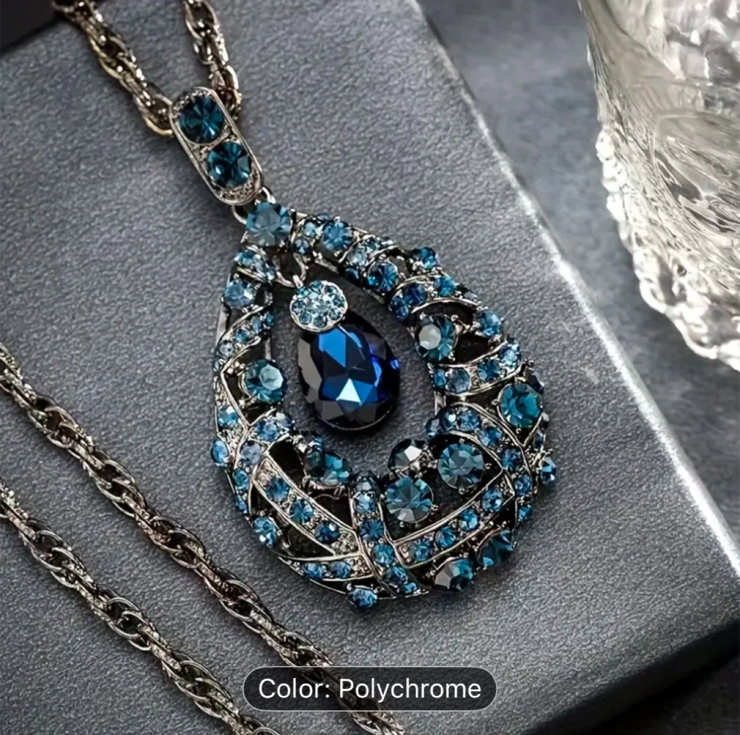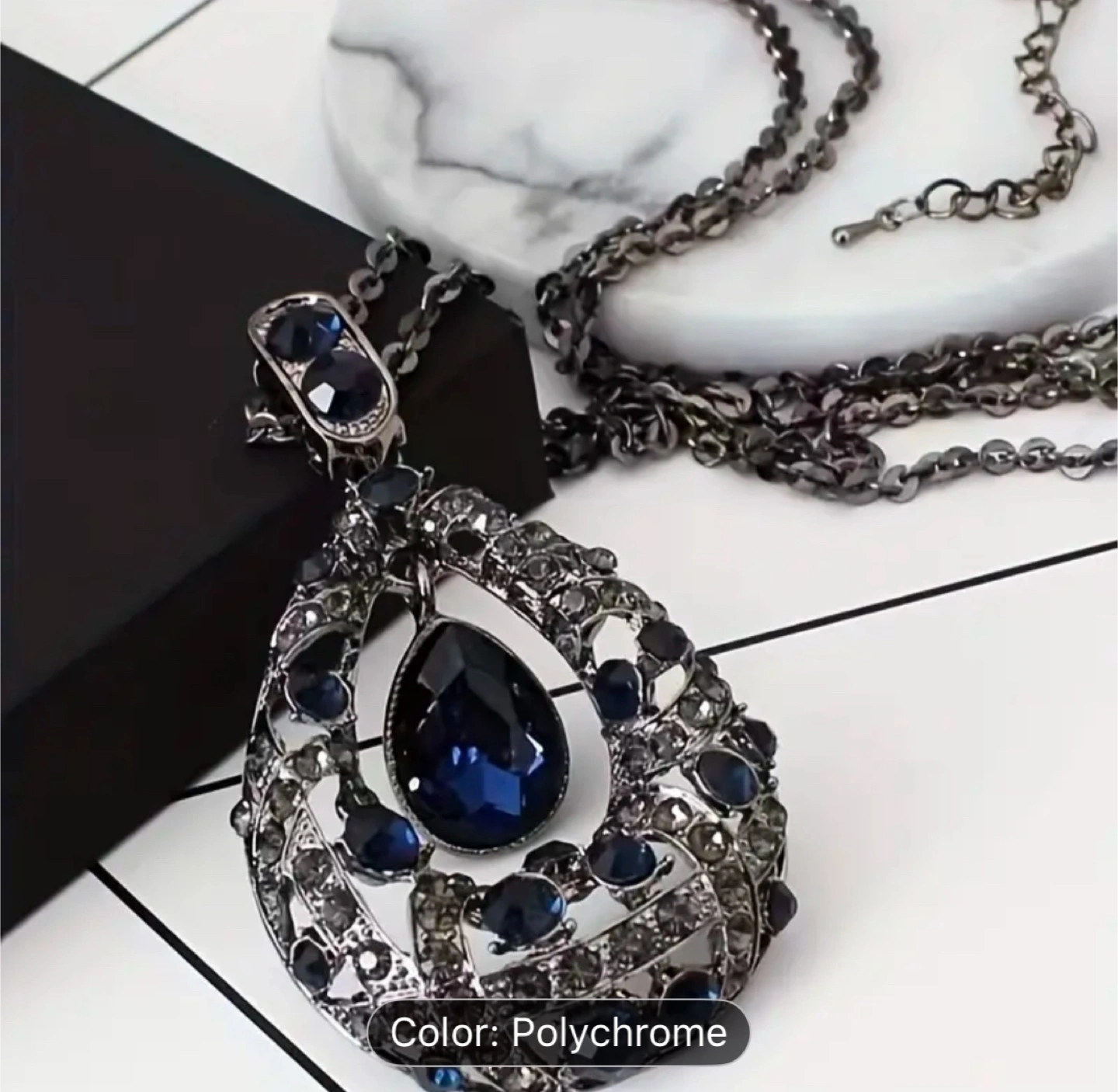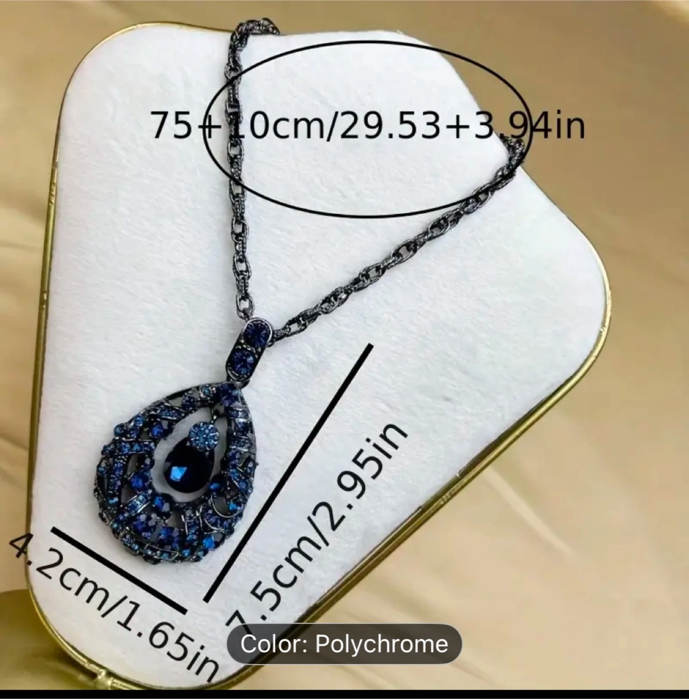 ・カラー:ブルー ・ドロップ型ペンダント ・チェーン長さ:75+10cm ・ペンダントサイズ:約7.5×4.2cm Elegant Sexy Zinc Alloy Teardrop Pendant Enhancer with Rhinestone Accents – No Plating Long Sweater Chain Necklace for Women, Versatile for Daily and Gift Occasions – 1pc