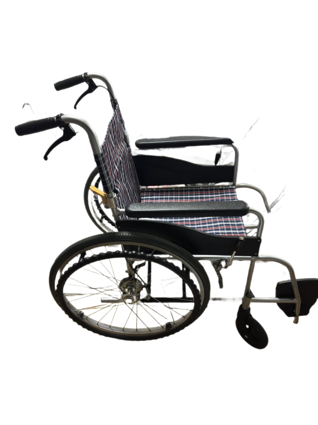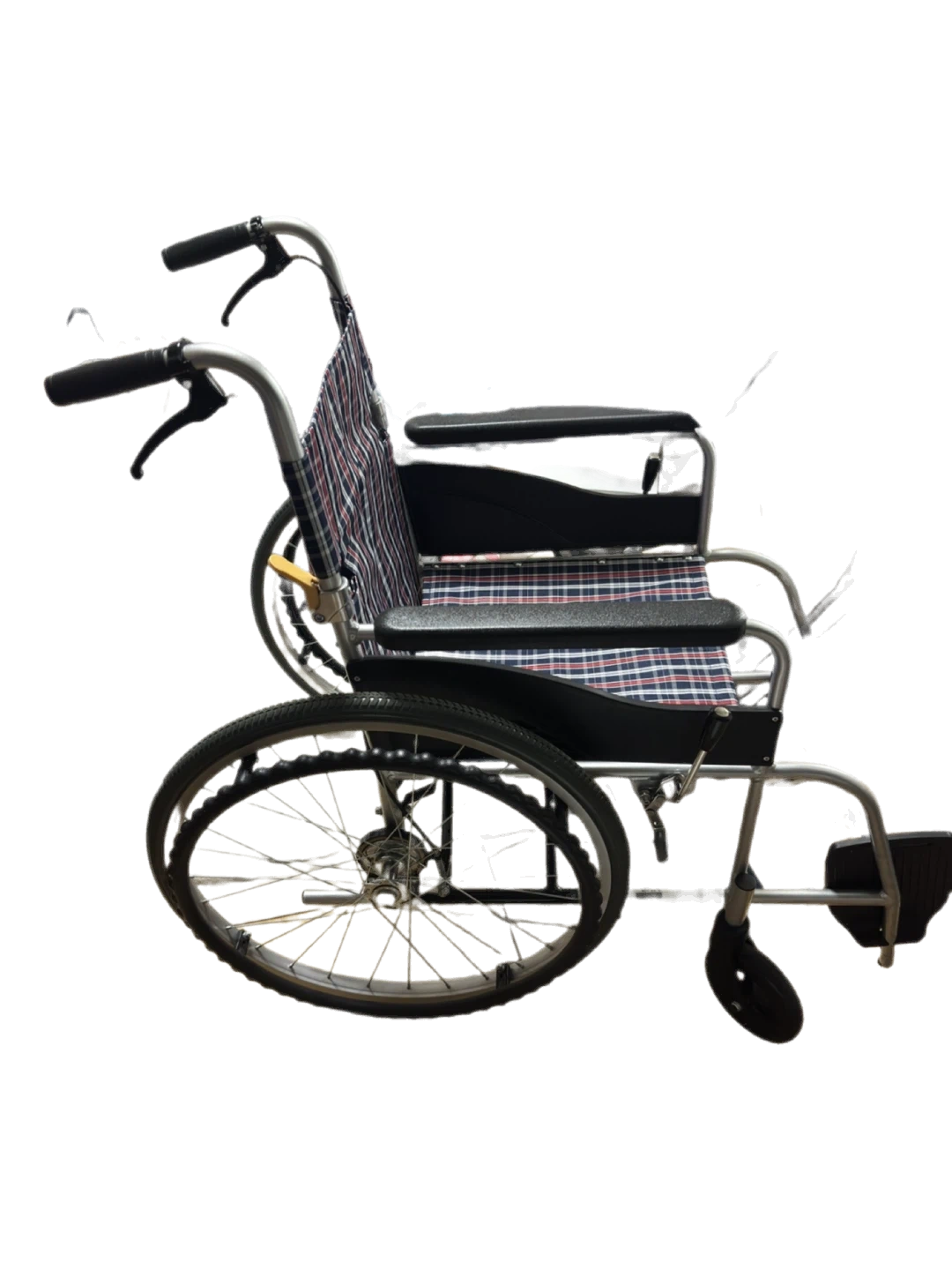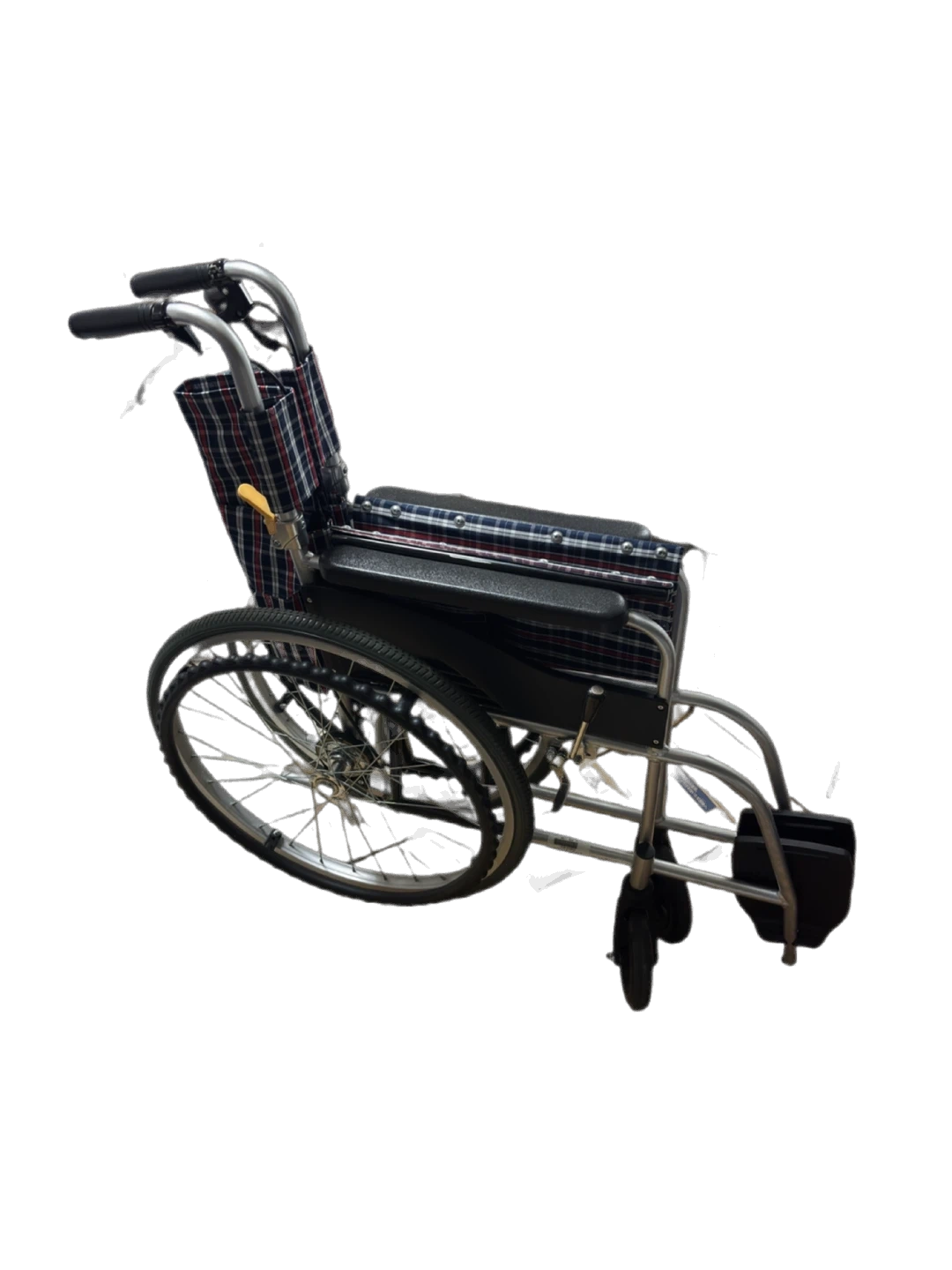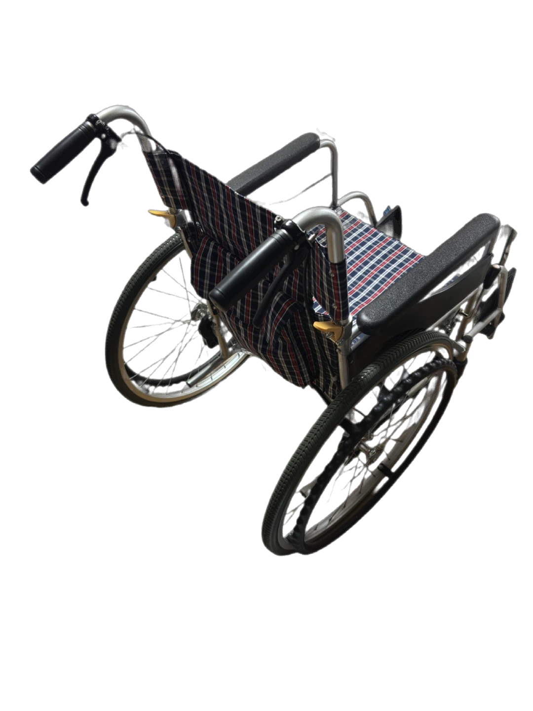 ステンレス製のノーパンクタイヤの自走式車椅子です。 ・ノーパンクタイヤ ・チェック柄 ・ステンレスのシルバーフレーム ・背部にポケット付 ・リユース品のタイヤ交換での購入ですが、月に1度程度しか使っていなかったので、比較的キレイな方だと思いますが、中古品・ランクB程度であること、そちらも私の私感である事をご了承ください。 ですので、神経質な方は購入をご遠慮下さい。 多方面で併売中ですので、在庫確認をお願い致します。