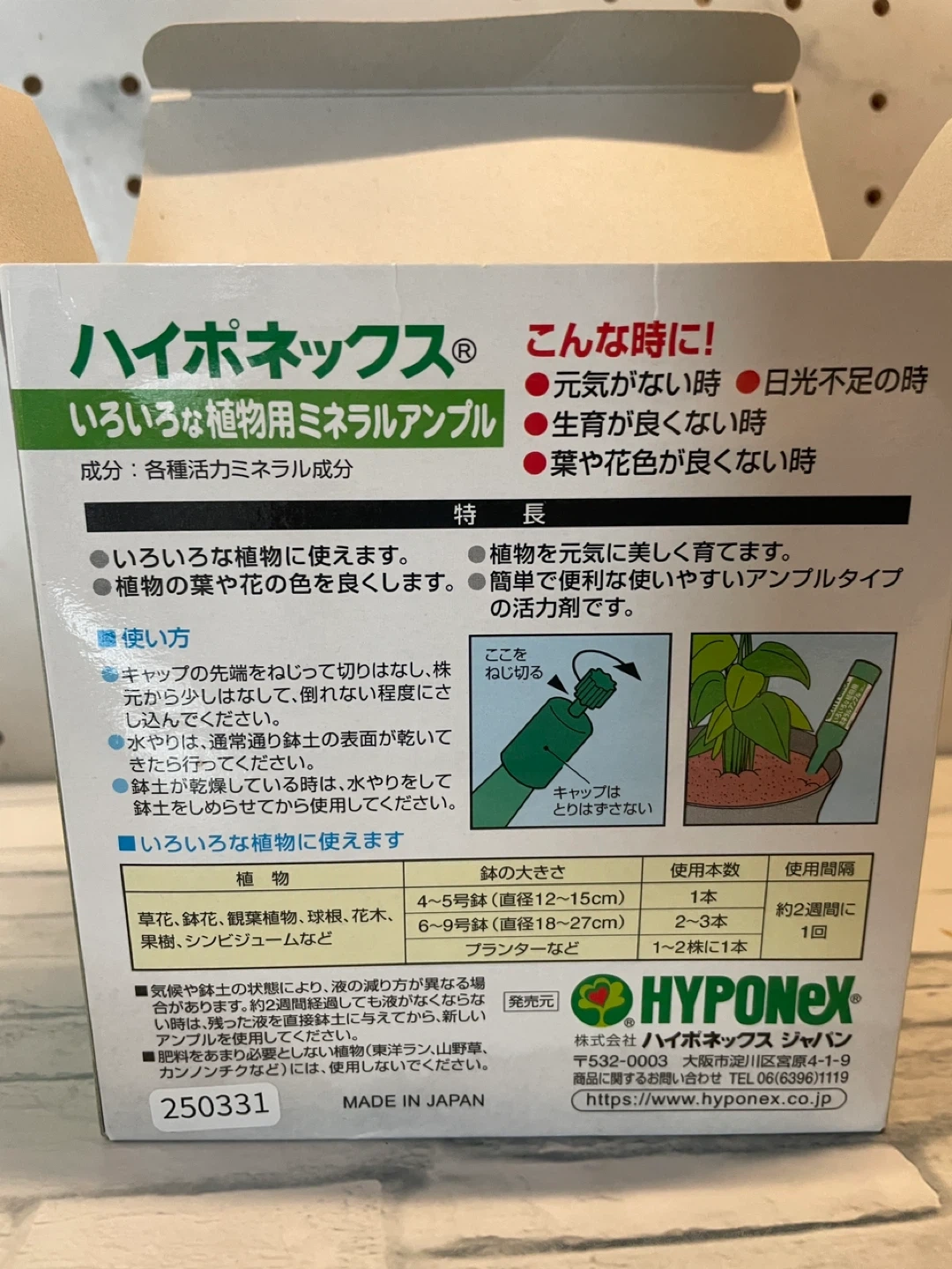 ハイポネックスの植物用ミネラルアンプルです。 未使用が7本です。 【情報】 ブランド:ハイポネックス 内容量:30ml × 10本入り 【状態】 新品 中古品であることご了承ください