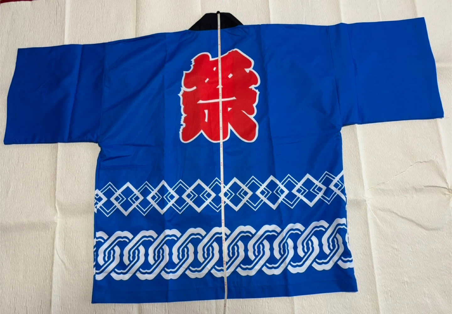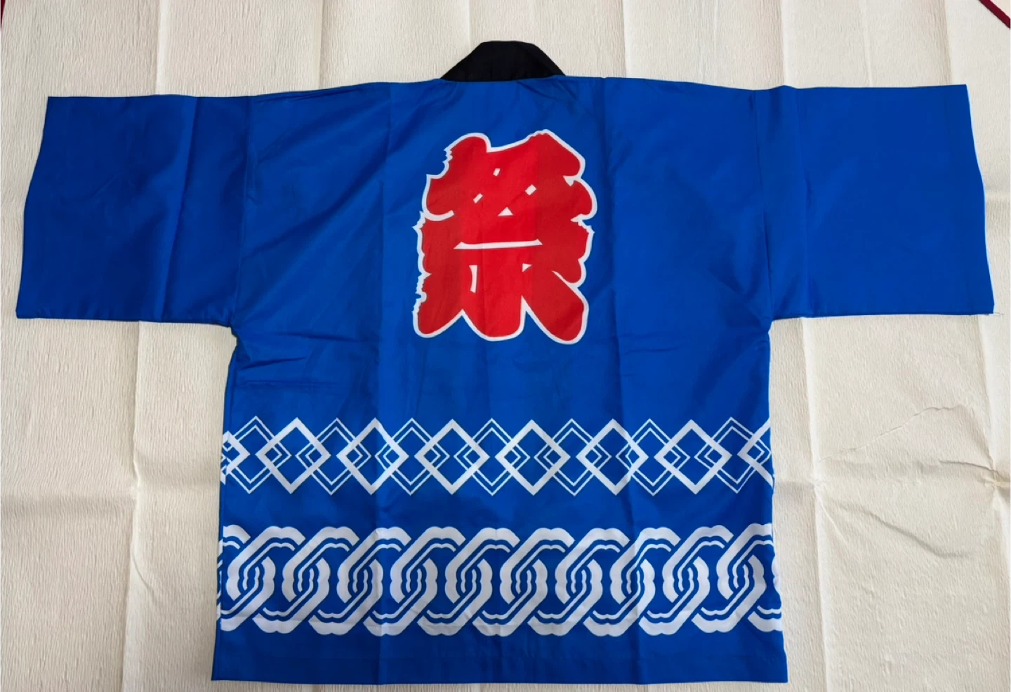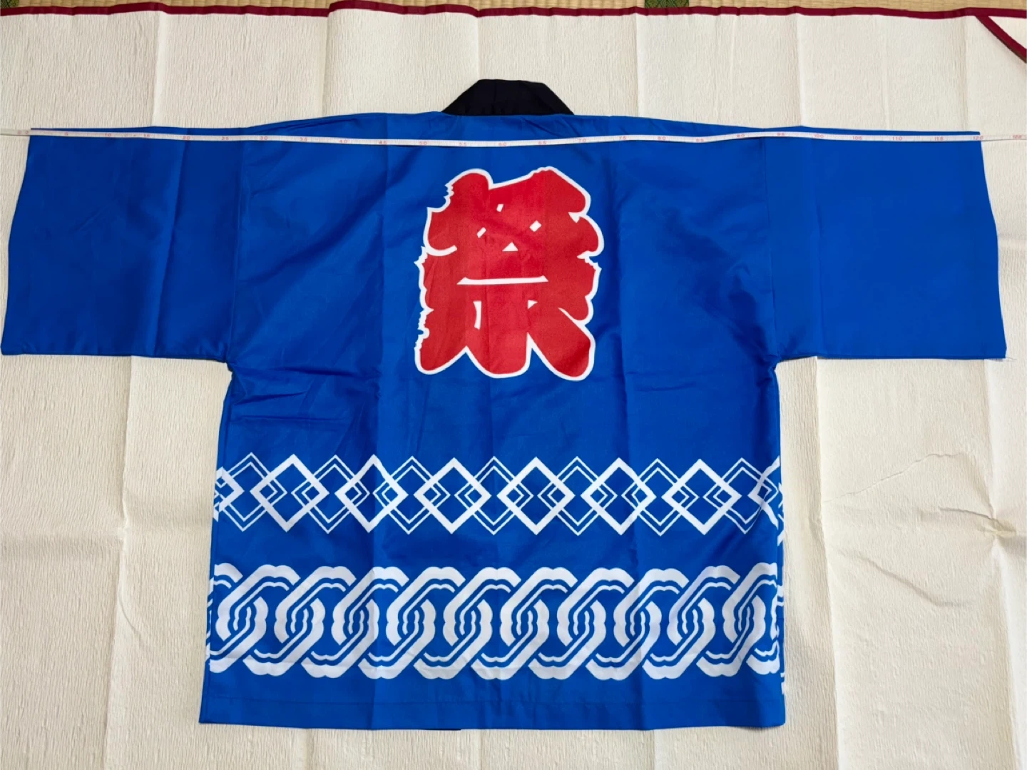 イベント用のハッピ、腰ひも付き(新品未使用) ・色:青 ・赤い「祭」の文字入り ・素材:ポリエステル100% ・サイズ:男女兼用Mサイズ ・身幅:74cm ・身丈:64cm ・袖から袖:120cm 試着1回のみ、サイズ計測のため袋から出しました。 秋のお祭シーズンに活躍の1枚、ポリエステルのためお洗濯も楽々ですよ。 中古品であることご了承ください。