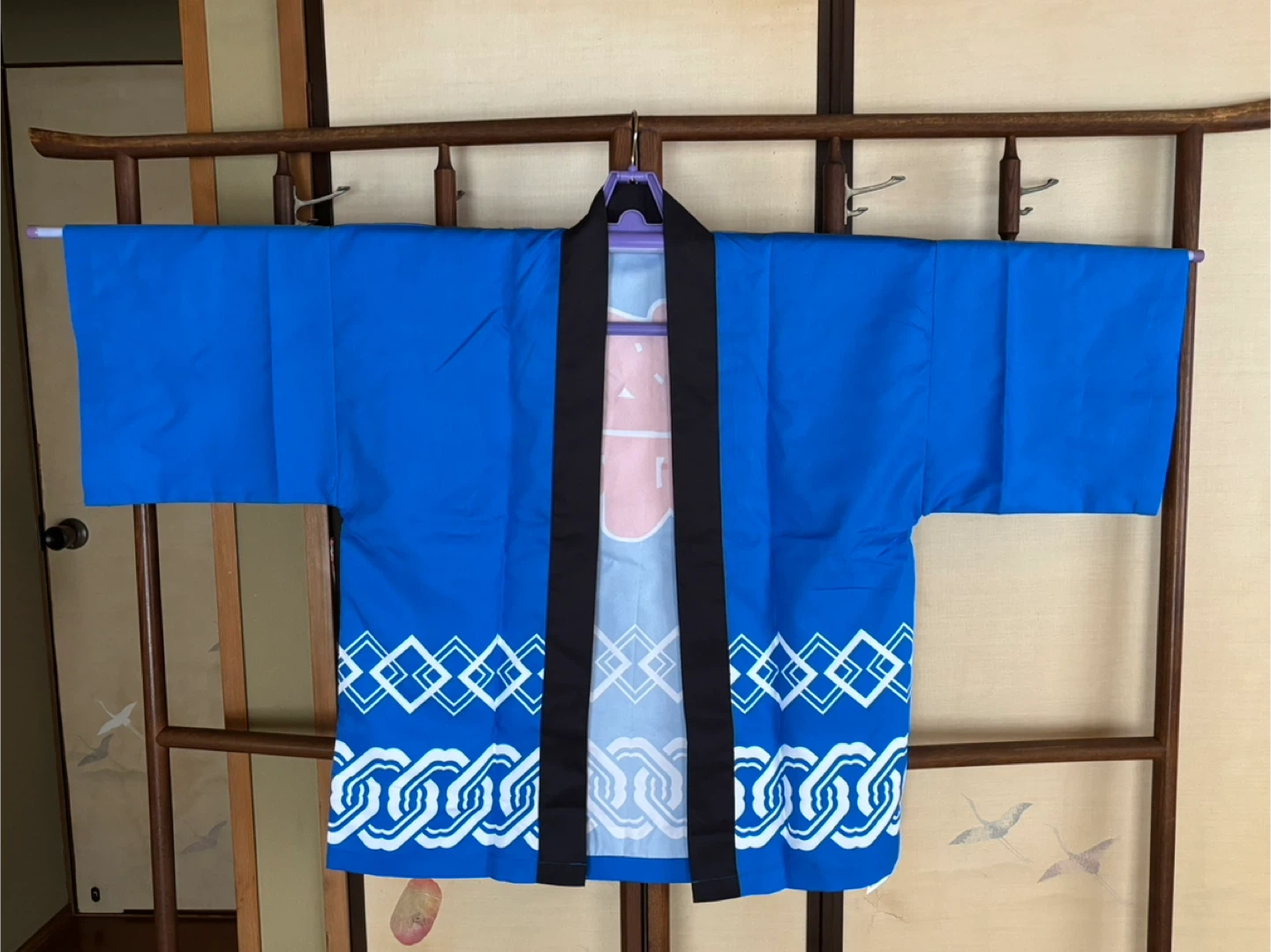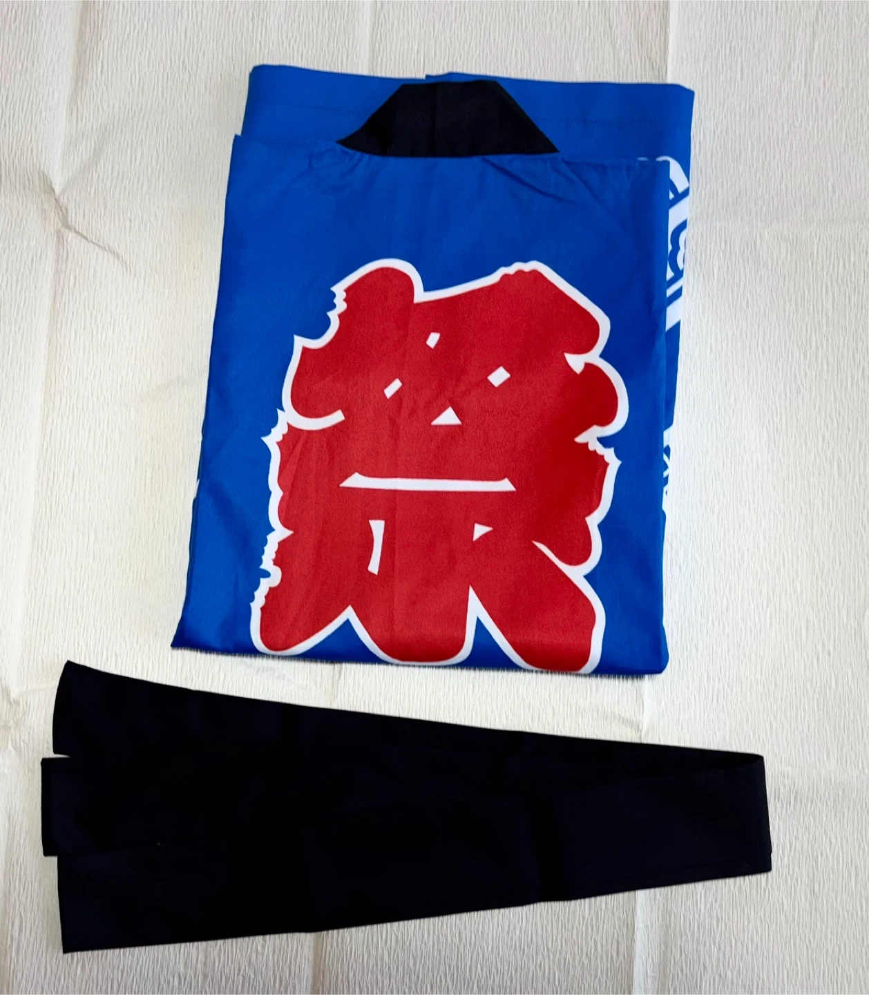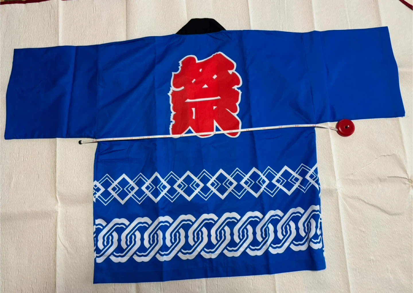 イベント用のハッピ、腰ひも付き(新品未使用) ・色:青 ・赤い「祭」の文字入り ・素材:ポリエステル100% ・サイズ:男女兼用Mサイズ ・身幅:74cm ・身丈:64cm ・袖から袖:120cm 試着1回のみ、サイズ計測のため袋から出しました。 秋のお祭シーズンに活躍の1枚、ポリエステルのためお洗濯も楽々ですよ。 中古品であることご了承ください。