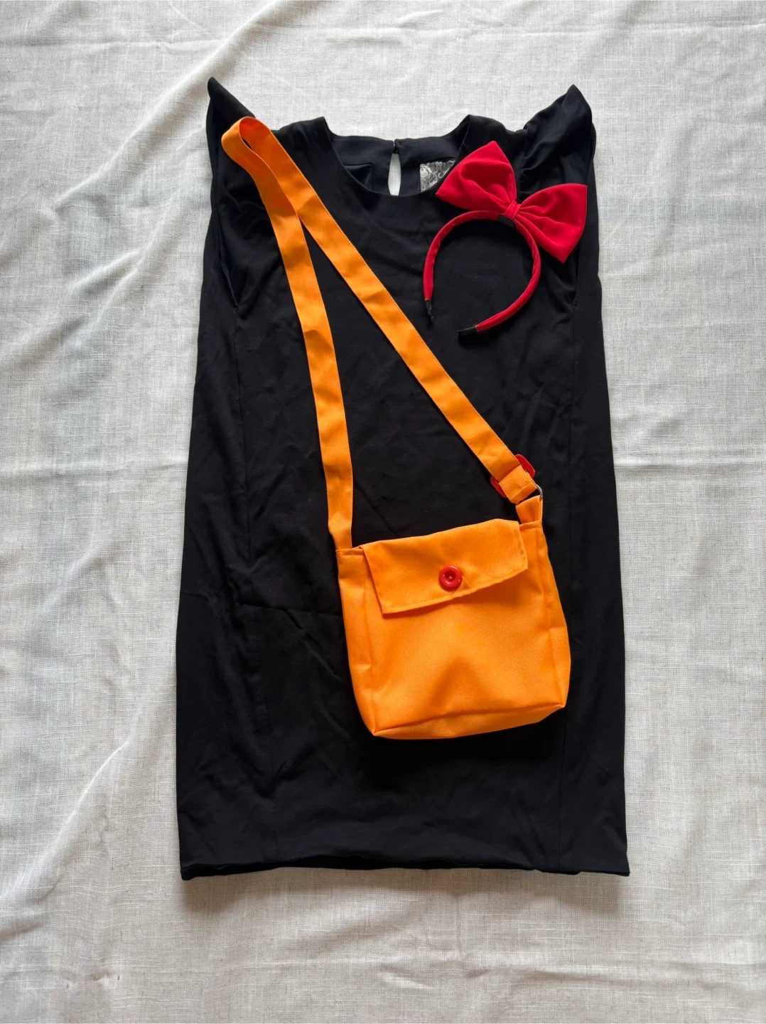 ハロウィン魔法使い風セット ・ワンピースの色:黒 ・バッグの色:オレンジ ・ヘアバンドの色:赤 ・ヘアバンドに「HAND MADE」のタグあり 中古品であることご了承ください