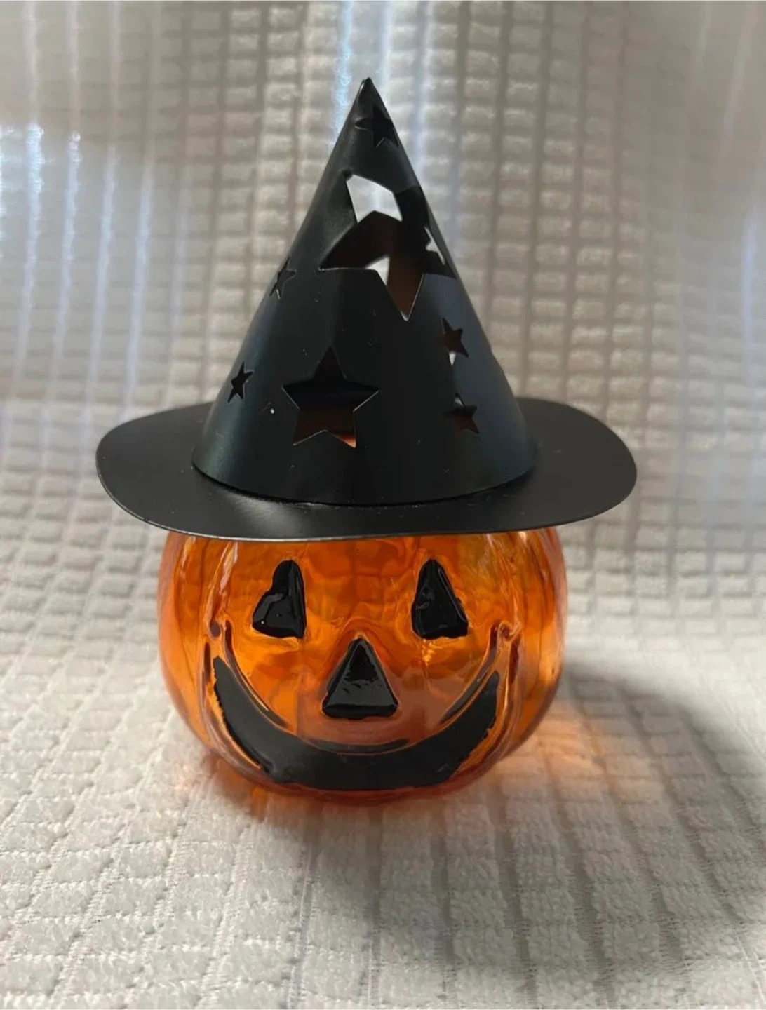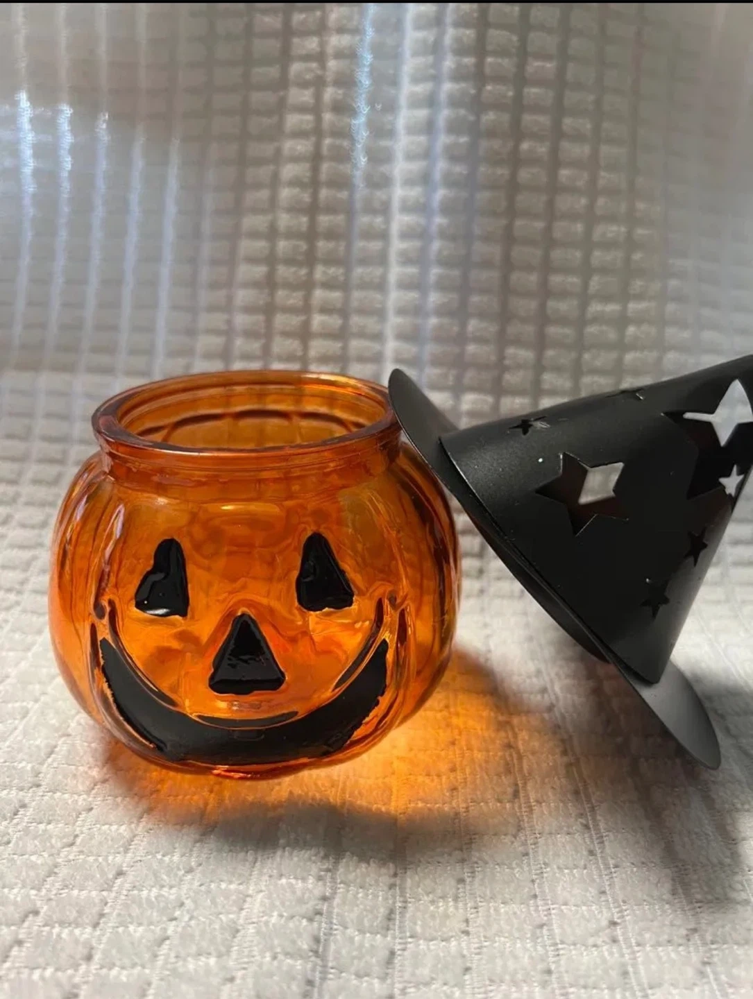 ハロウィン キャンドルポット×2個 サイズ 高さ ハット装着時 約15cm 幅 ハット装着時 約12cm 重さ 256g 素材 本体 ガラス製/ハット鉄製 キャンドルポットとして購入したのですが そのままオブジェとして飾ってました 下からライティングするのもあり