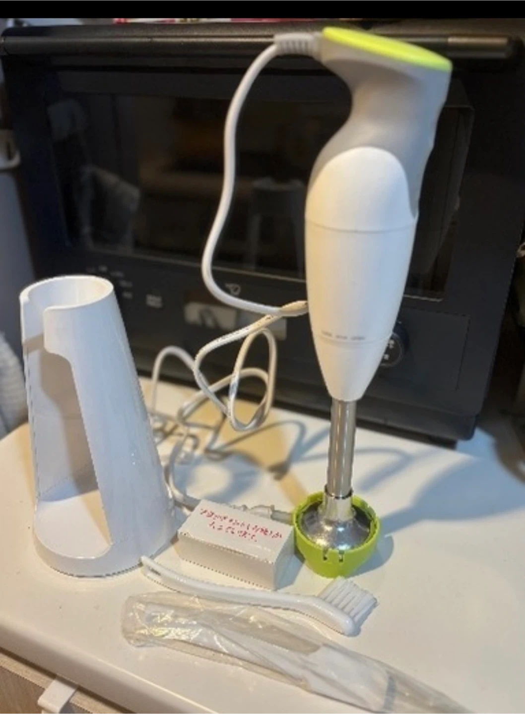 ハンドブレンダーです 【付属品】 スタンド、ブラシ 離乳食用に購入したものの、使用しませんでした。 写真にあるアタッチメントやブラシ等付属品は新品未使用未開封です。本体のみ開封しました。 使ってくださる方にお譲りします。 詳しくは公式サイトをご覧ください。 ※公式サイト価格17600円、 1. スロースタート機能搭載  食材が飛び散らないように、スイッチを押して、すぐに回転速度が最速にならず徐々にスピードがあがる機能を搭載しています。 2. お手入れカンタン  シャフト内部の回転軸を取り外せることにより、お手入れが「簡単に」「楽に」出来るようになっています。 3. コンパクトで収納楽チン  スペースを取らないコンパクトな設計のスタンドで、収納時も場所をとりません。 また必要でしたら、箱からは出してしまいましたが、袋未開封の貝印ブレンダー用のカップ(楽天で見たら送料込みで3000円でした)も1000円でお付けします。